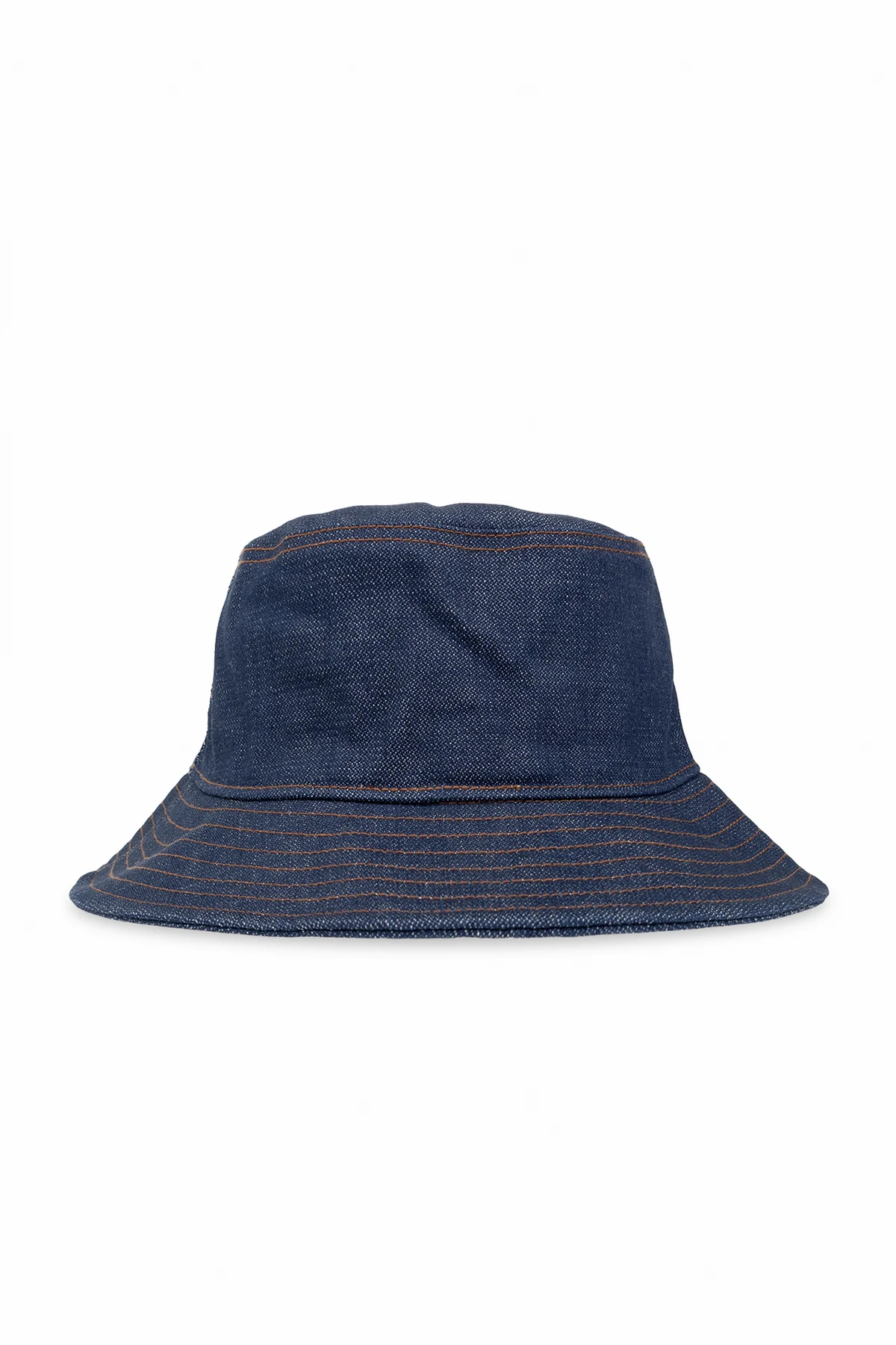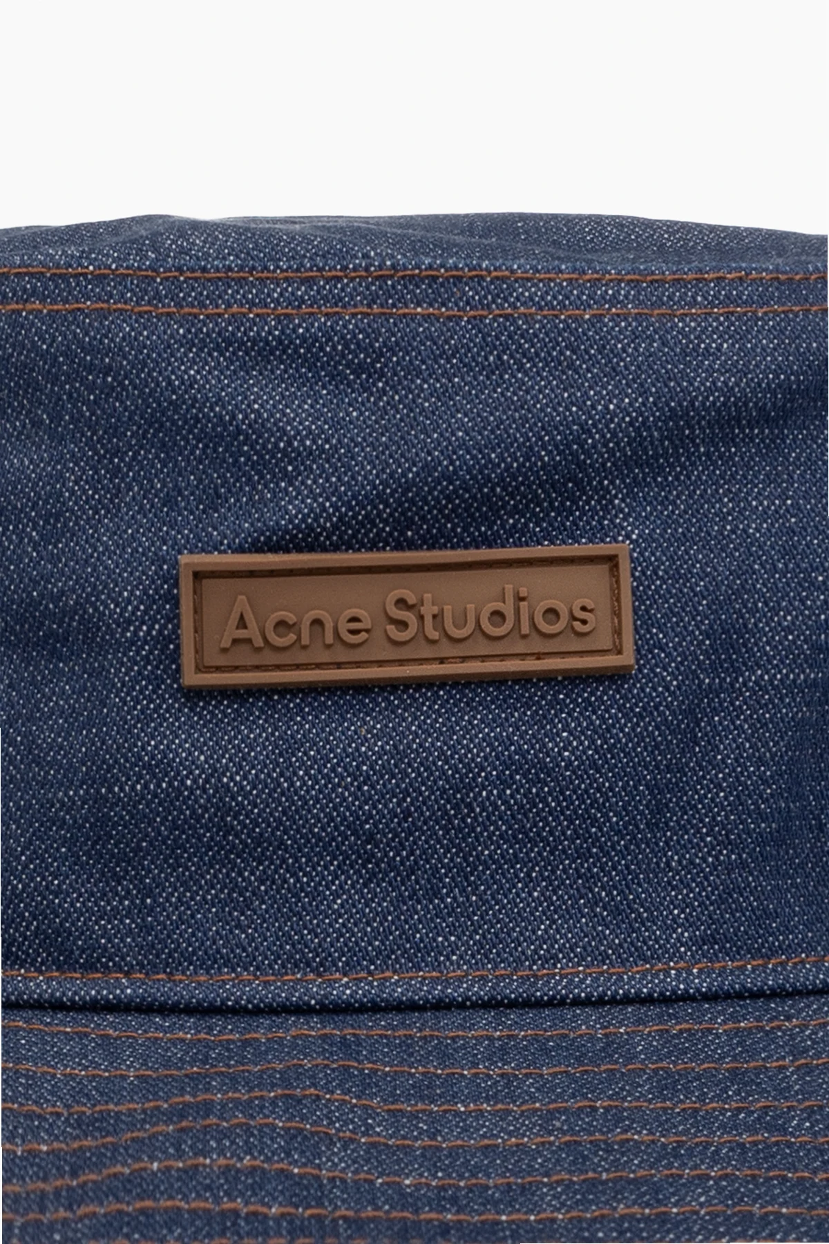 Navy denim bucket hat from Acne Studios. This item is decorated with a brown rubber logo patch and beige stitching.