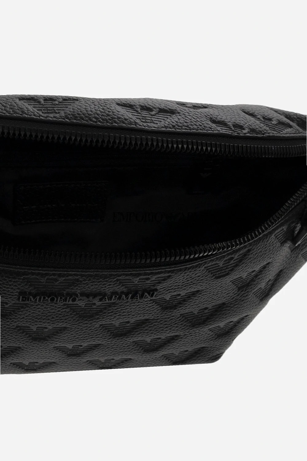 Black belt bag from Emporio Armani. Crafted from leather embossed with a monogram motif, this design fastens with a zipper and features a metal logo plaque on the front, a back zip pocket, an adjustable strap, black metal hardware and one internal compartment with one zip pocket and one slip pocket.