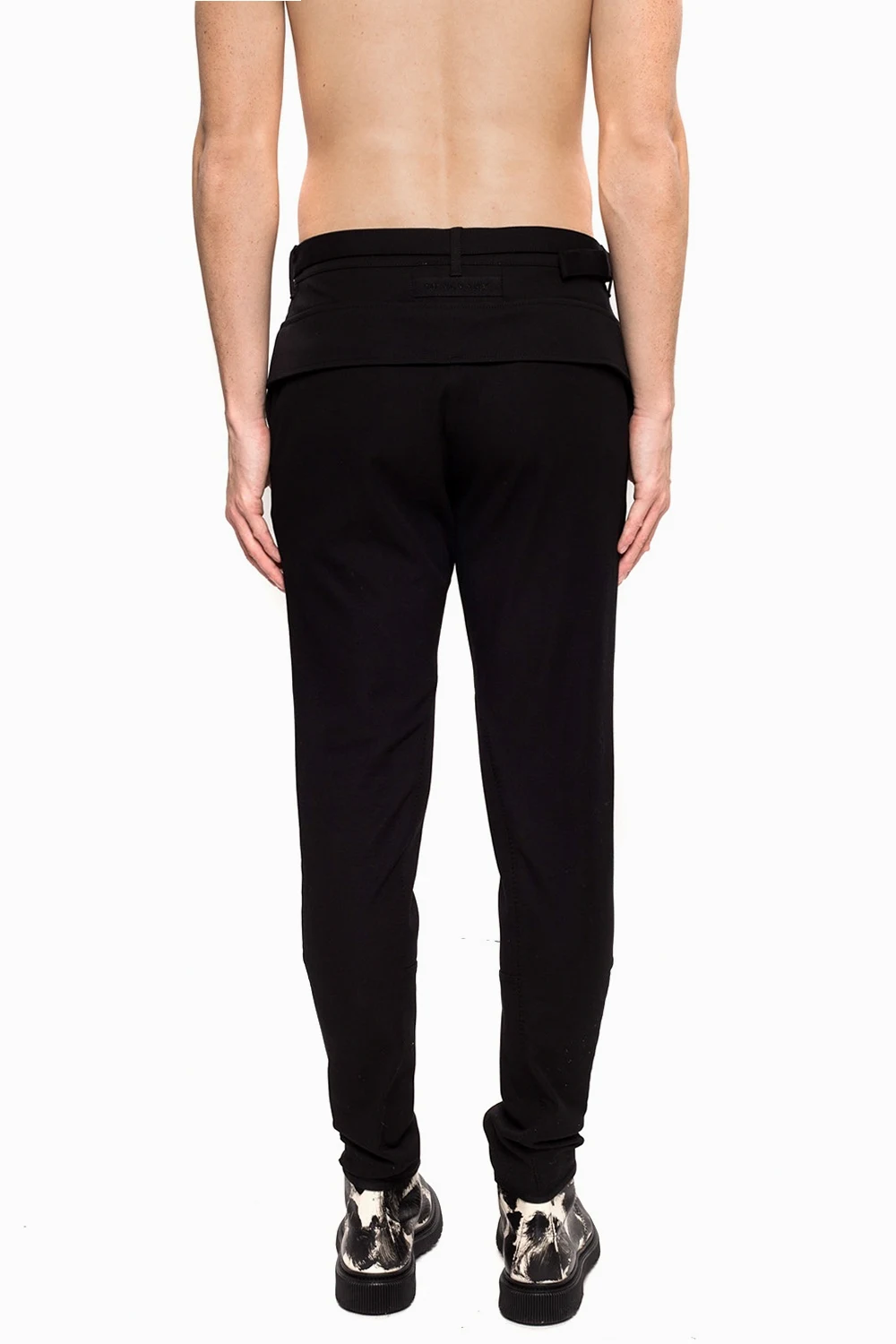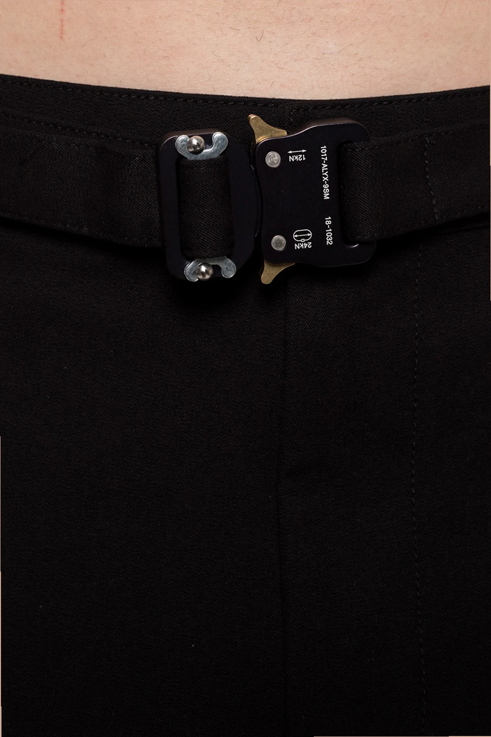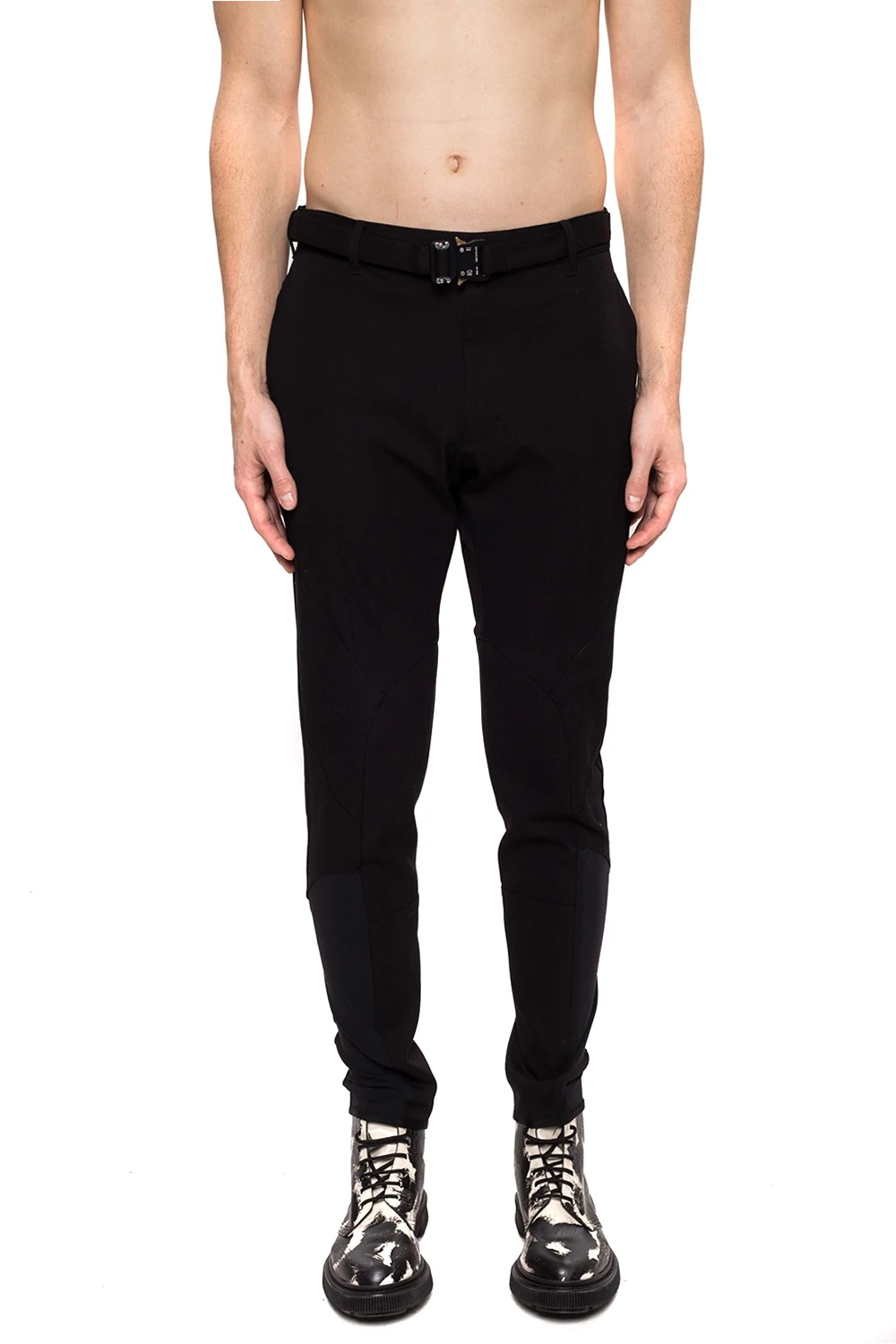 Black trousers from 1017 ALYX 9SM. Zip and hook-and-eye fastening. Comes with a belt featuring the brand’s signature buckle detail in black. Decorated with stitching details. Two slip pockets on the front, two flap pockets at the back. Tapered legs.