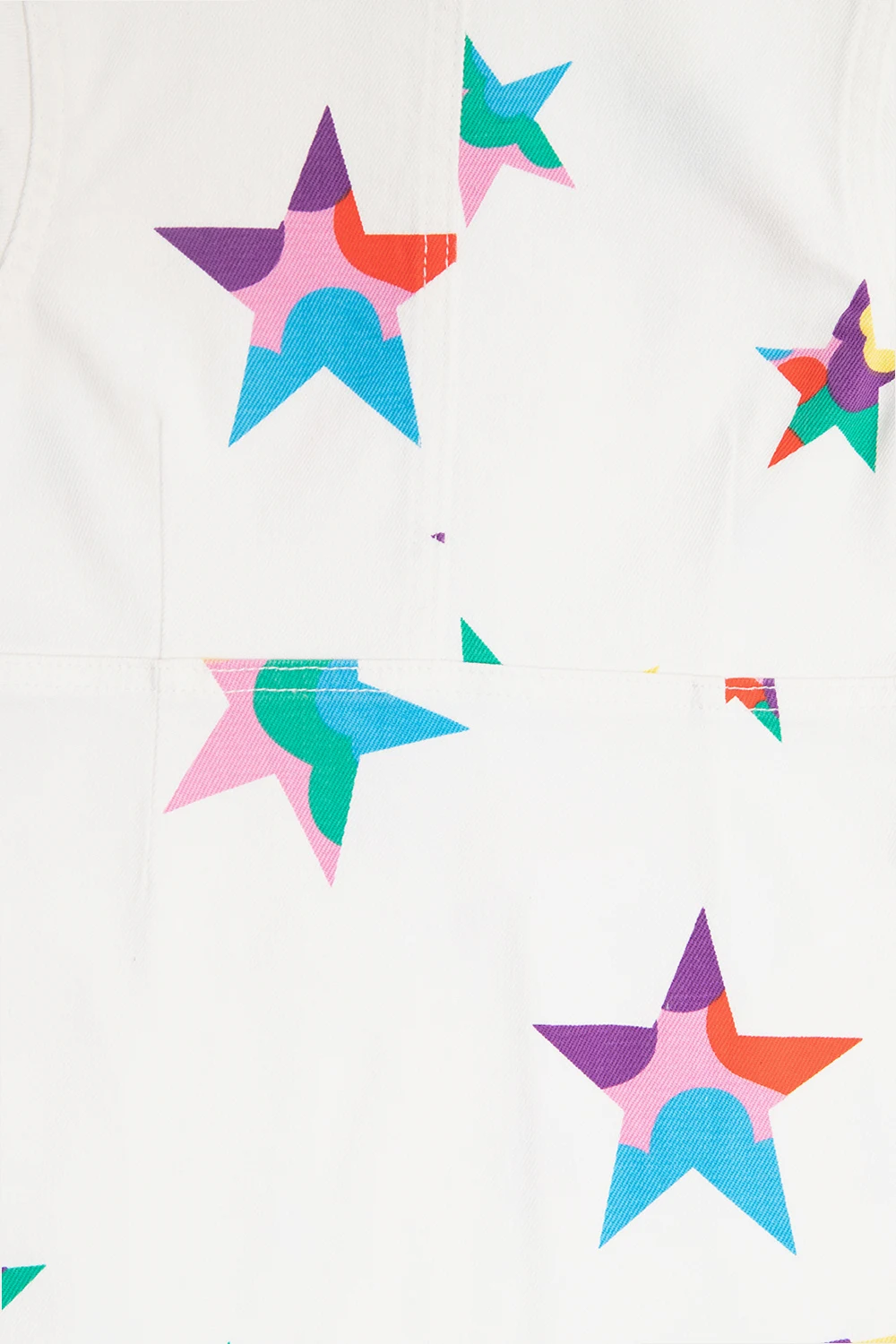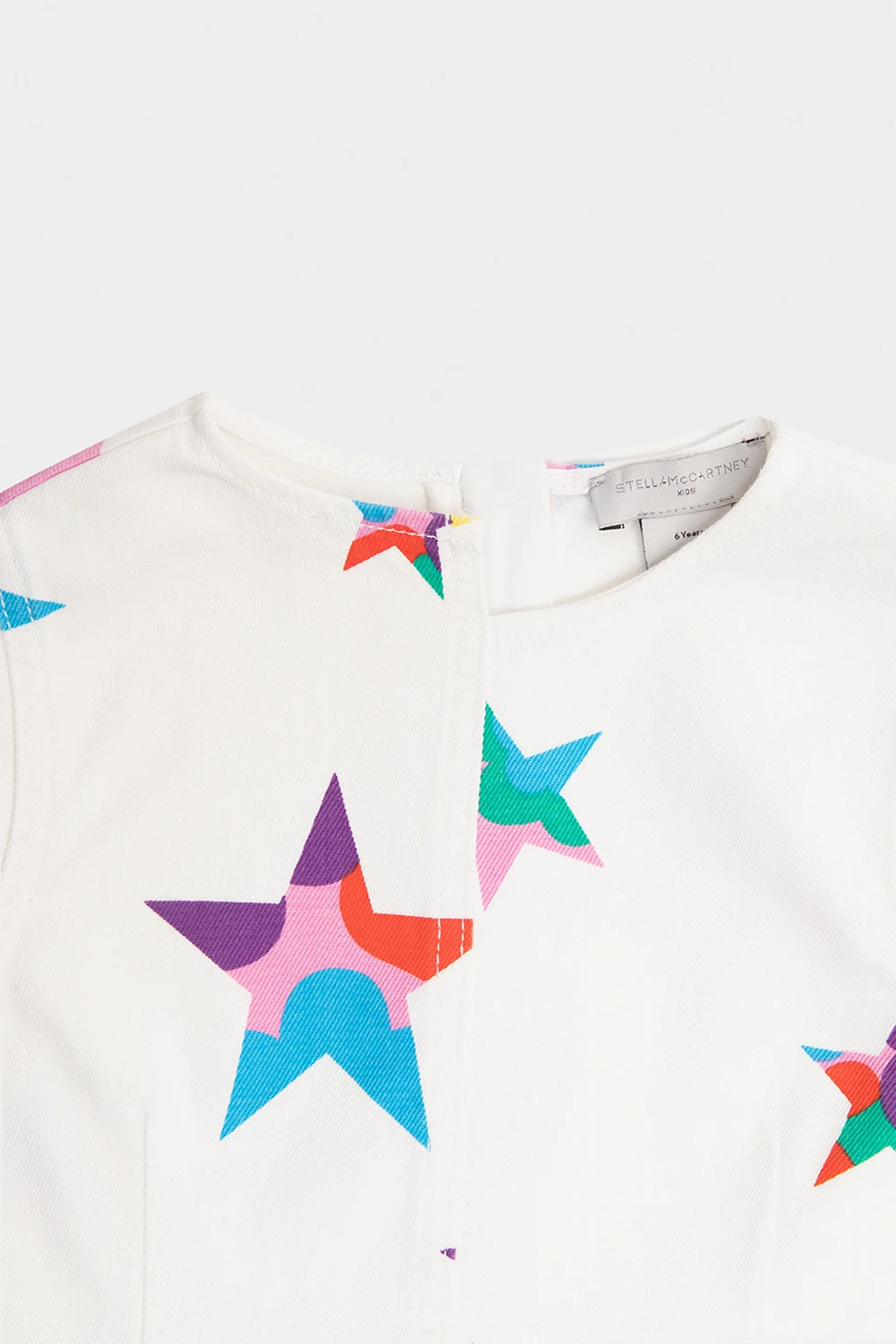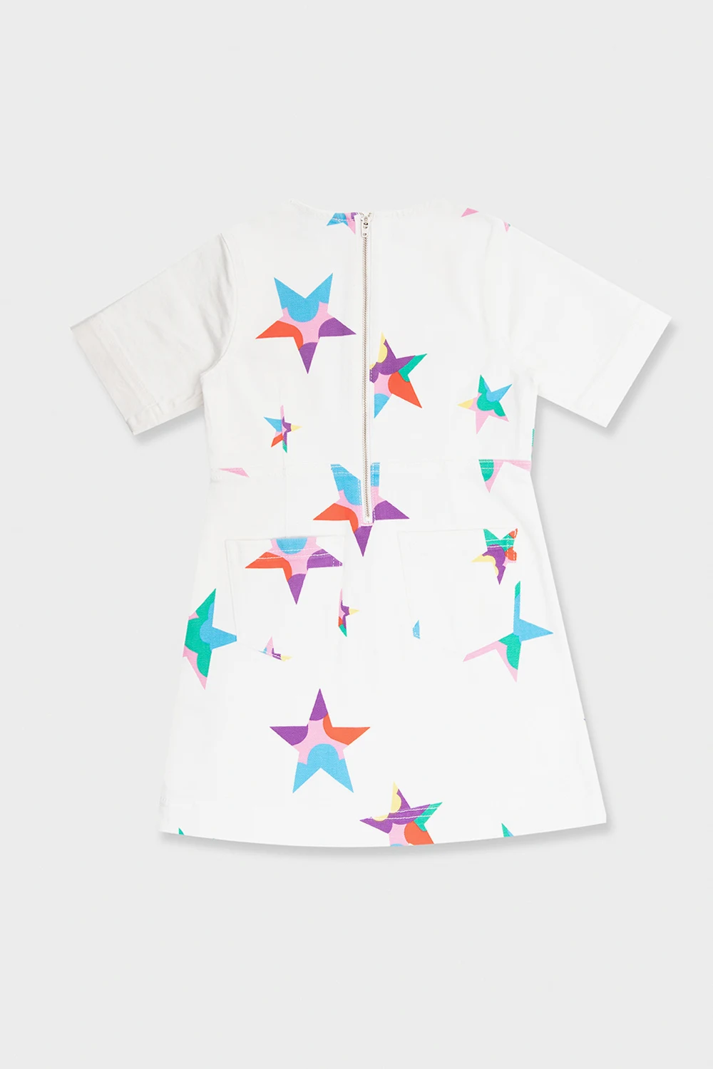 White dress from Stella McCartney Kids. Fastened with a back zip, this short sleeve design features a multicolored star pattern and two slip pockets.
