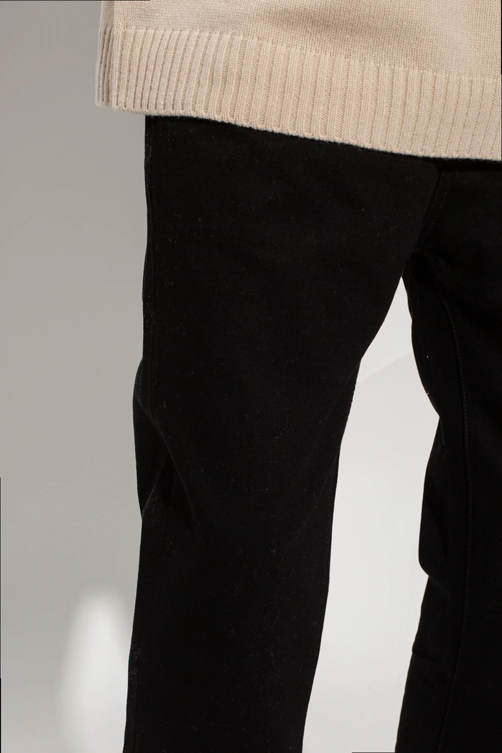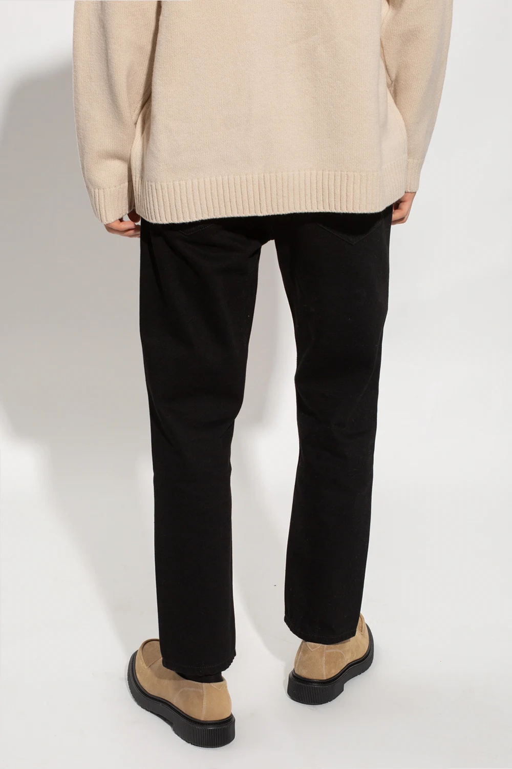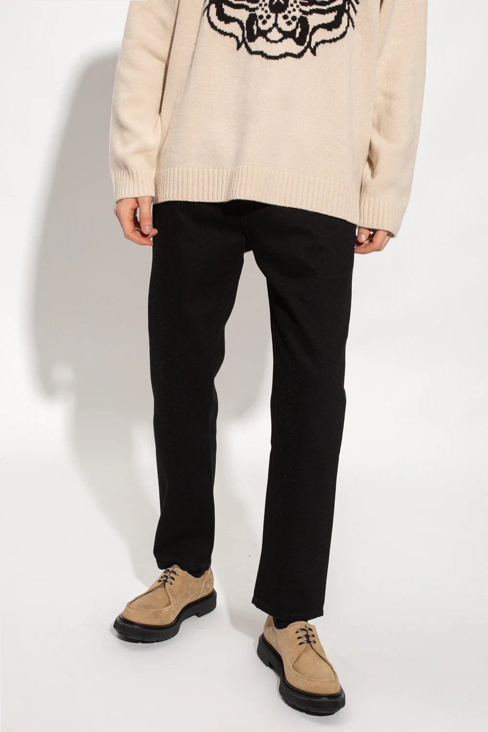 Black jeans from Kenzo. Crafted from organic cotton, this pair falls with cropped, tapered legs and features button fastenings, classic five pockets, dark grey logo embroidery on the front and a brown suede patch at the back.