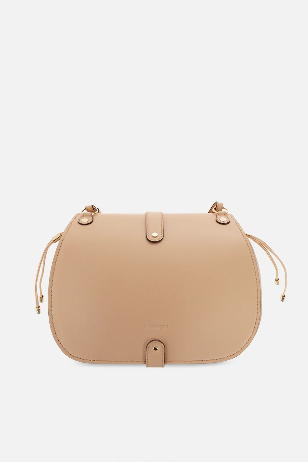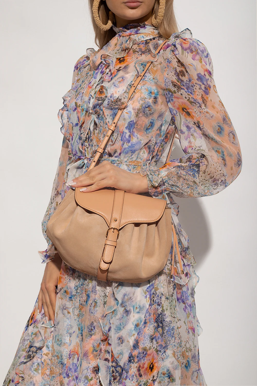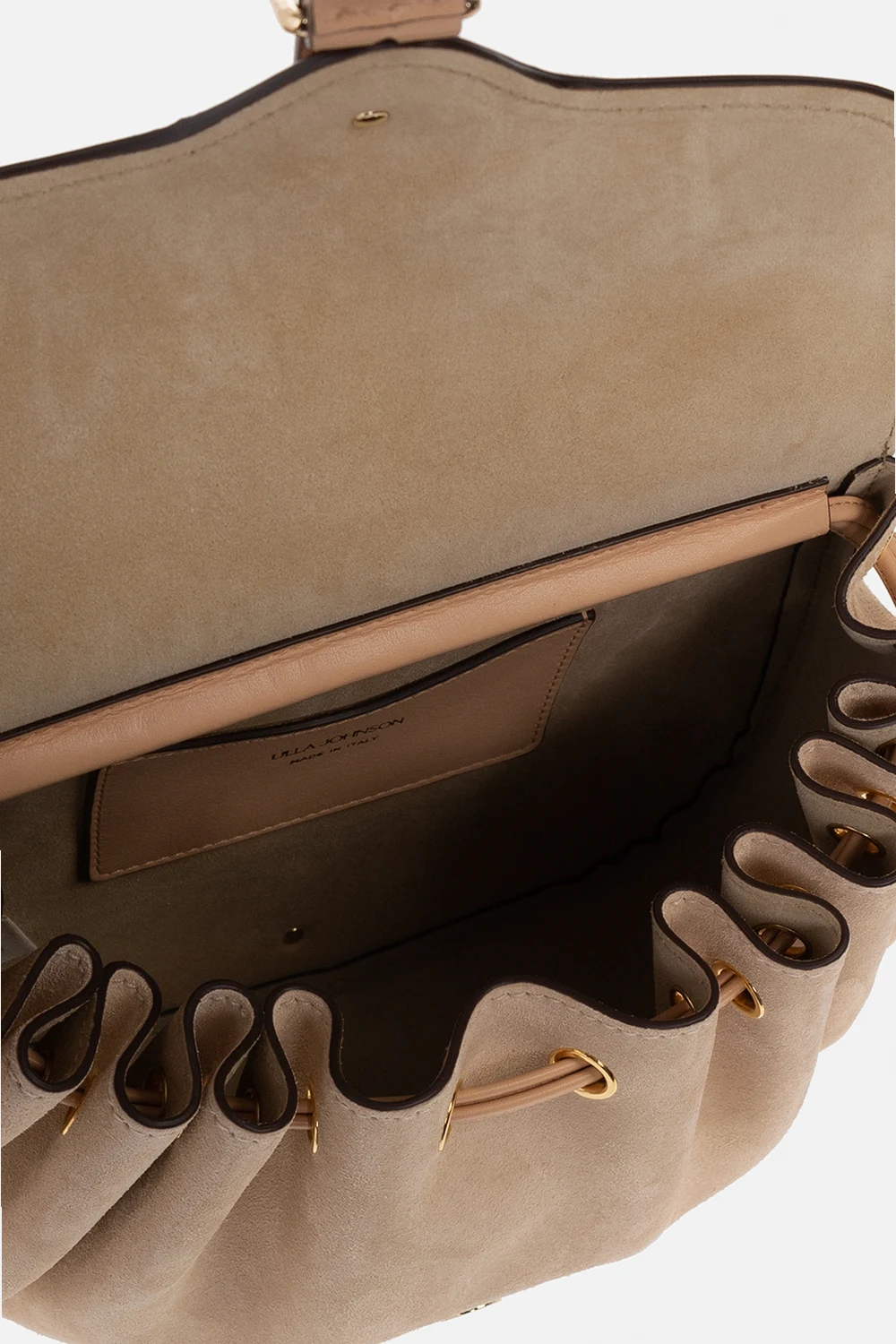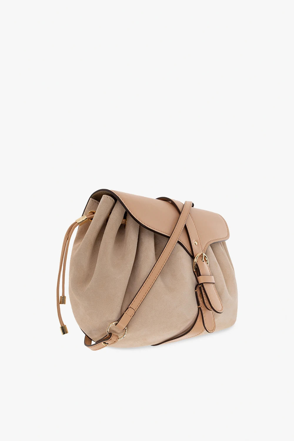 Beige and orange ‘Paloma’ shoulder bag from Ulla Johnson. Crafted from suede and leather, this design cinches closed with drawcords on the sides and features a snap fastening, an embossed logo at the back, an adjustable shoulder strap, gold-tone metal hardware and one internal compartment with a card slot.