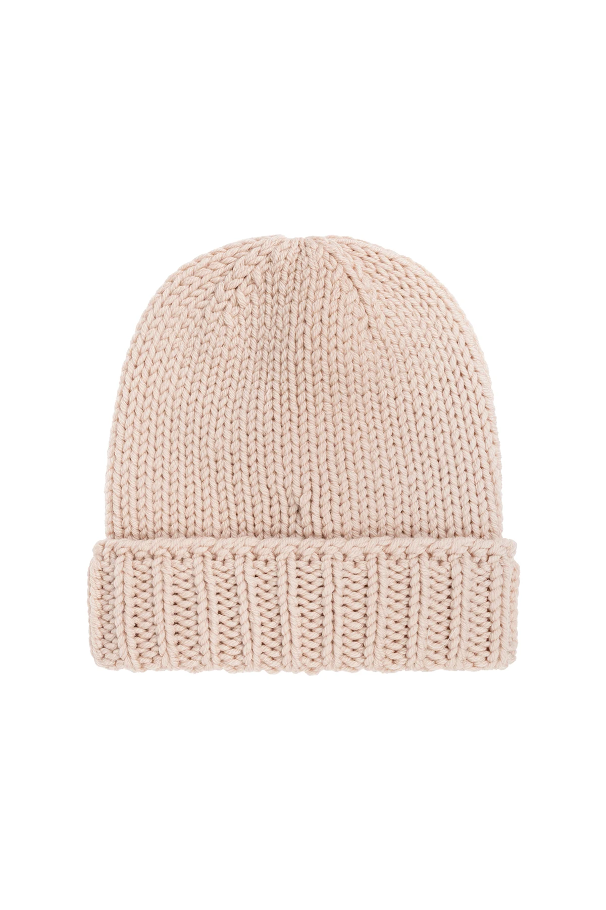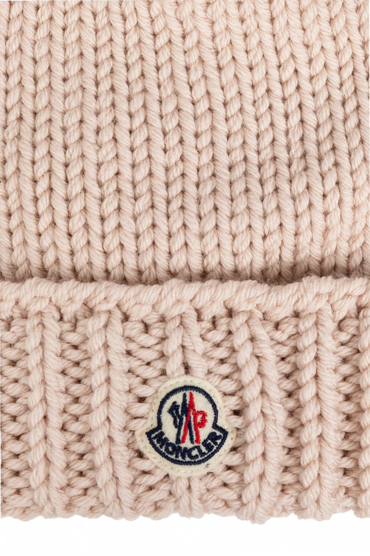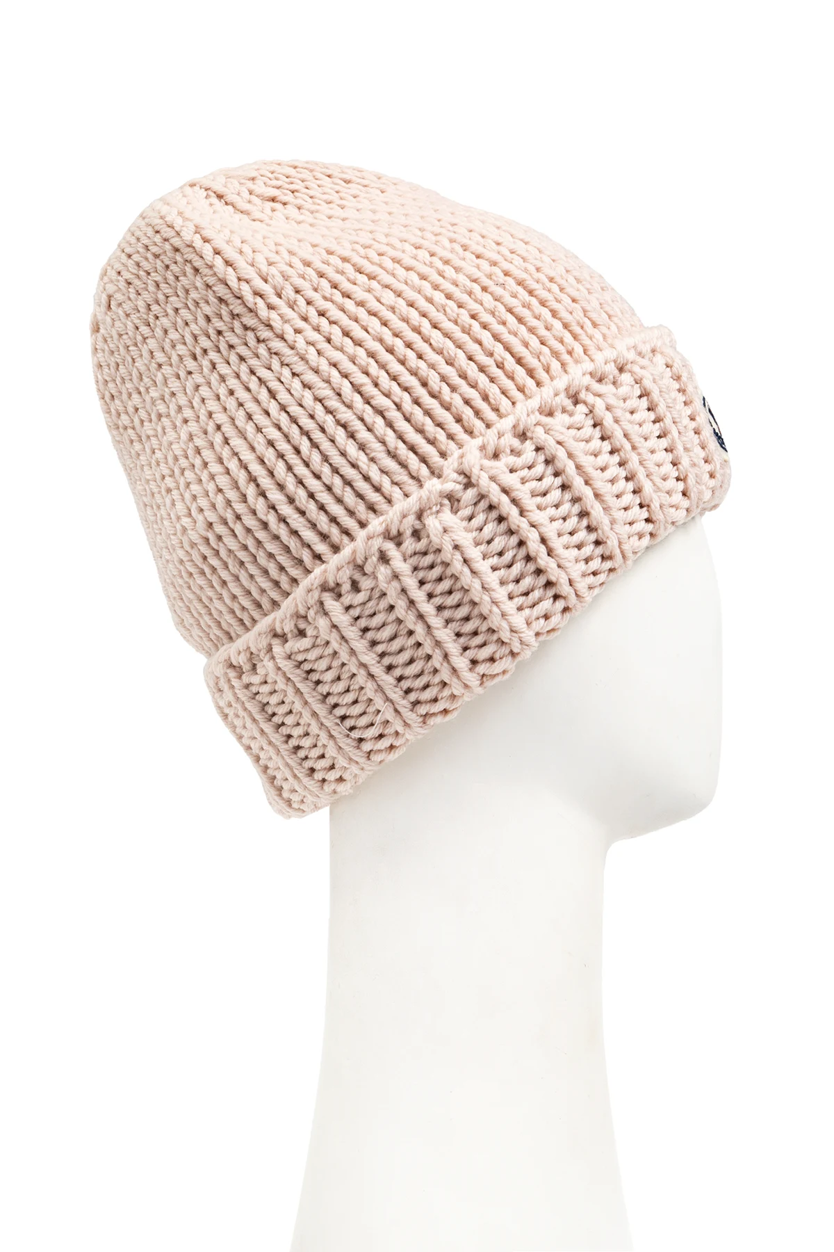 Sie zeichnet sich durch eine traditionelle Form mit abgerundeter Spitze und breitem, umgeschlagenem Rand aus. Die dominierende hellrosa Farbe verleiht ihr einen subtilen Charme und unterstreicht das minimalistische Aussehen. Auf dem umgeschlagenen Rand ist ein Aufnäher mit dem Logo des Herstellers zu sehen, der den Schriftzug "Moncler" und das charakteristische Emblem der Marke in den Farben Rot, Marineblau und Weiß zeigt.