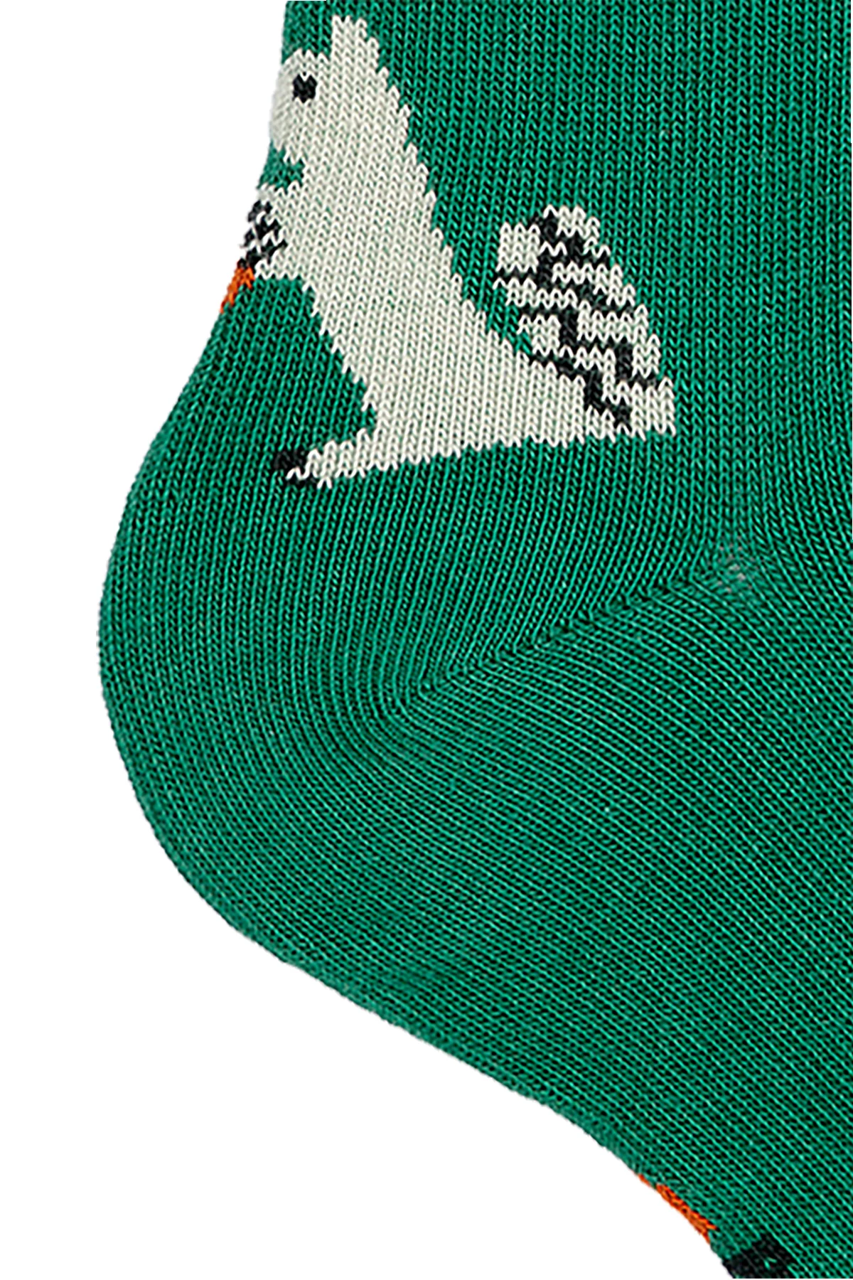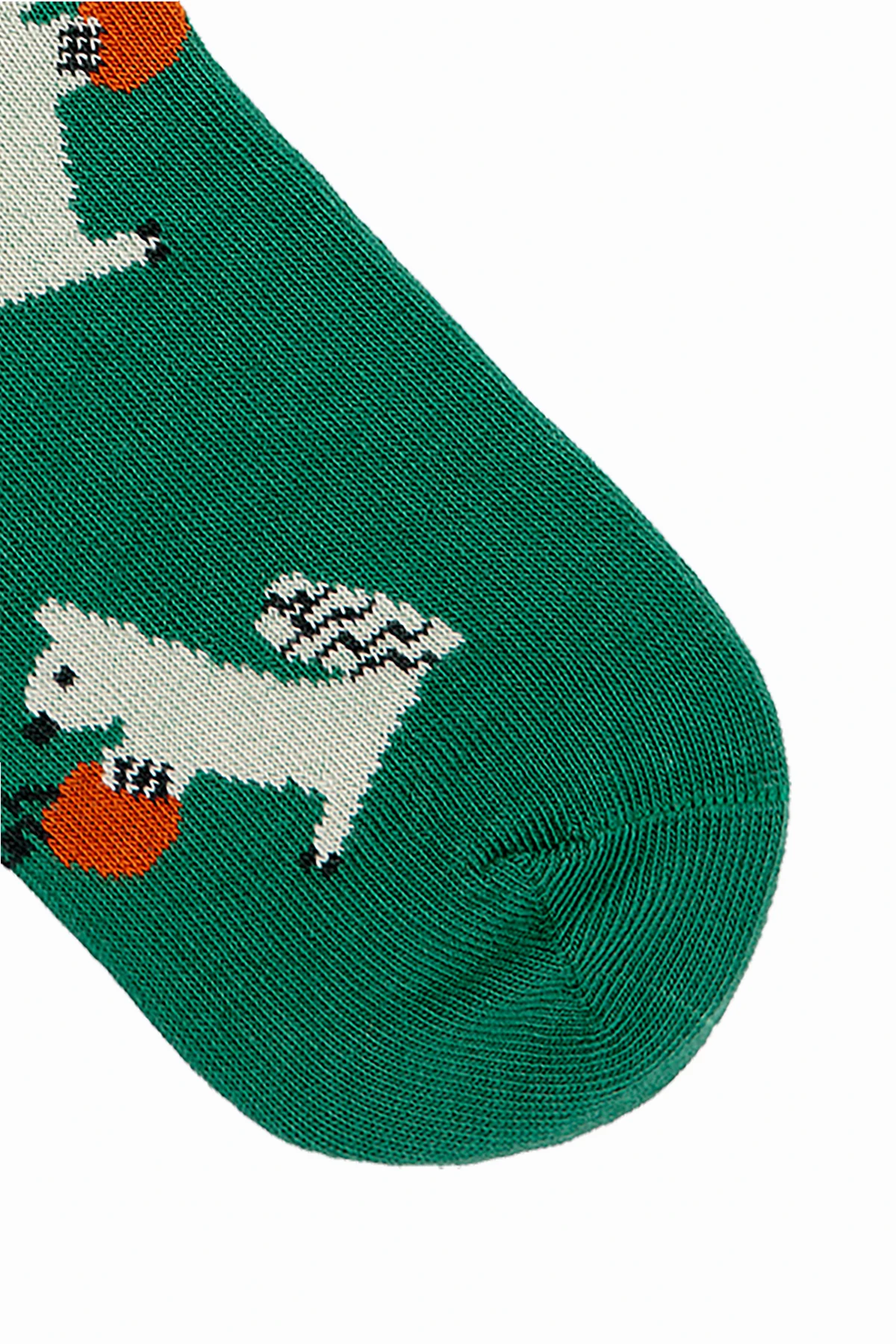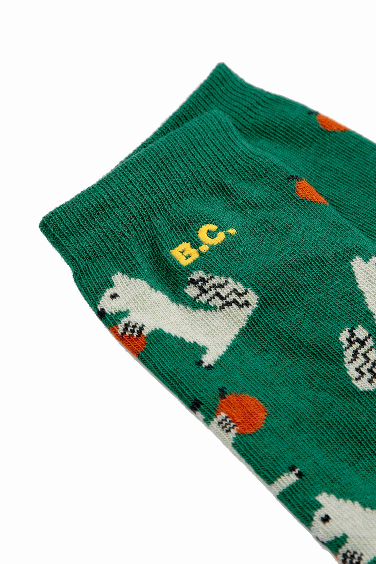 Das Strickmaterial, aus dem sie gefertigt sind, ist außergewöhnlich weich und elastisch. Die dominierende grüne Hintergrundfarbe harmoniert perfekt mit den weißen Eichhörnchen, die orange Eicheln halten, und schafft ein einzigartiges, verspieltes Muster. Am oberen Teil der Socken befindet sich der dezente, gelbe Schriftzug „B.C.“, die Initialen des Designers.