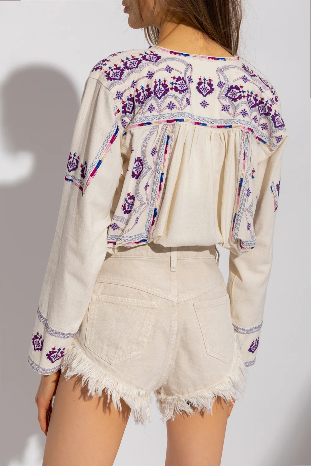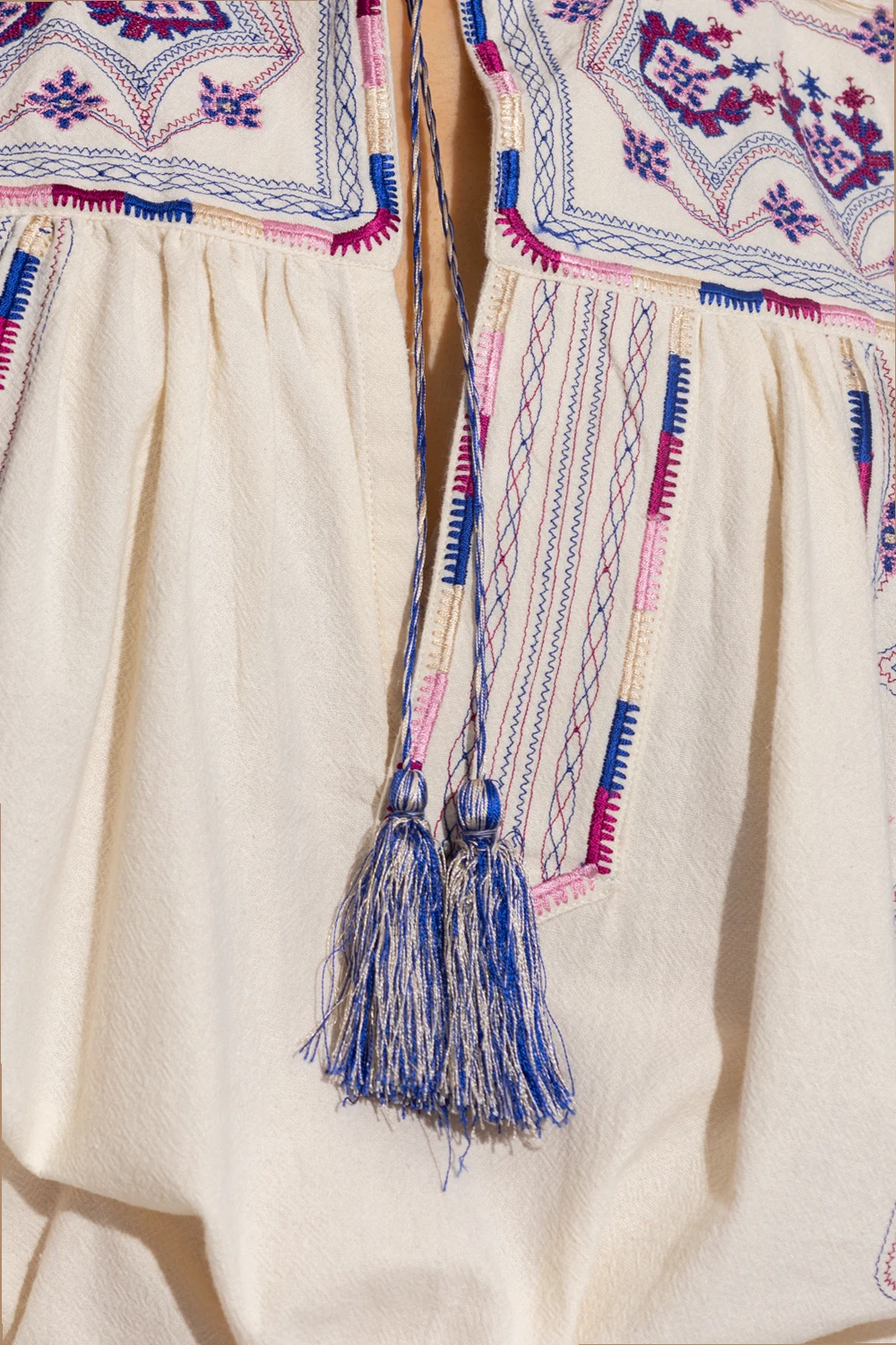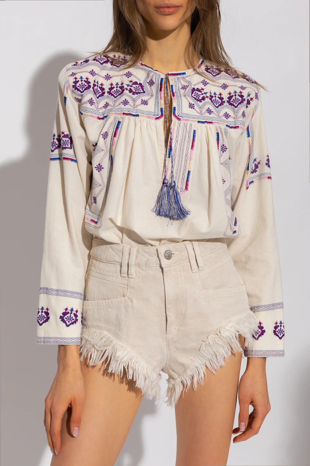 Cream ‘Treya’ embroidered top from Isabel Marant Étoile. Fastened with cream and navy drawstrings with tassels, this garment features a multicolored embroidered pattern, plunging V-neck and long sleeves with decorative cuffs.