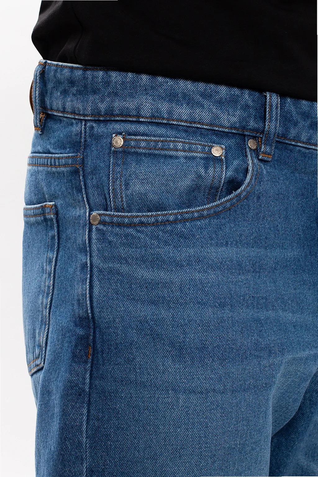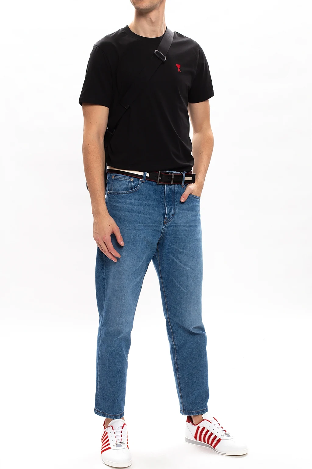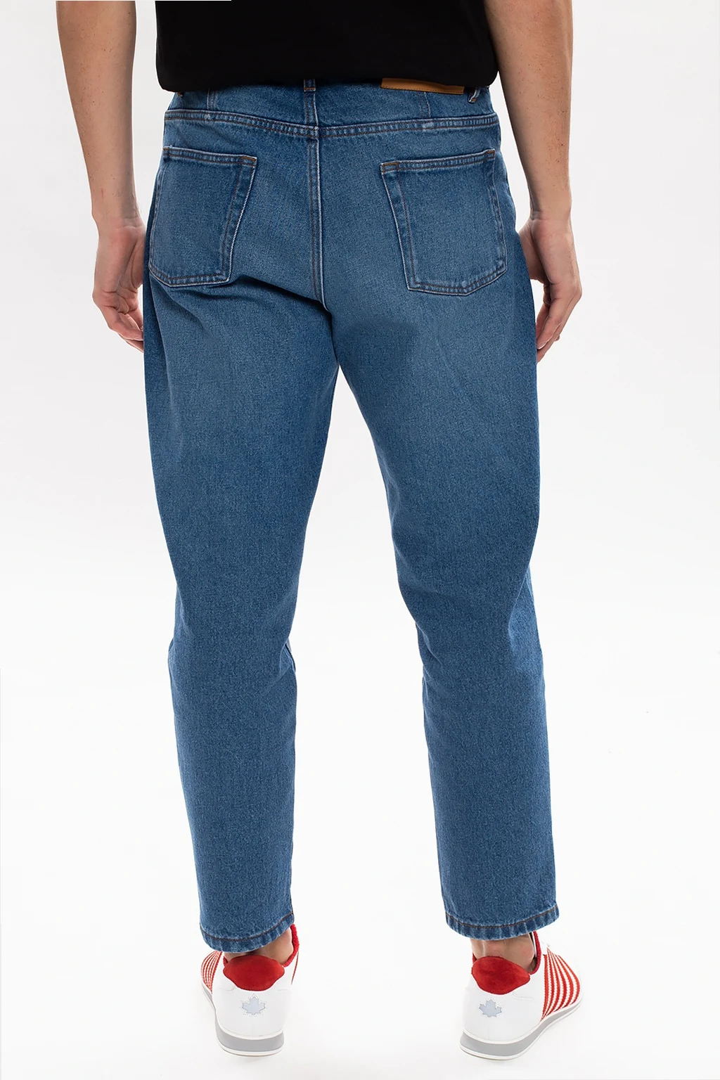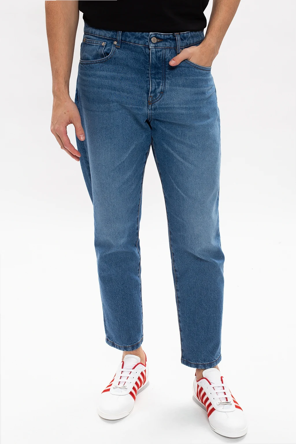 Blue jeans from Ami Alexandre Mattiussi. Crafted from distressed cotton denim with time-worn effects, this pair falls down with tapered legs and showcases a button fastening, classic five pockets, exposed orange top-stitching details and a brown branded patch.