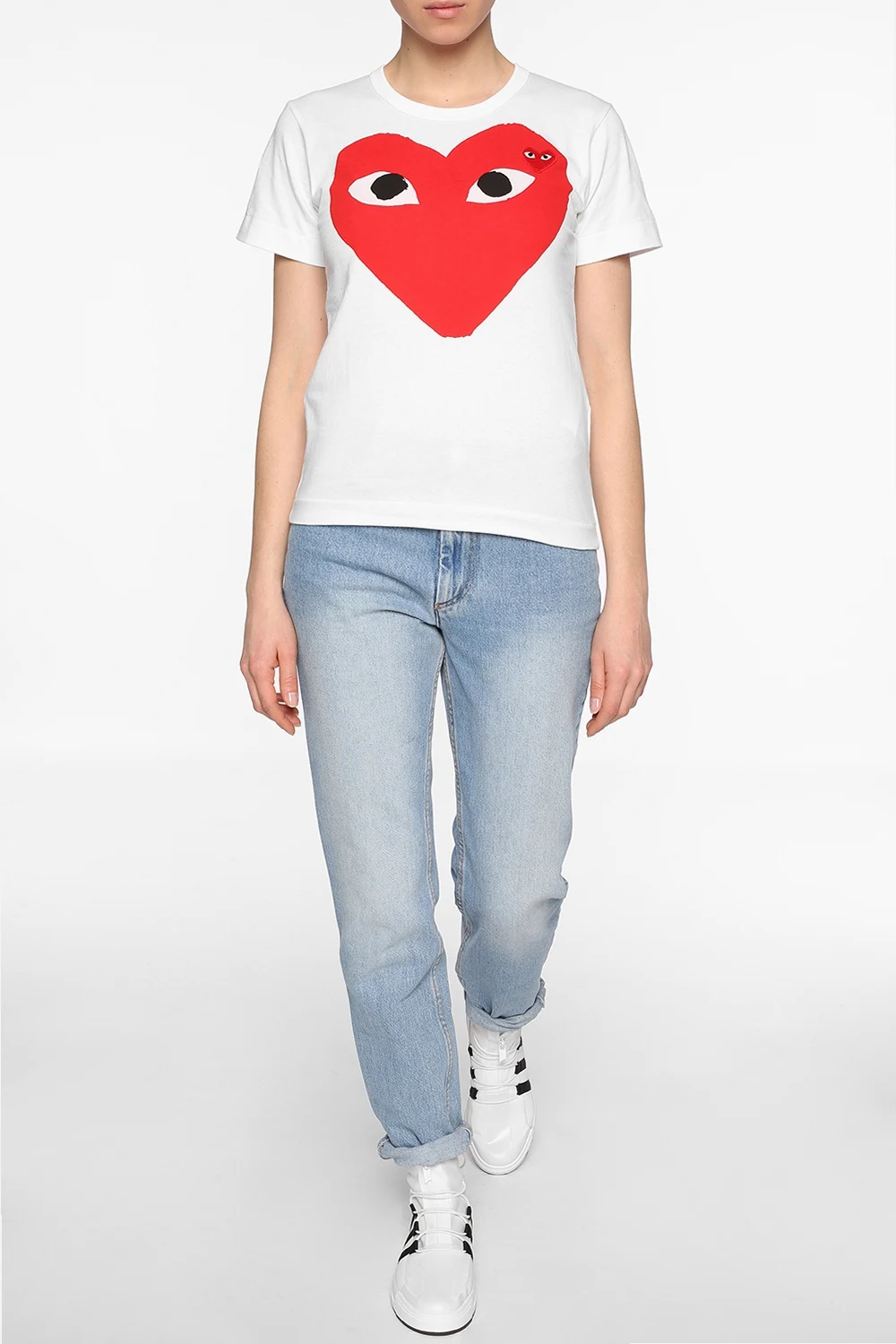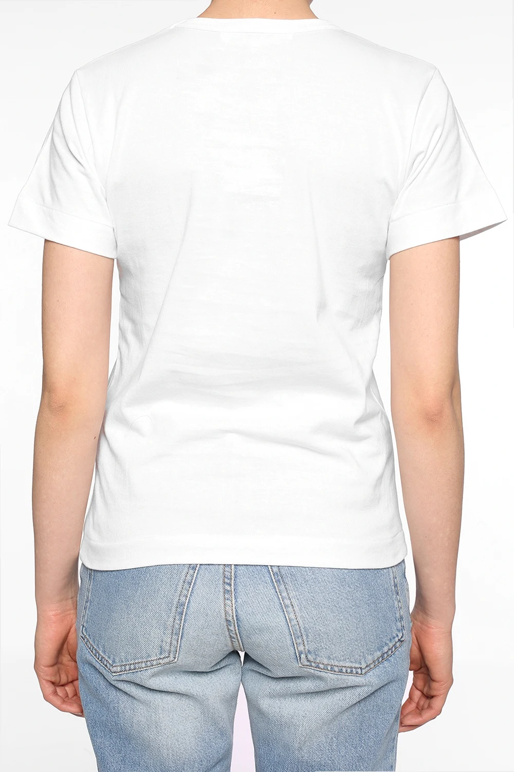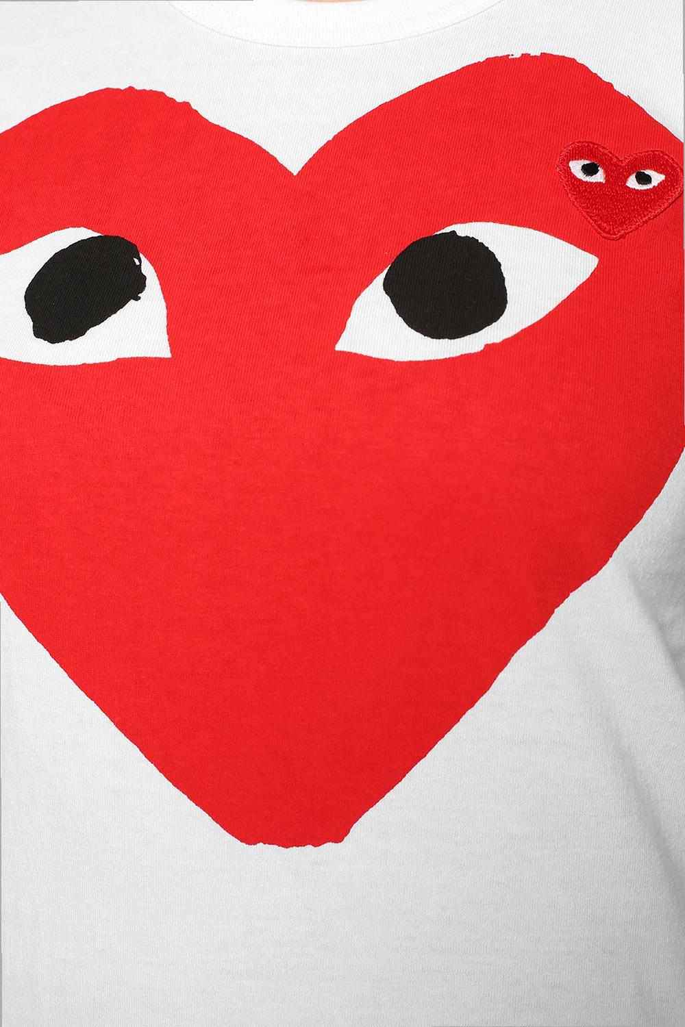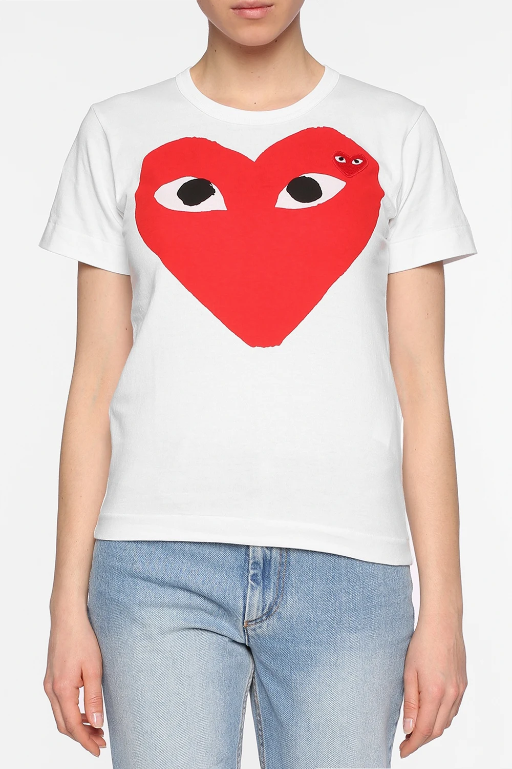 White cotton T-shirt from Comme des Garçons Play. Print and red, white and black heart-shaped logo patch on the front. Elasticated round neck.