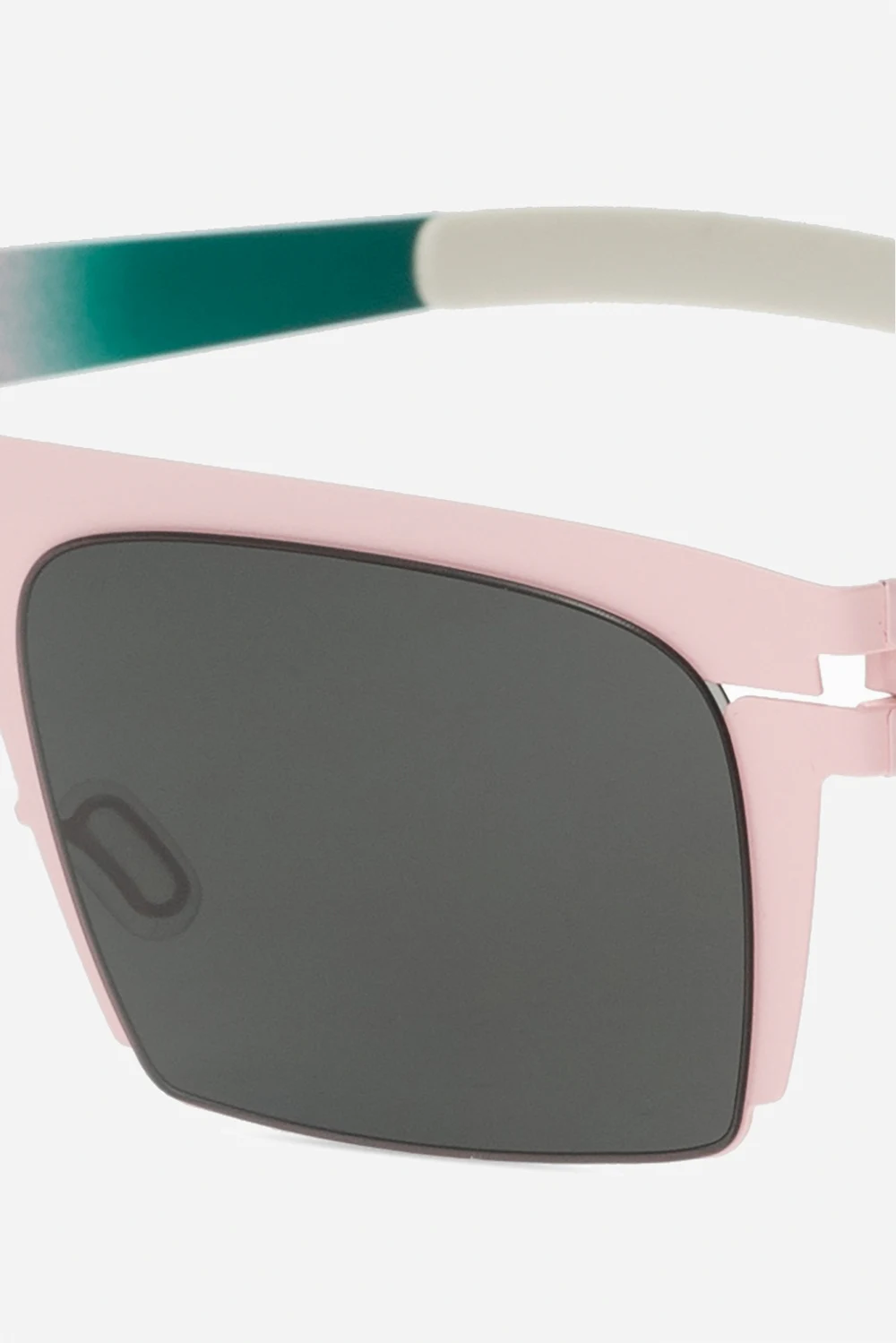 Light pink and green ‘New’ sunglasses from Mykita x Bernhard Willhelm. This handcrafted model features black lenses with 100% UVA and UVB protection.