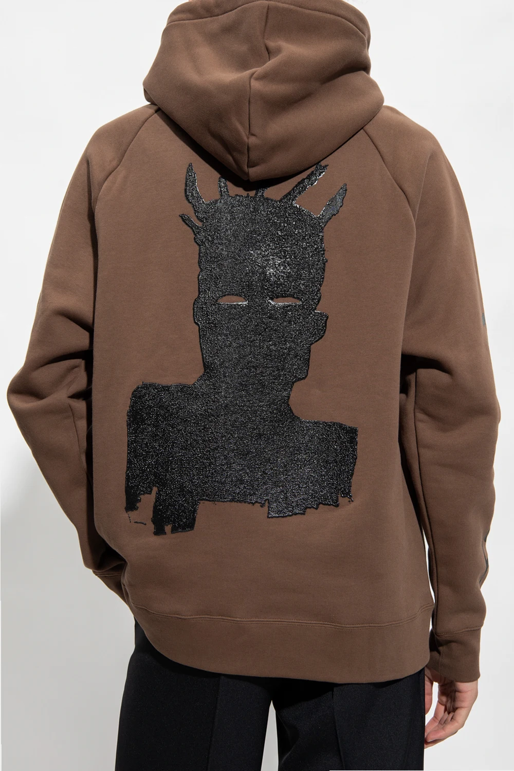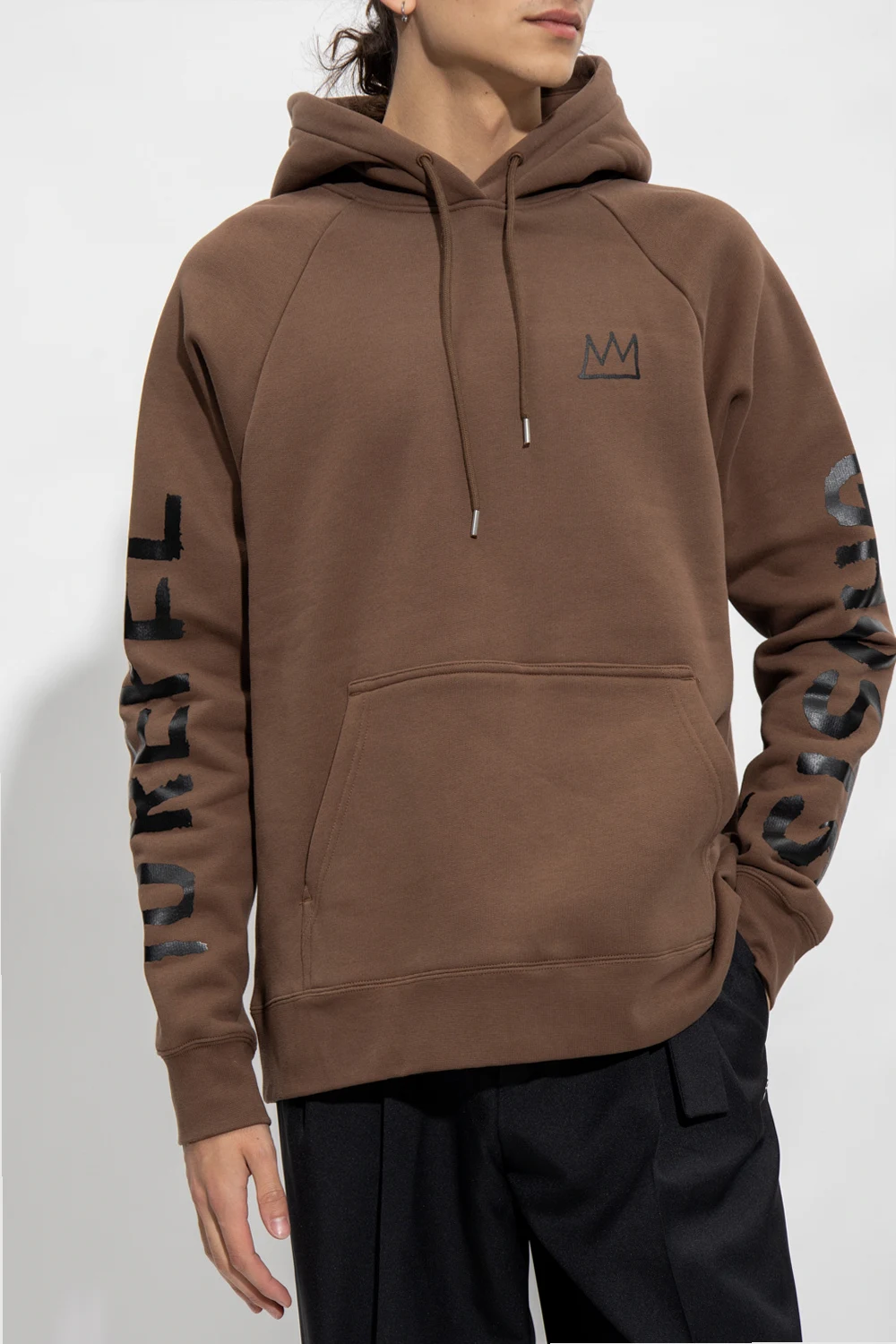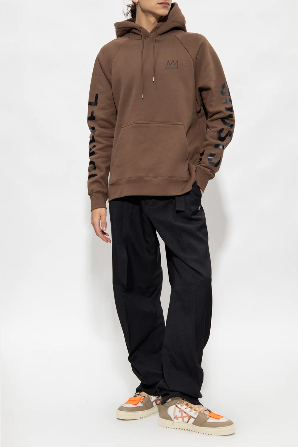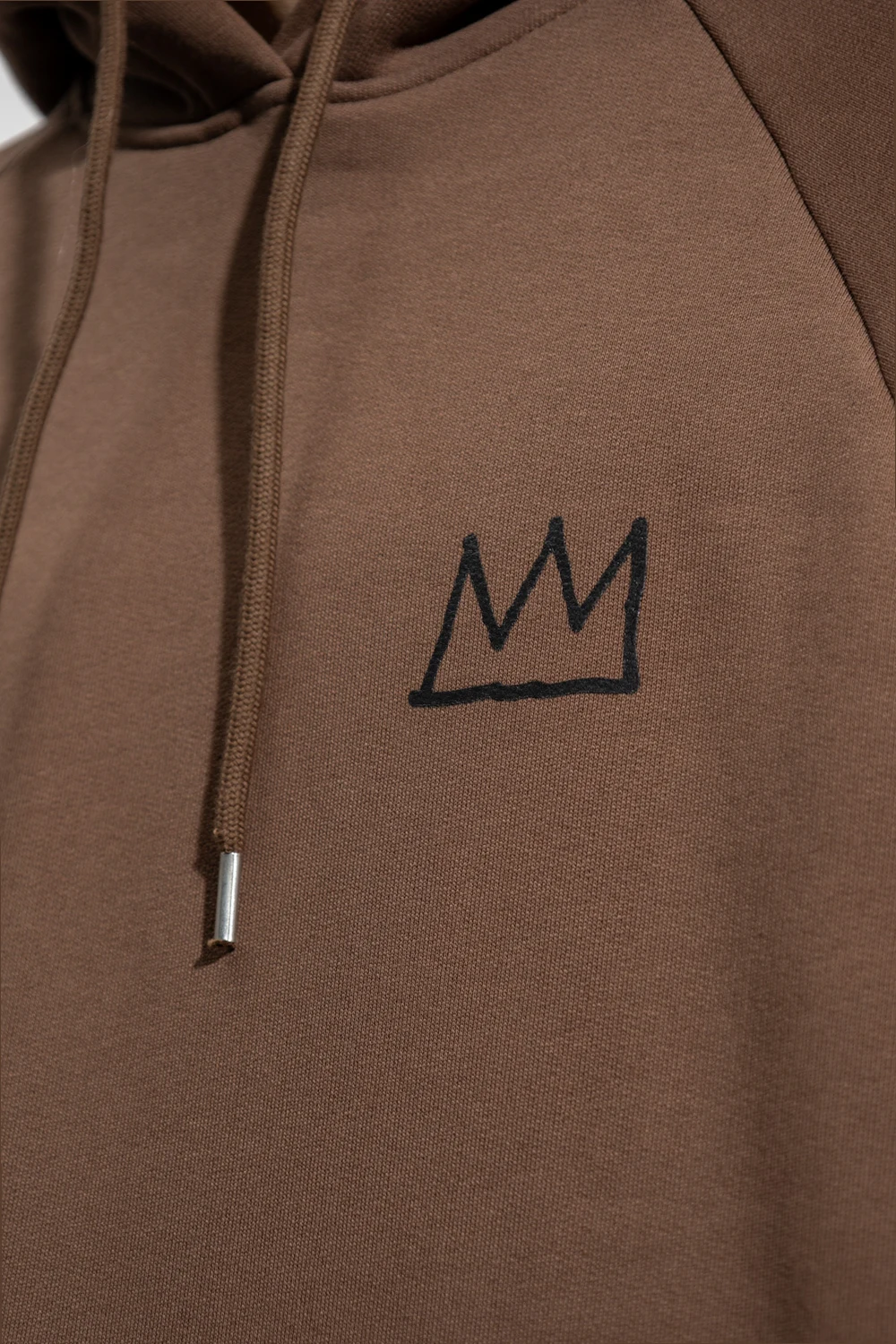 Brown sweatshirt with a drawcord-adjustable hood from Etudes. Crafted from bio cotton, this item showcases a graphic pattern accompanied by a logo, a kangaroo pocket and long sleeves. The collection was inspired by artist Jean-Michel Basquiat.