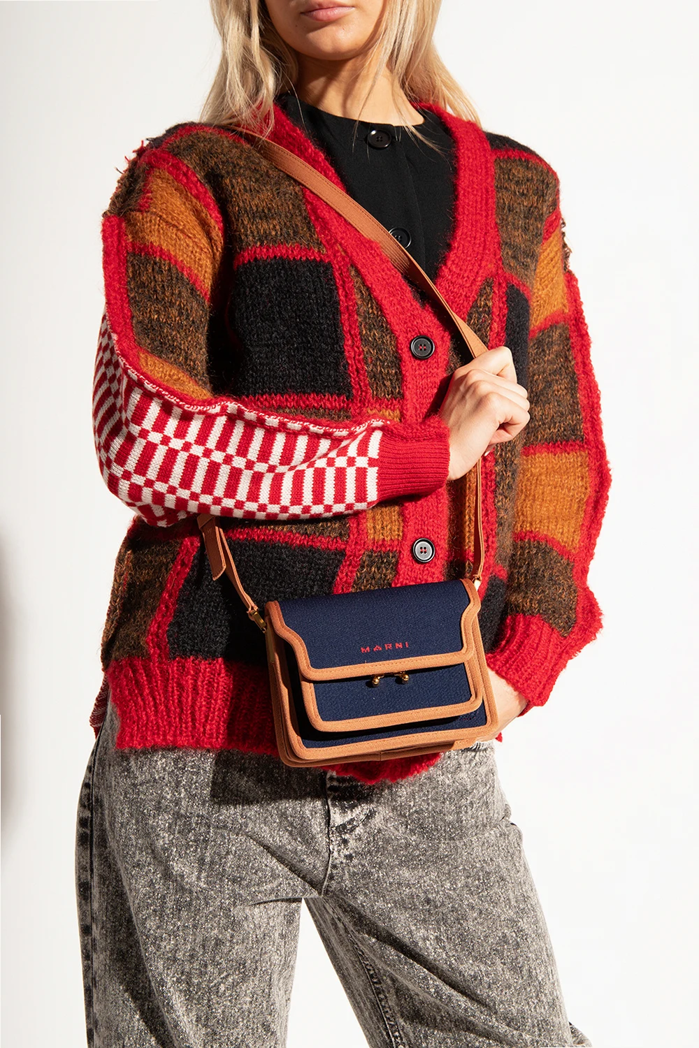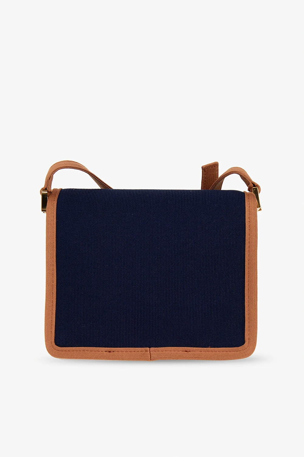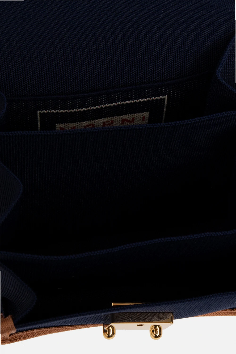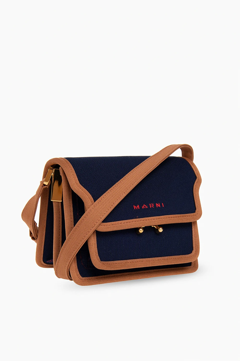 Navy and brown‘Trynk Soft’ shoulder bag from Marni. Fastened with a snap, this model features a red logo embroidery, adjustable shoulder strap, gold-tone metal hardware and three separate internal compartments with one slip pocket.