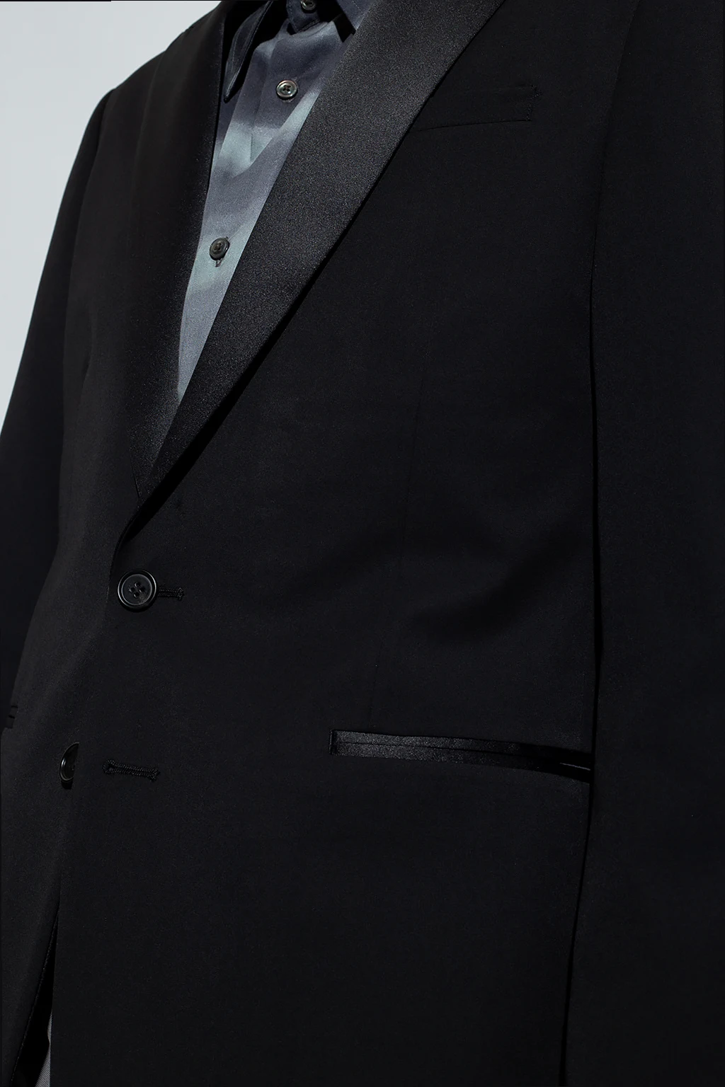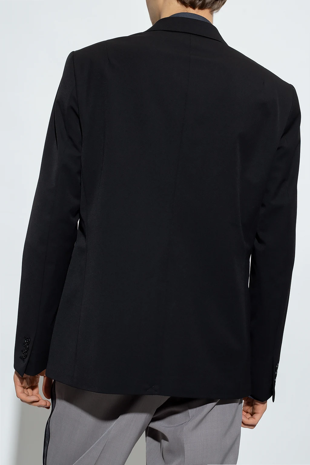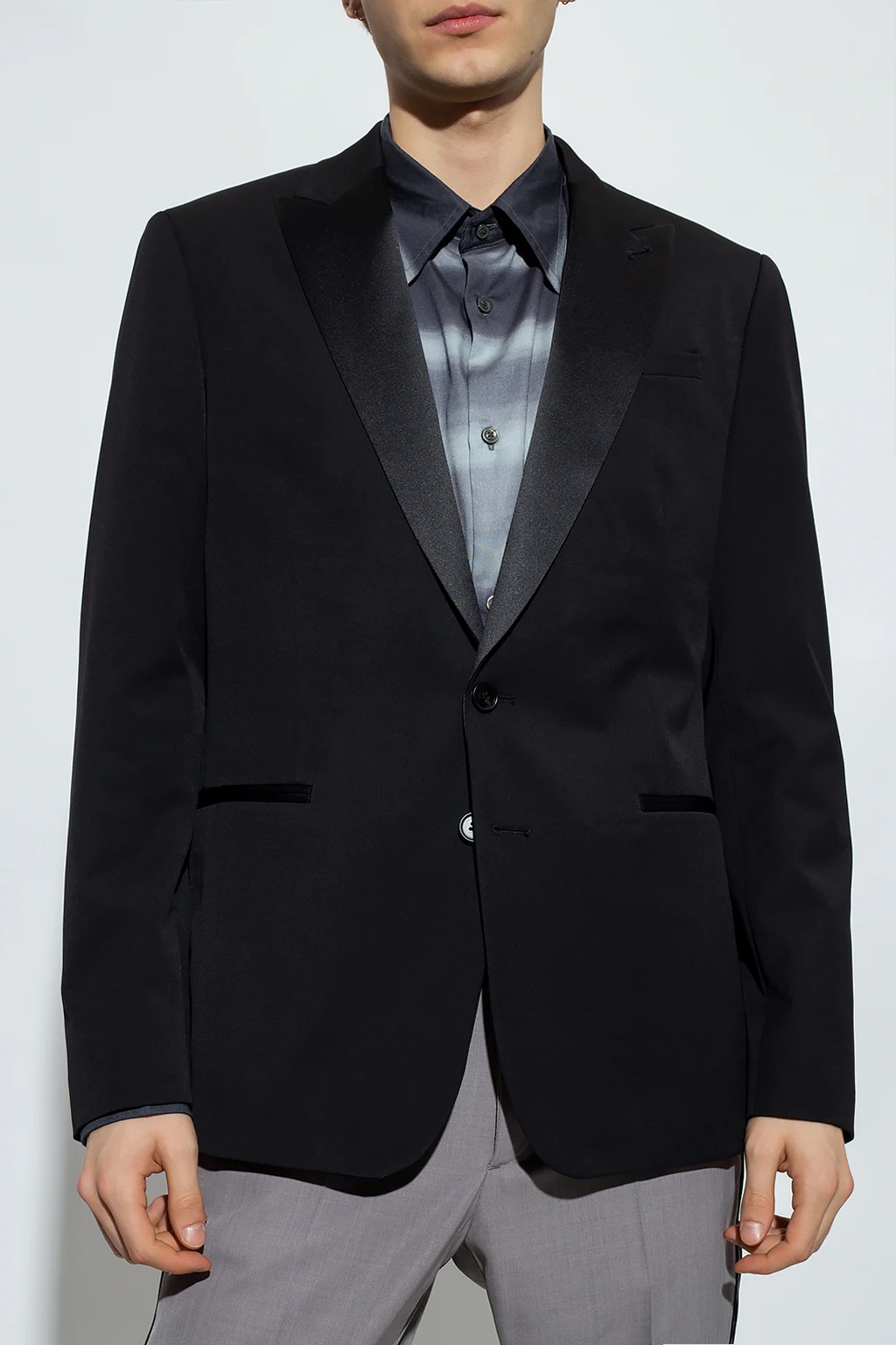 Black ‘Myk’ blazer from AllSaints. Fastened with buttons, this garment features three slip pockets, single rear vent, peak lapels and button cuffs.