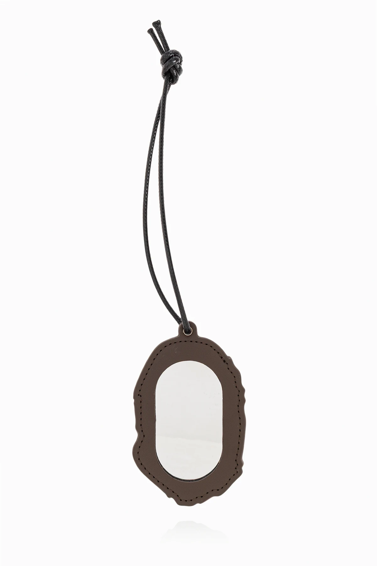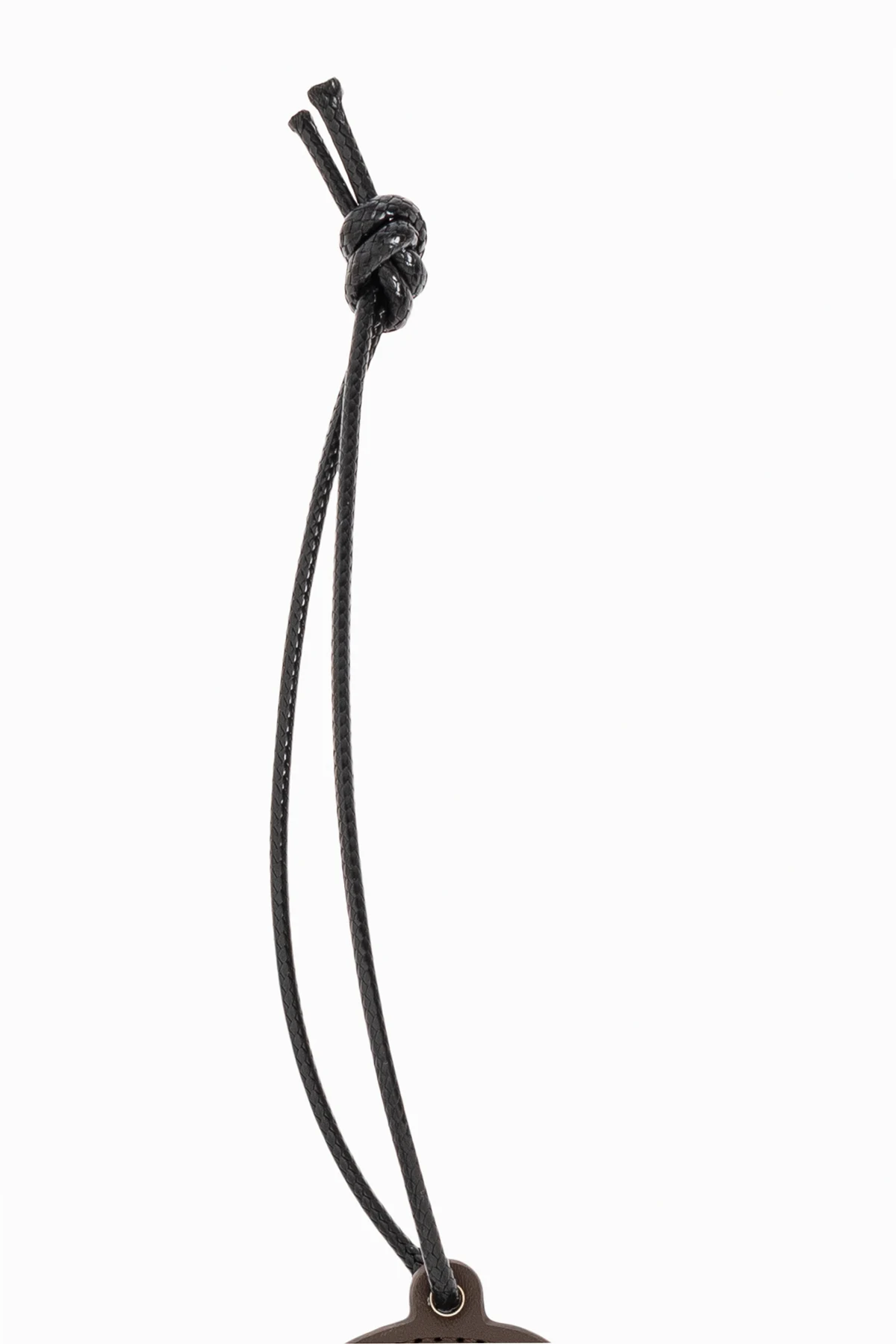 Der Anhänger, gehalten in einem eleganten braunen Farbton, ist mit einem markanten gelben Aufdruck des Affengesichts verziert. Auf der Rückseite des Anhängers befindet sich ein praktischer Spiegel, der seine Funktionalität erhöht. Das Ganze ist an einer schwarzen Kordel mit Knotenende aufgehängt, was eine einfache Befestigung ermöglicht und jedes Outfit stilvoll ergänzt.