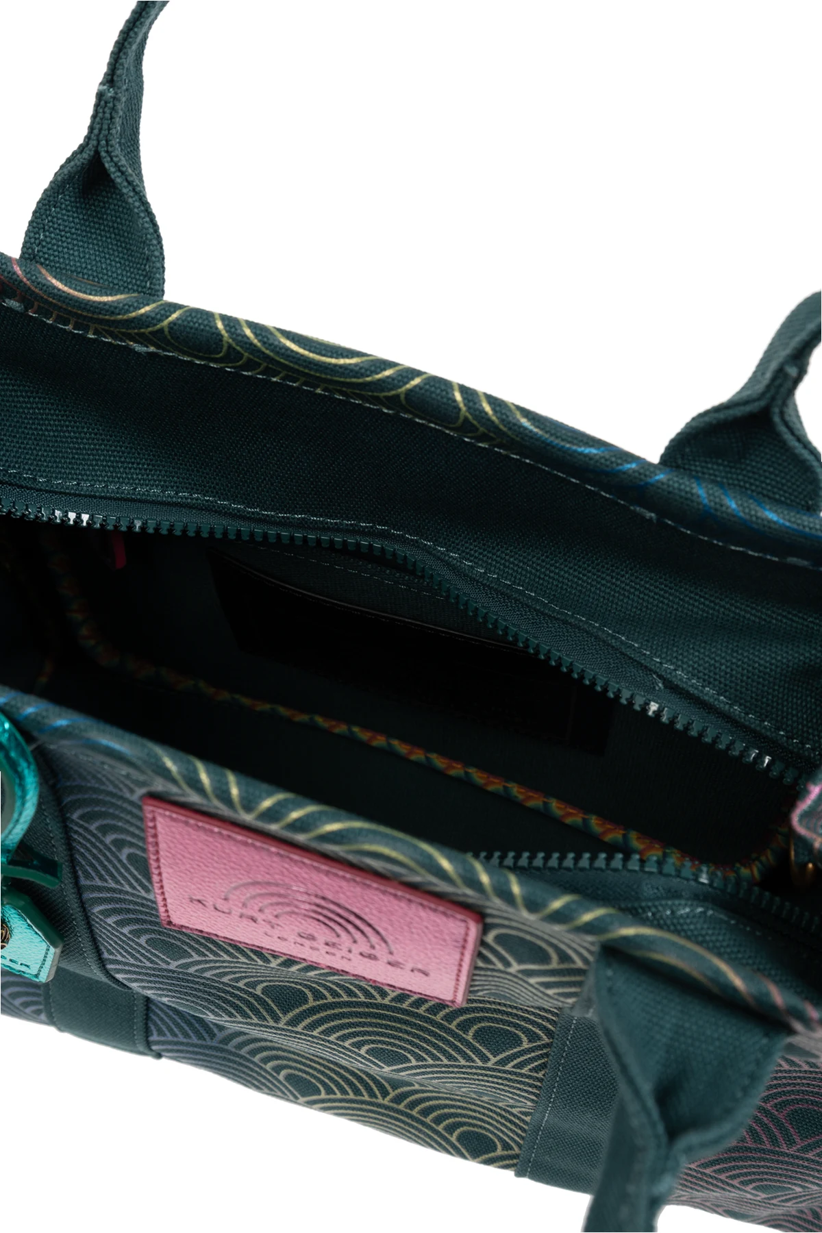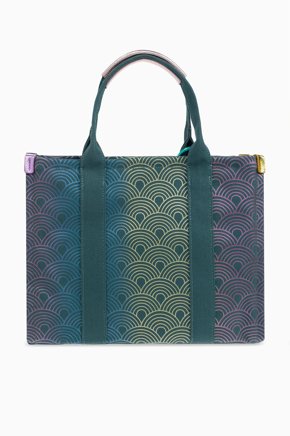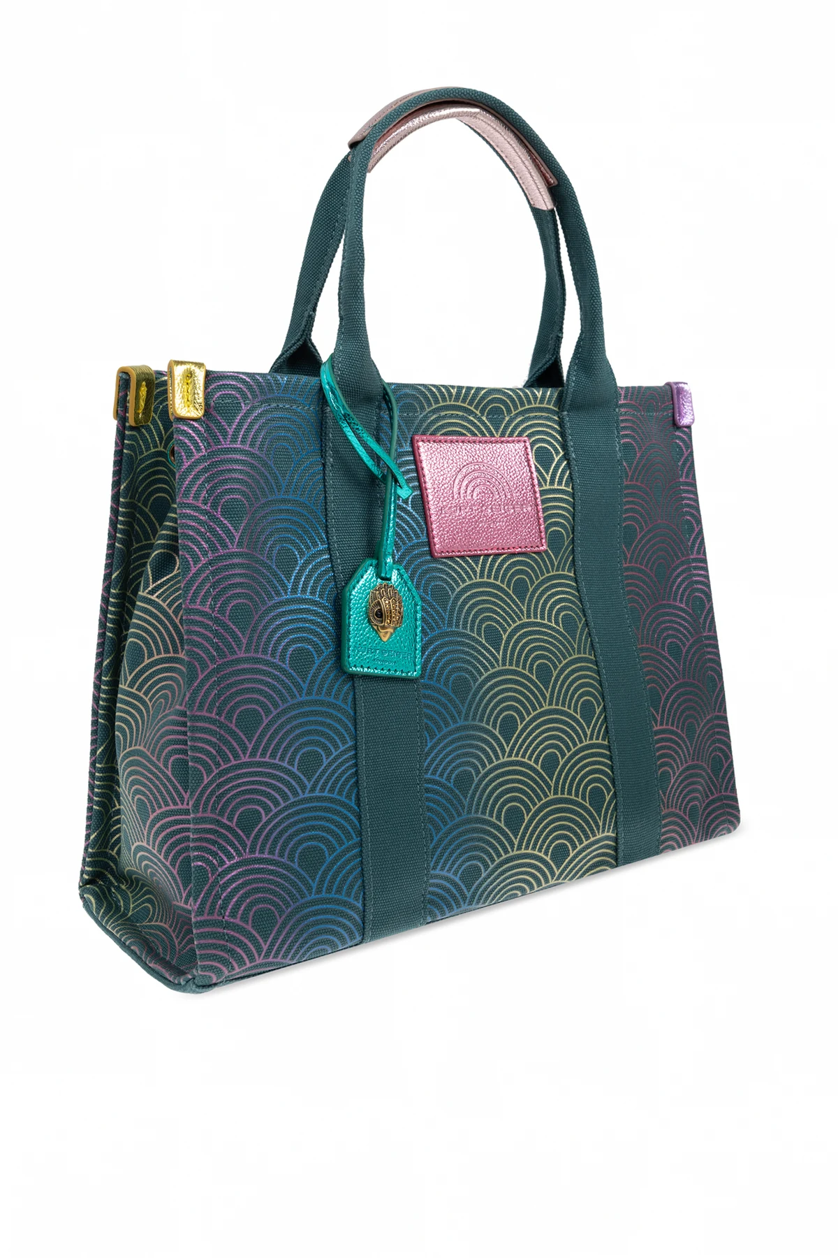 Wir präsentieren die Tasche 'Southbank' aus der exklusiven Kollektion der Marke Kurt Geiger. Diese außergewöhnliche Tasche vereint Eleganz und Modernität durch ihr einzigartiges Muster aus geometrischen Bögen in Blau-, Violett- und Grüntönen. Harmonisch mit dem maritimen Hintergrund kombiniert, zieht die Tasche mit subtilen Details die Blicke auf sich.