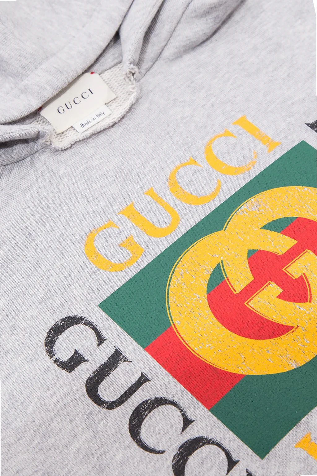 Grey, cotton sweatshirt with a hood from Gucci. On the front a print with a yellow and white logo, as well as a 'Web' stripe characteristic for the brand in green-red-green. Two inset pockets. Bottom and sleeves finished with welts.