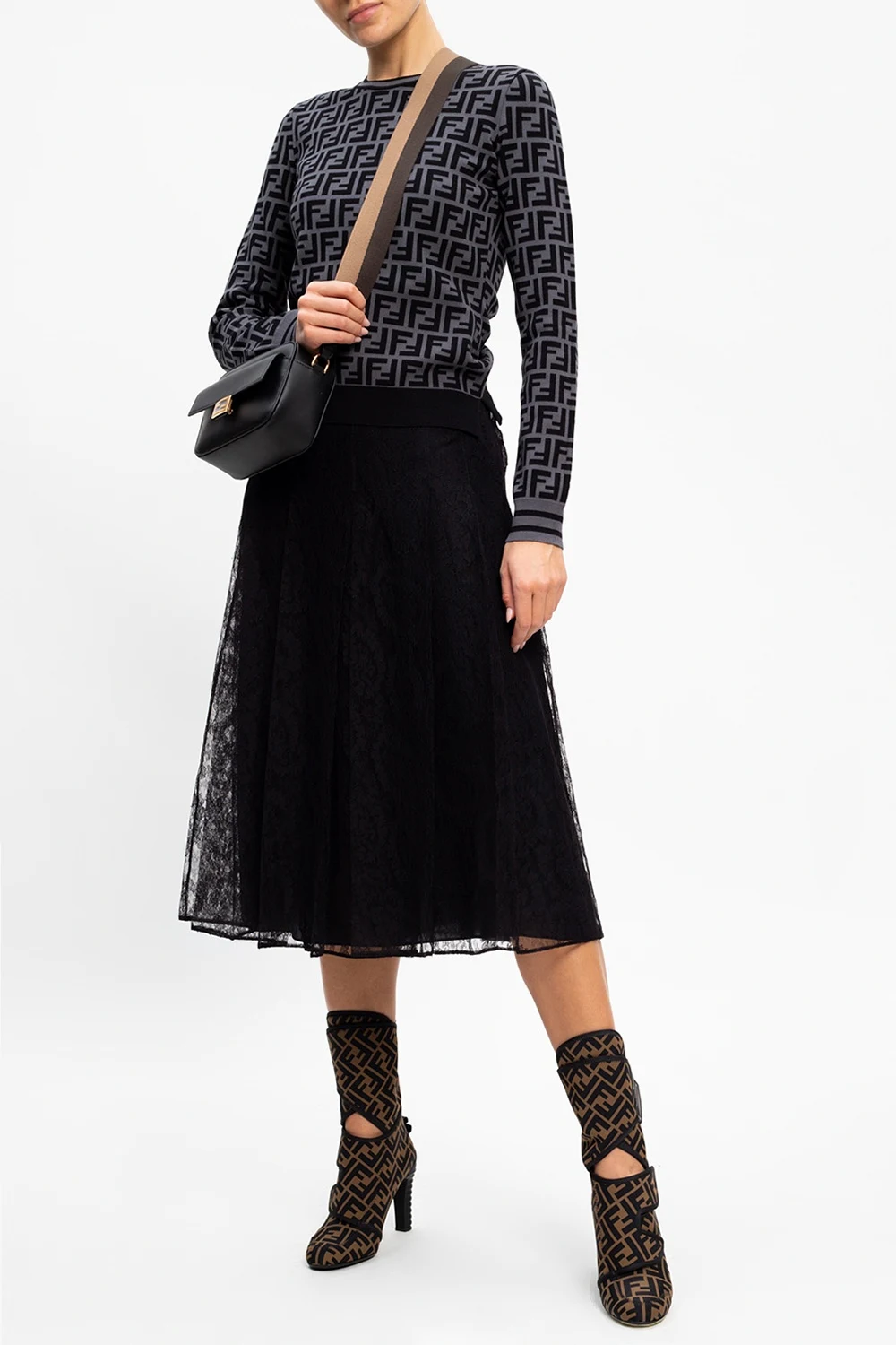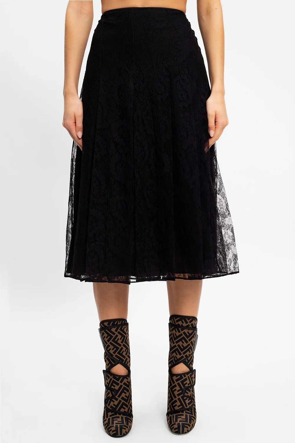 Black skirt from Fendi. Enhanced with tone-on-tone lace motif, this pleated style is complete with zip and hook & eye closures on the side.