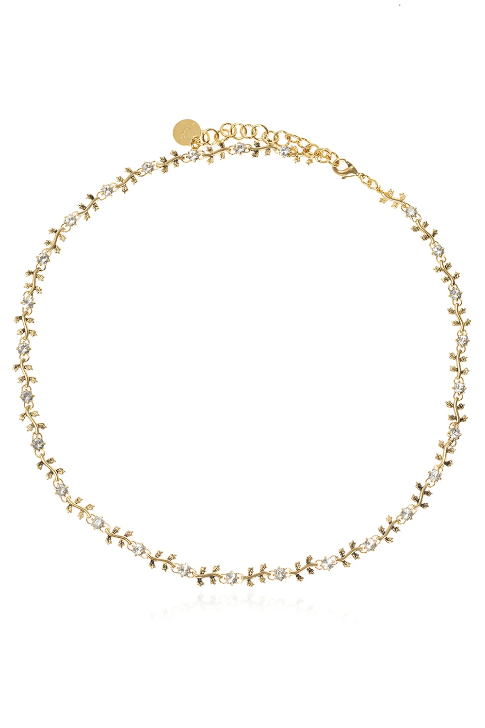 Gold-tone necklace from Marni. Embellished with white rhinestones, this item is complete with a light beige woven string with logo-embossed gold-tone elements.