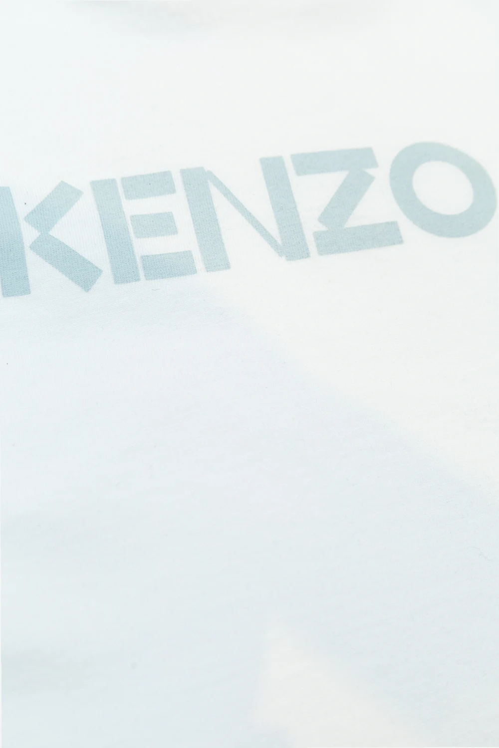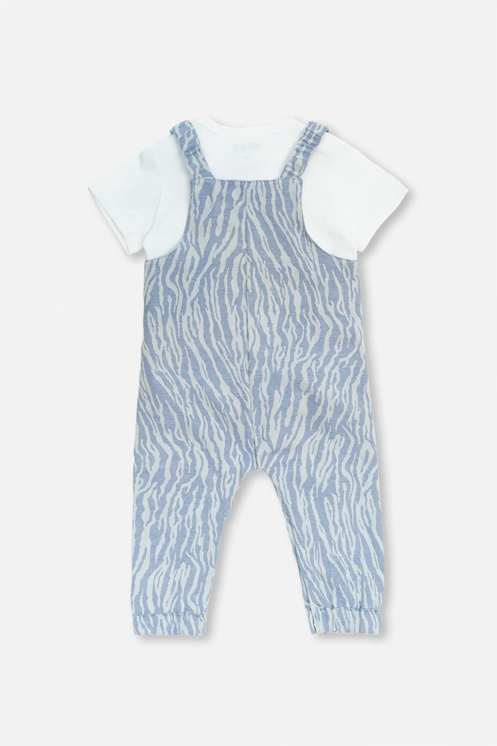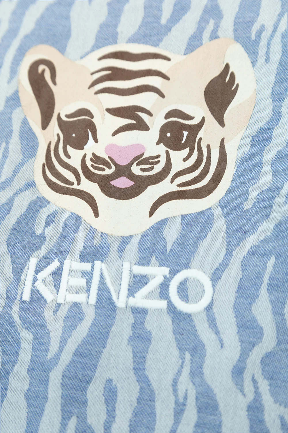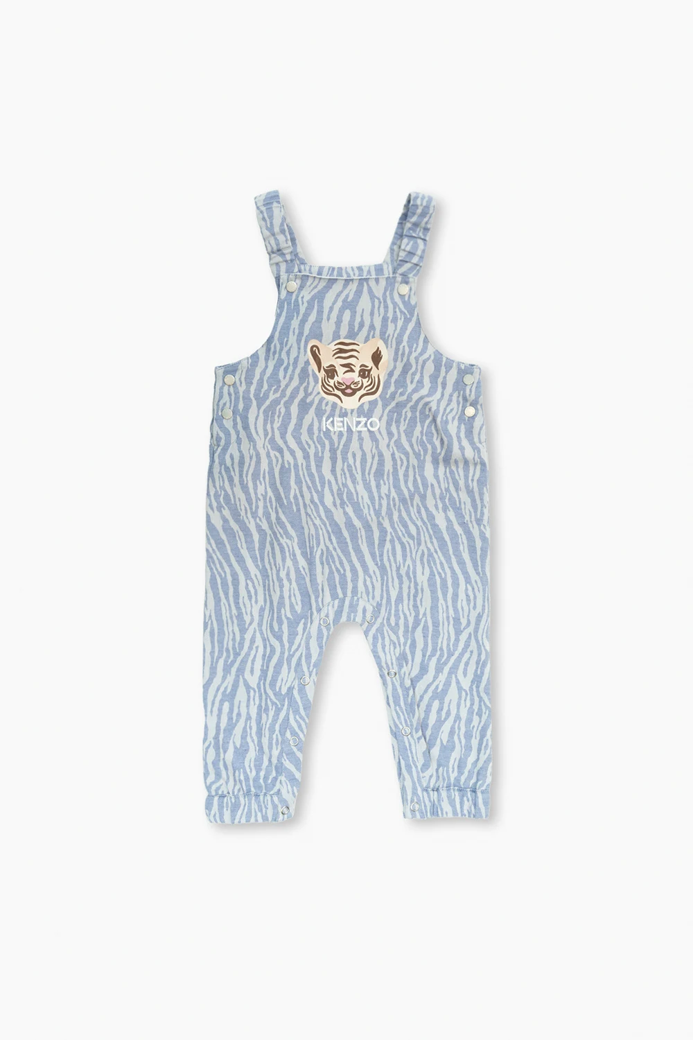 Blue and white T-shirt and dungarees set from Kenzo Kids. Made of cotton. The short sleeve T-shirt is complete with snap fastenings and a light blue logo print. The dungarees feature an animal pattern, snap fastenings, multicolored tiger head, white logo embroidery, detachable and elasticated shoulder straps with snap fastenings and trimming at the cuffs.