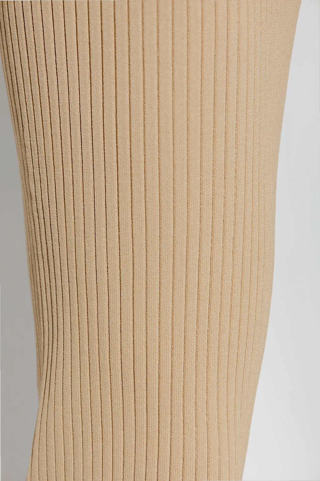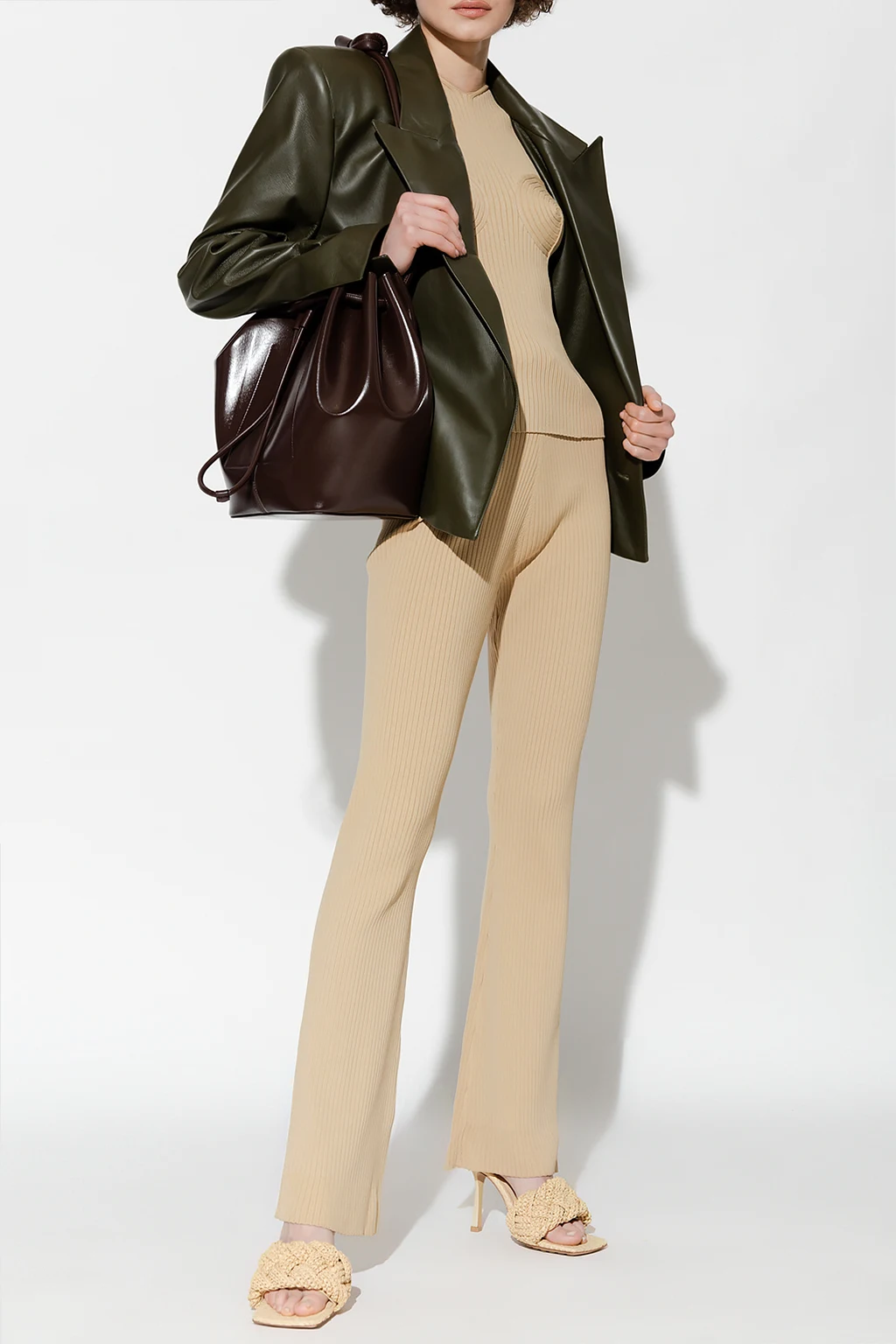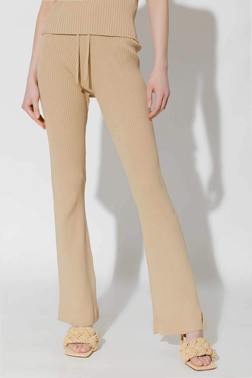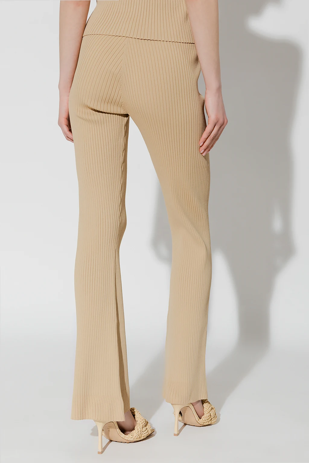Beige ‘Alea’ ribbed trousers from Nanushka. Crafted in part from FSC-certified material with a ribbed texture, this pair falls with flared legs and features a high-rise waist and a drawstring waistband.