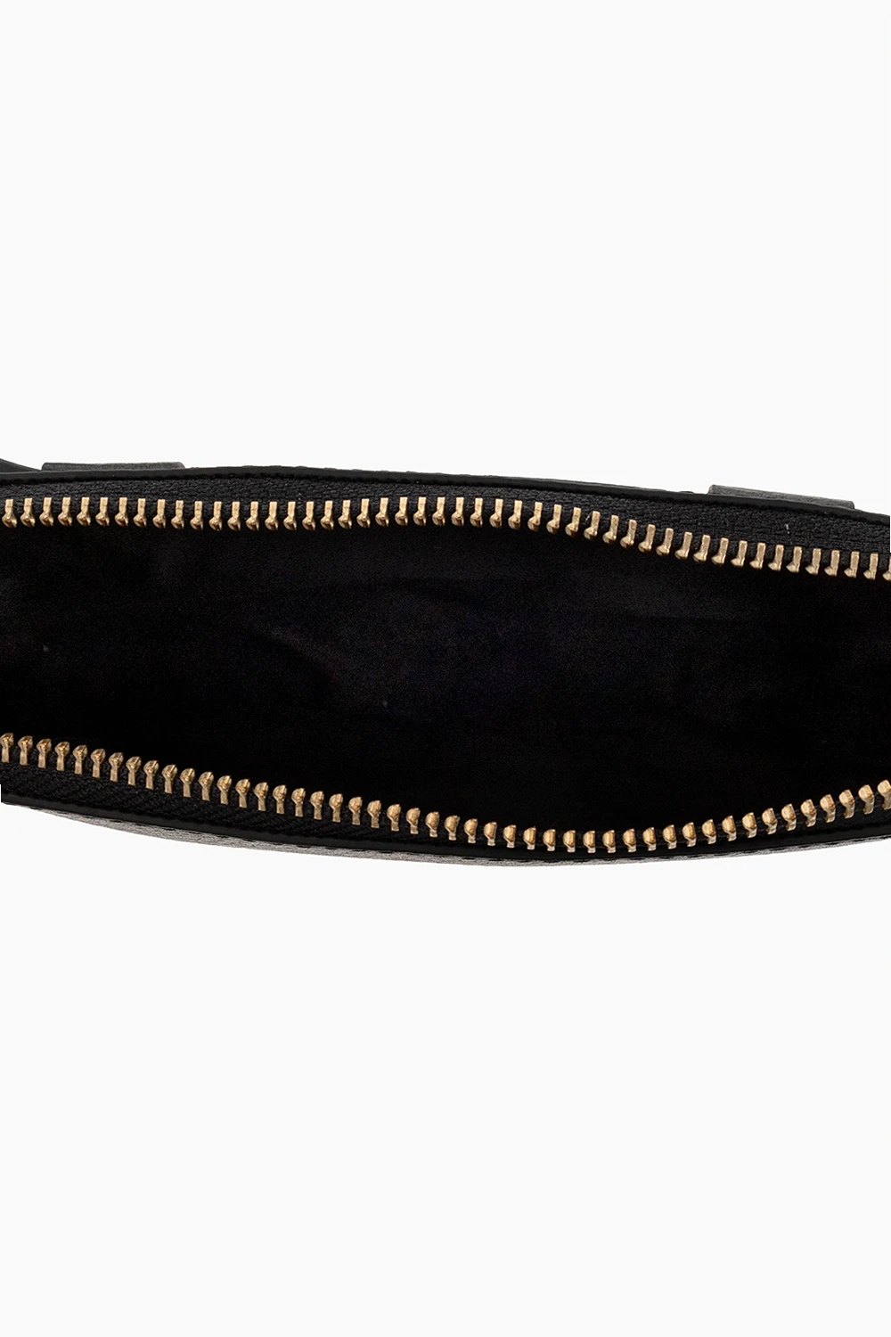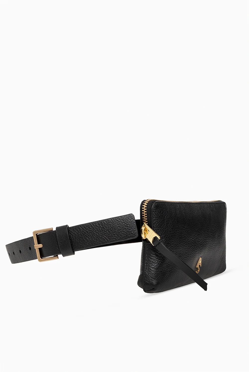 Black pouch from AllSaints. Made from calf leather, this design features a zip fastening, an adjustable strap with a metal buckle and antiqued gold-tone logo hardware on the front.