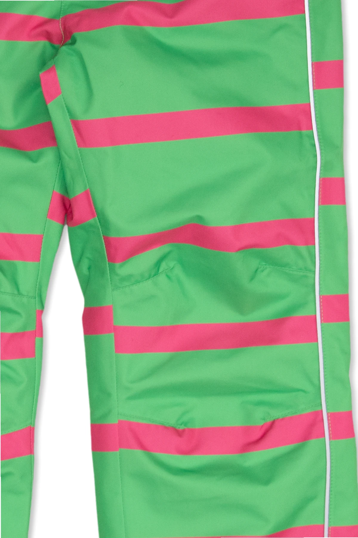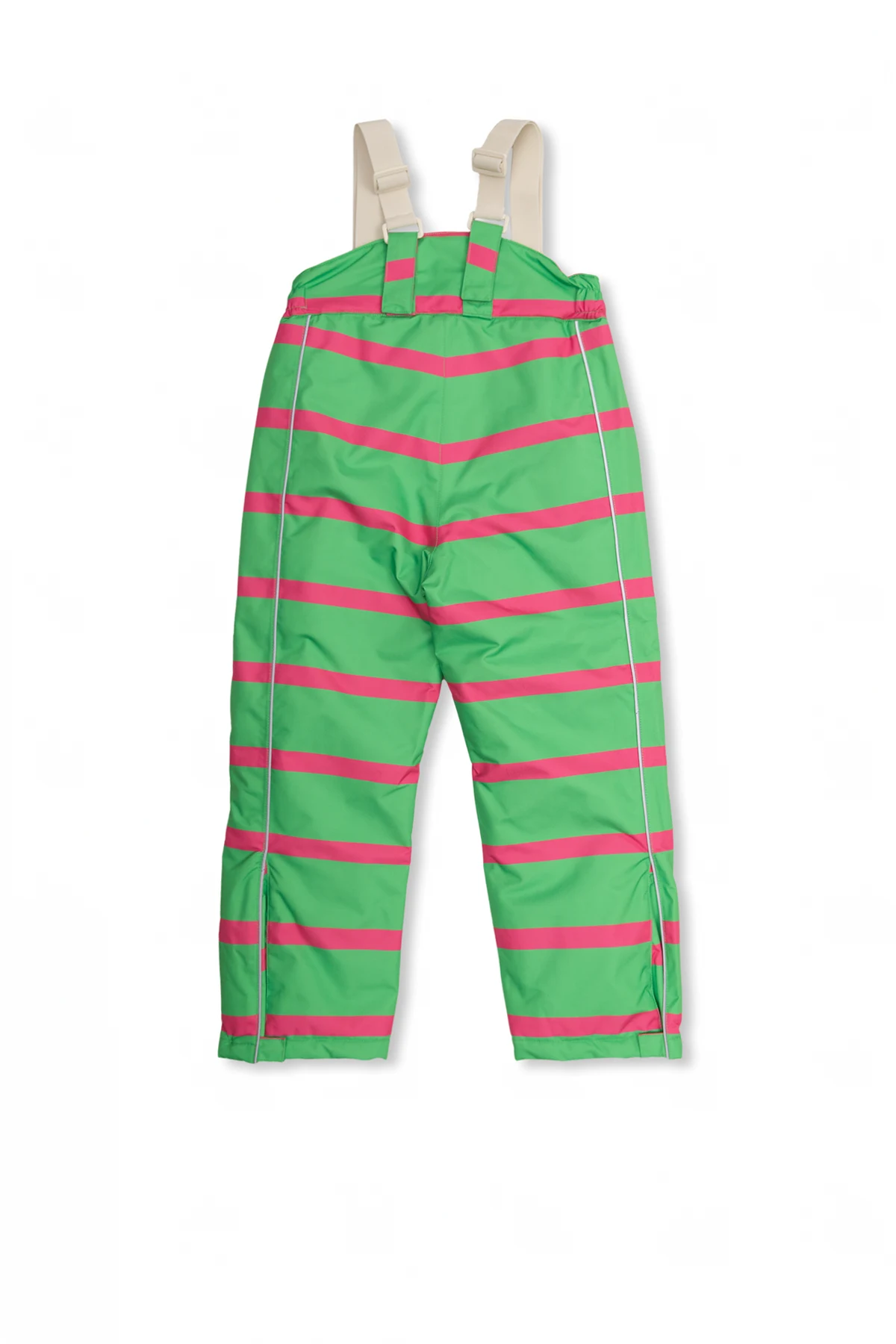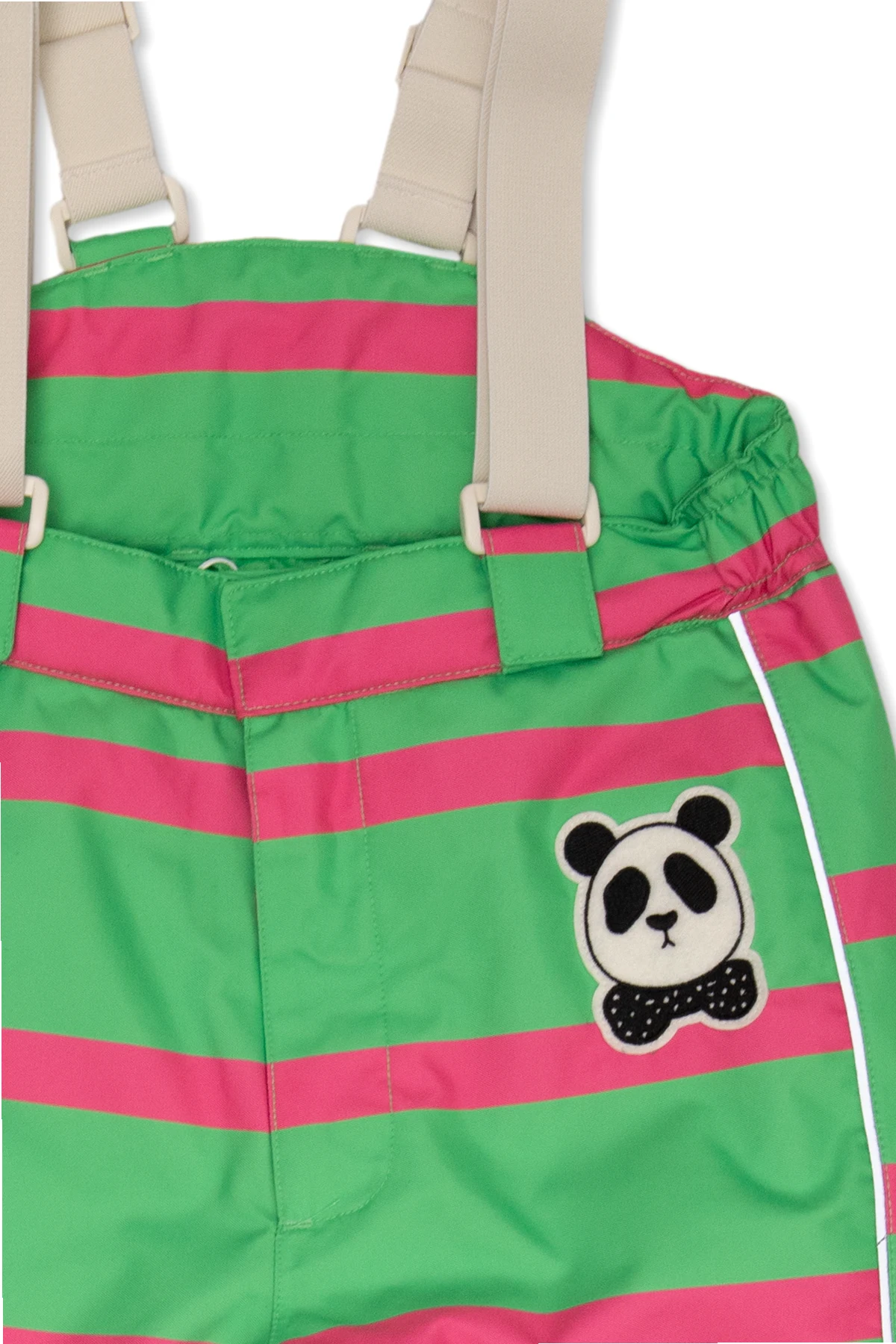 Green and pink, insulated ski trousers from Mini Rodini. Crafted from partly recycled material with water-repellent, breathable and windproof properties and treated with BIONIC FINISH®ECO coating – an eco-friendly alternative to the traditional DWR water-repellent material finish, this pair fastens with a zip and snap and showcases a stripe pattern reflective piping and a signature panda head patch on the front. It is complete with ribbed cuffs with a snap closure and snow locks in black rubber at leg ends.