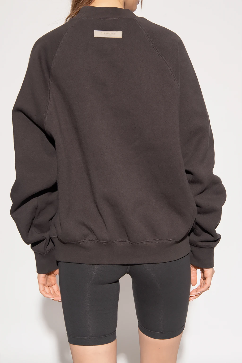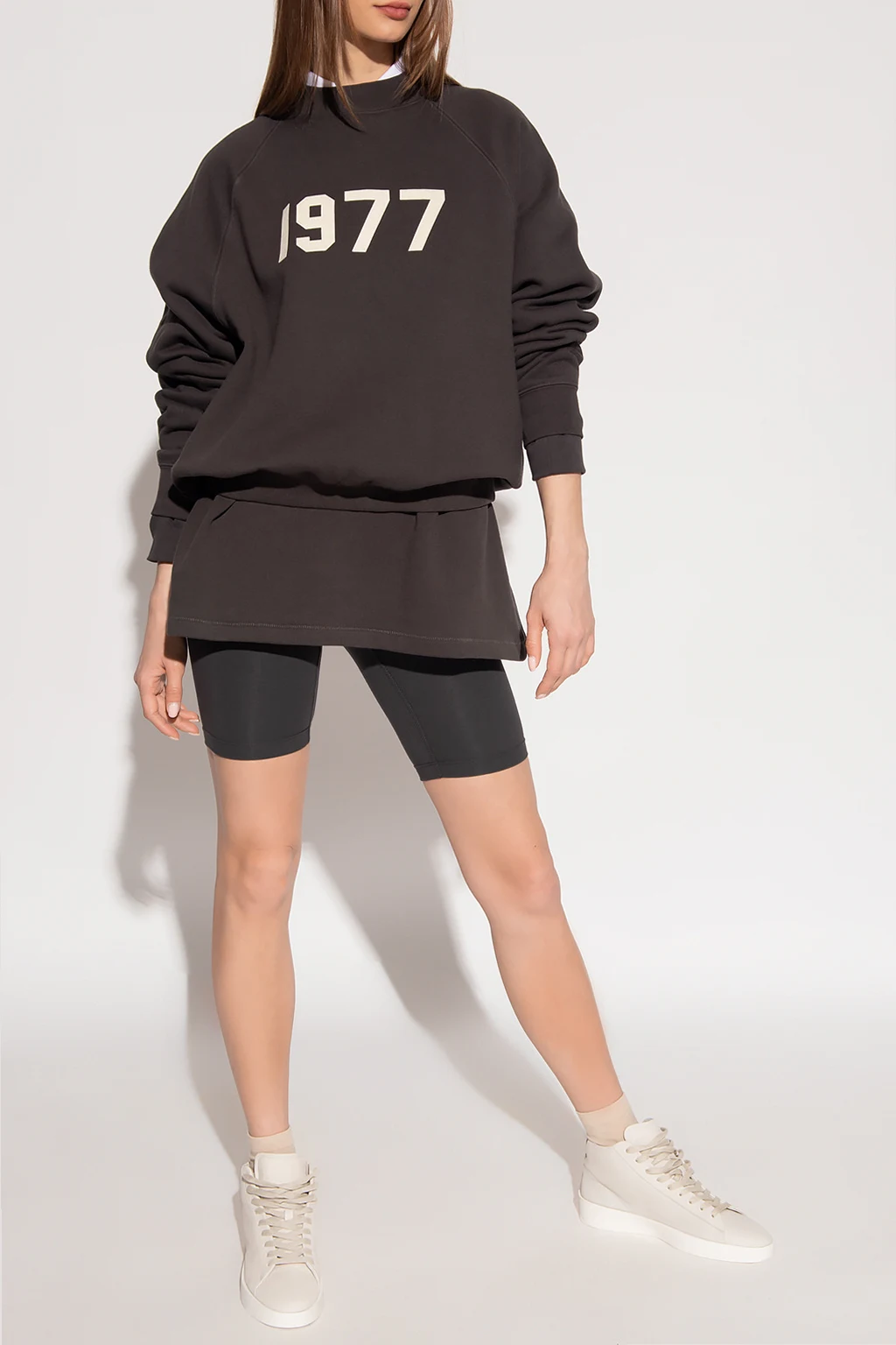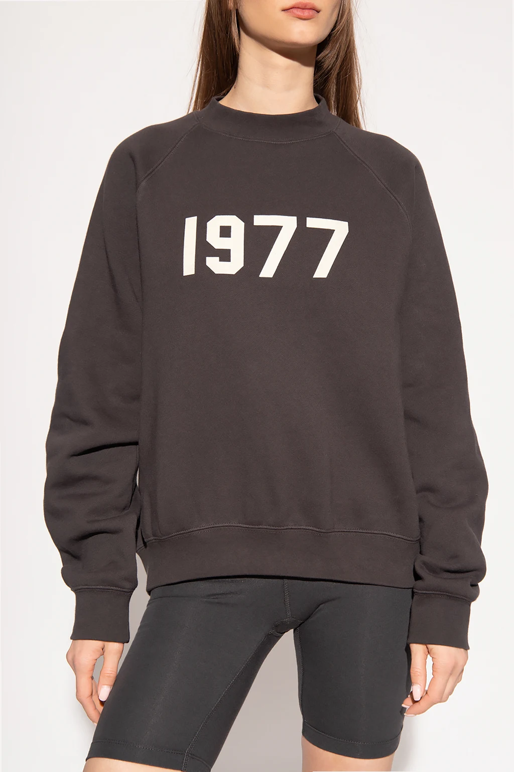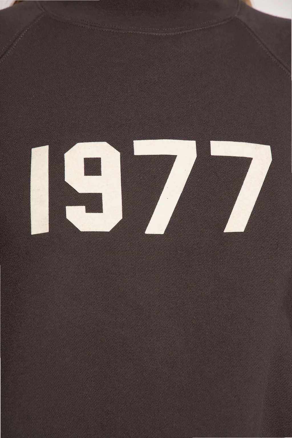 Dark grey crewneck sweatshirt from Fear Of God Essentials. Crafted from cotton jersey with a relaxed silhouette, this style features a cream velvet-flocked ‘1977’ appliqué on the front, a rubber patch at the back and elasticated trims on the collar, bottom hem and cuffs.