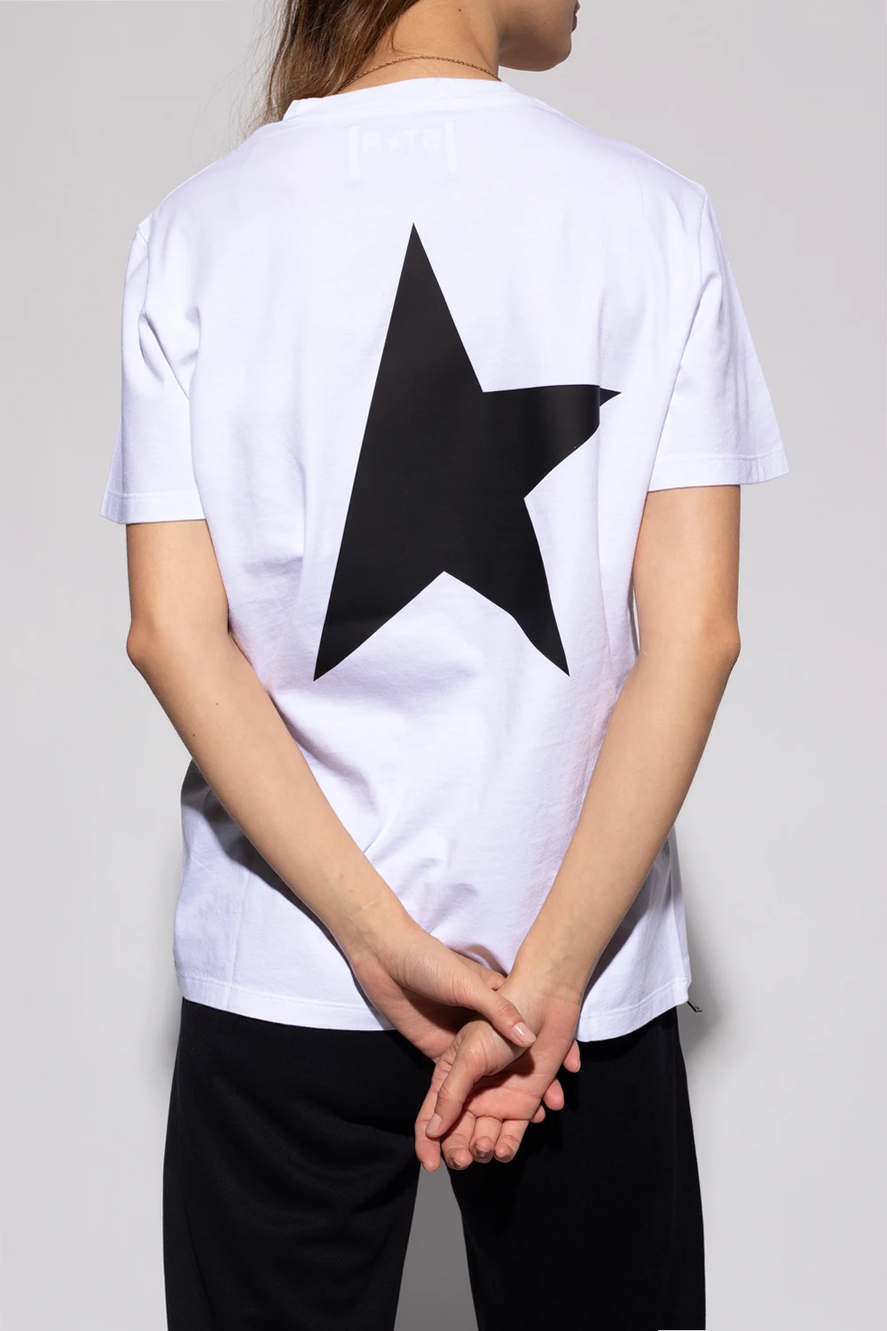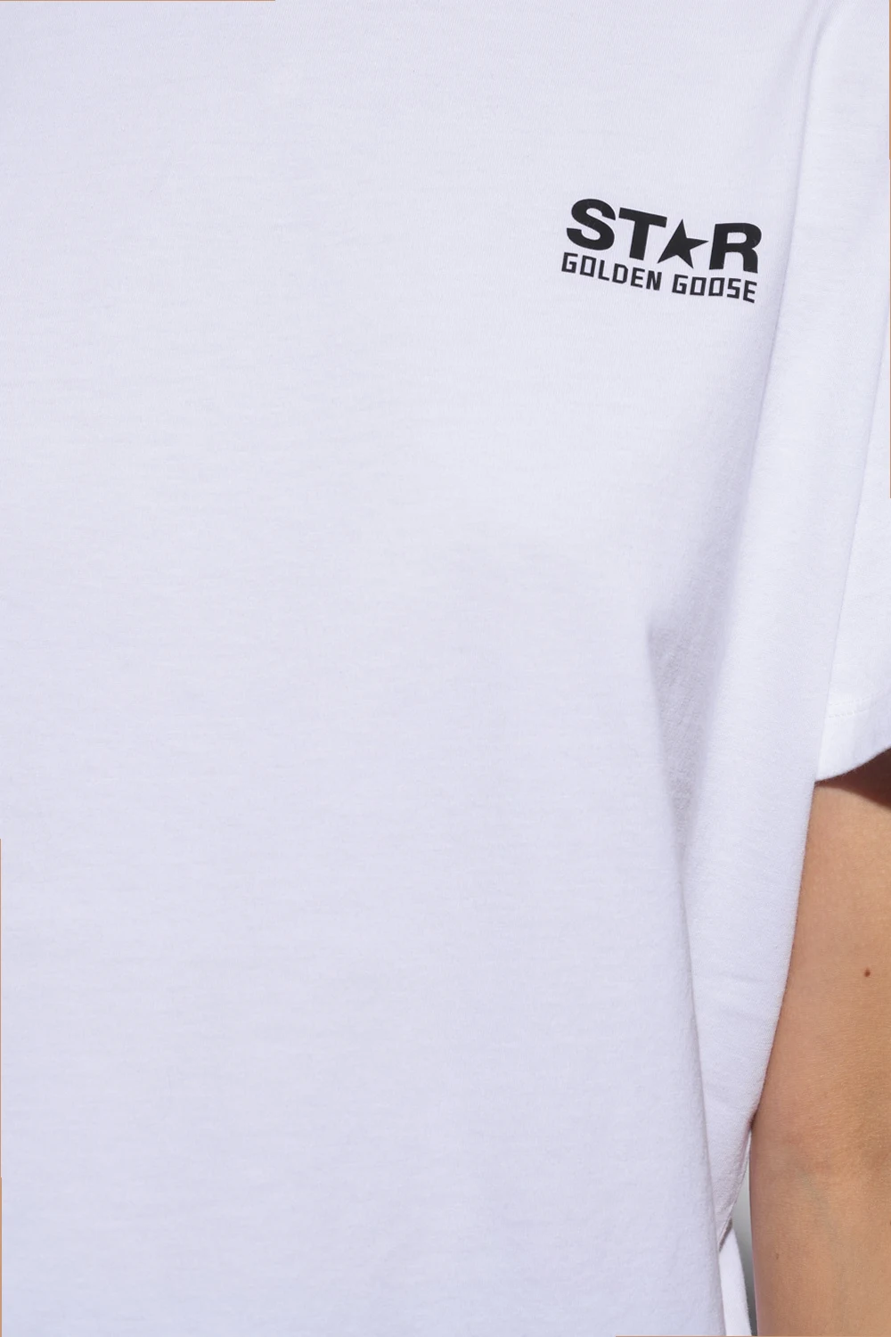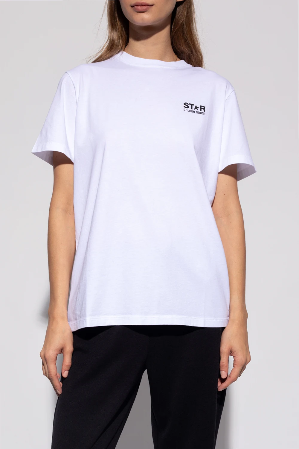 White crewneck T-shirt from Golden Goose. Crafted from cotton, this short sleeve design features a black logo pattern and ribbed neck.