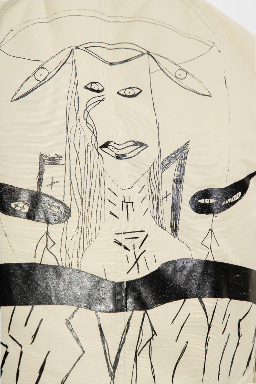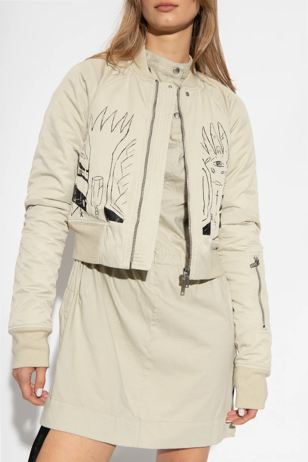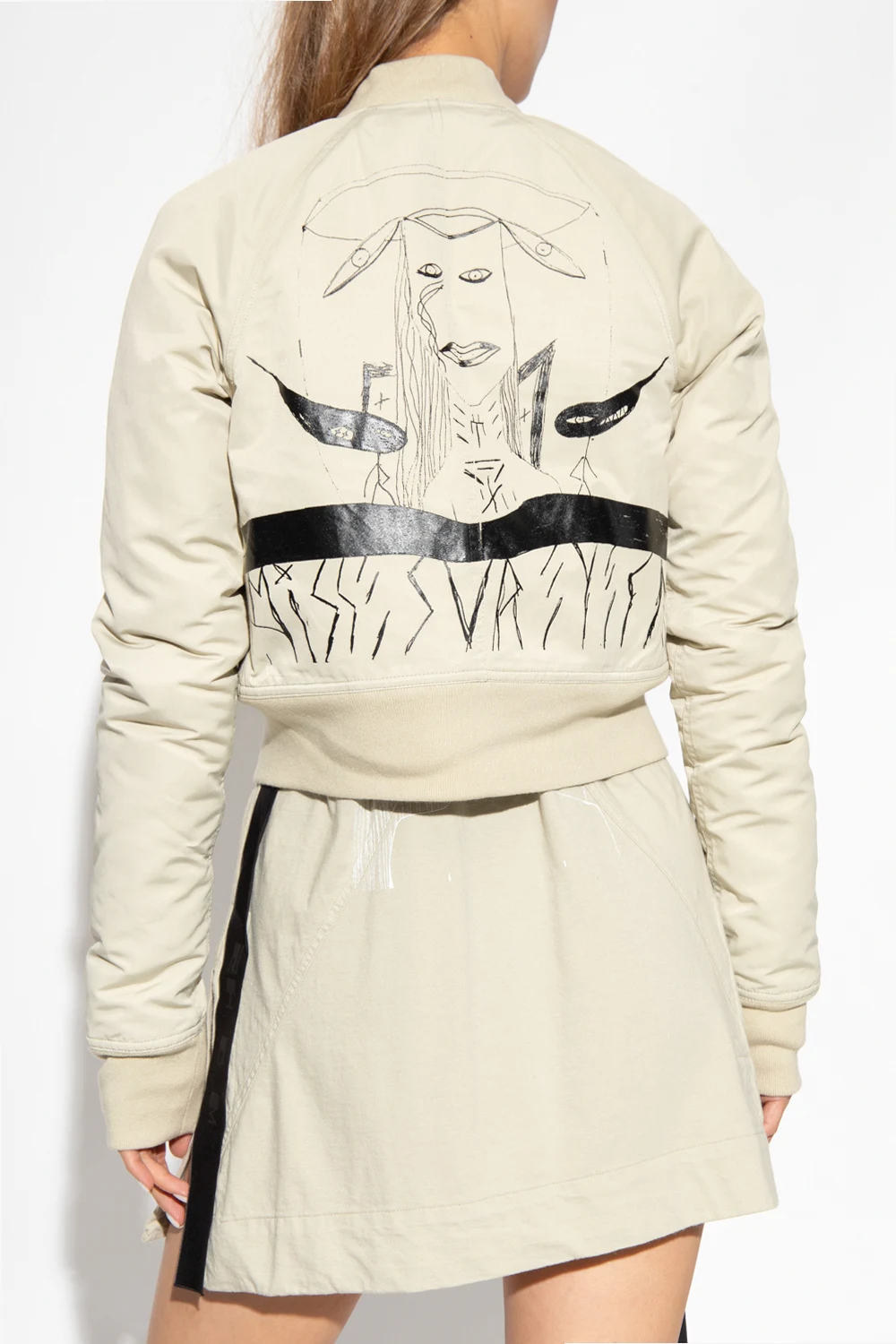 Light grey bomber jacket from Rick Owens DRKSHDW. Embellished with a black graphic print, this style features a zip fastening, two snap-fastened pockets on the front, a zipped sleeve pocket and rib details on the collar, bottom hem and cuffs.