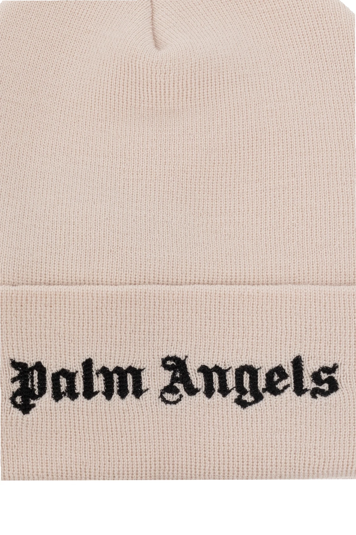 Light pink beanie from Palm Angels. Made of wool, this item showcases an embroidered black logo on the front.