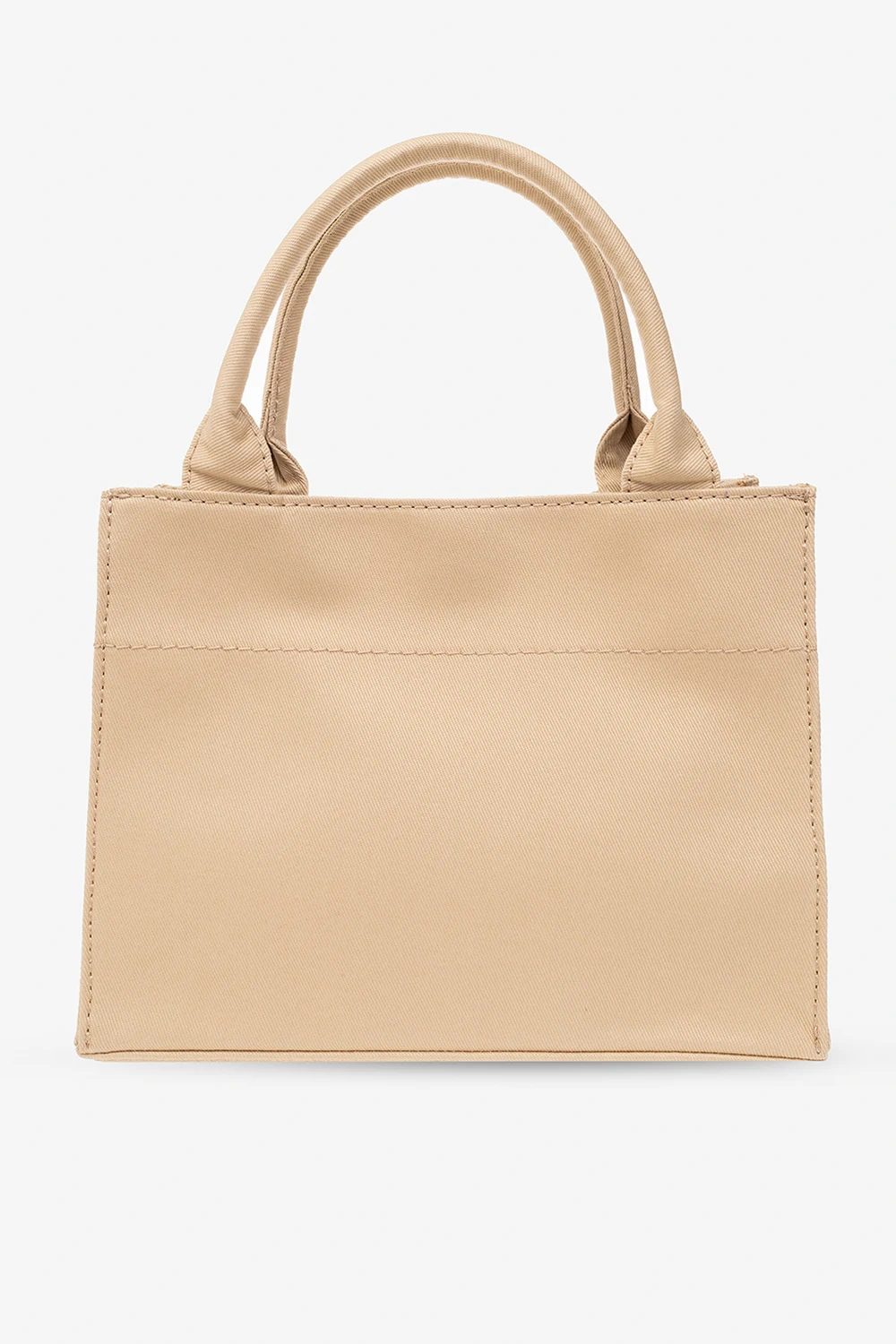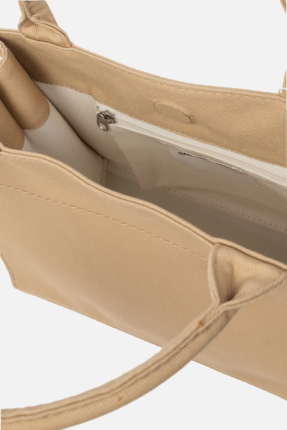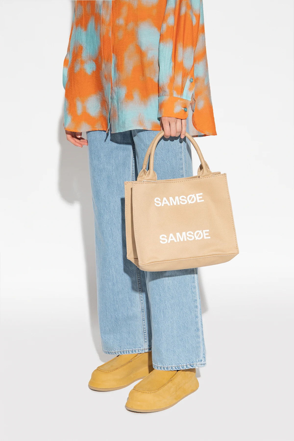 Beige ‘Betty’ shopper bag from Samsoe Samsoe. Crafted from organic cotton, this design features a magnetic snap, white logo print, two half-round handles, silver-tone metal hardware and one internal compartment with one zip pocket.