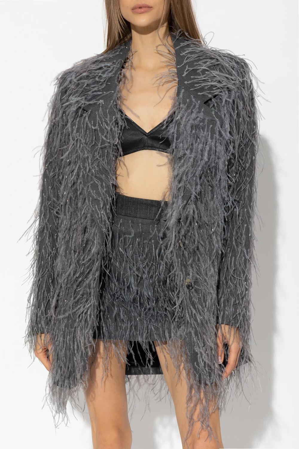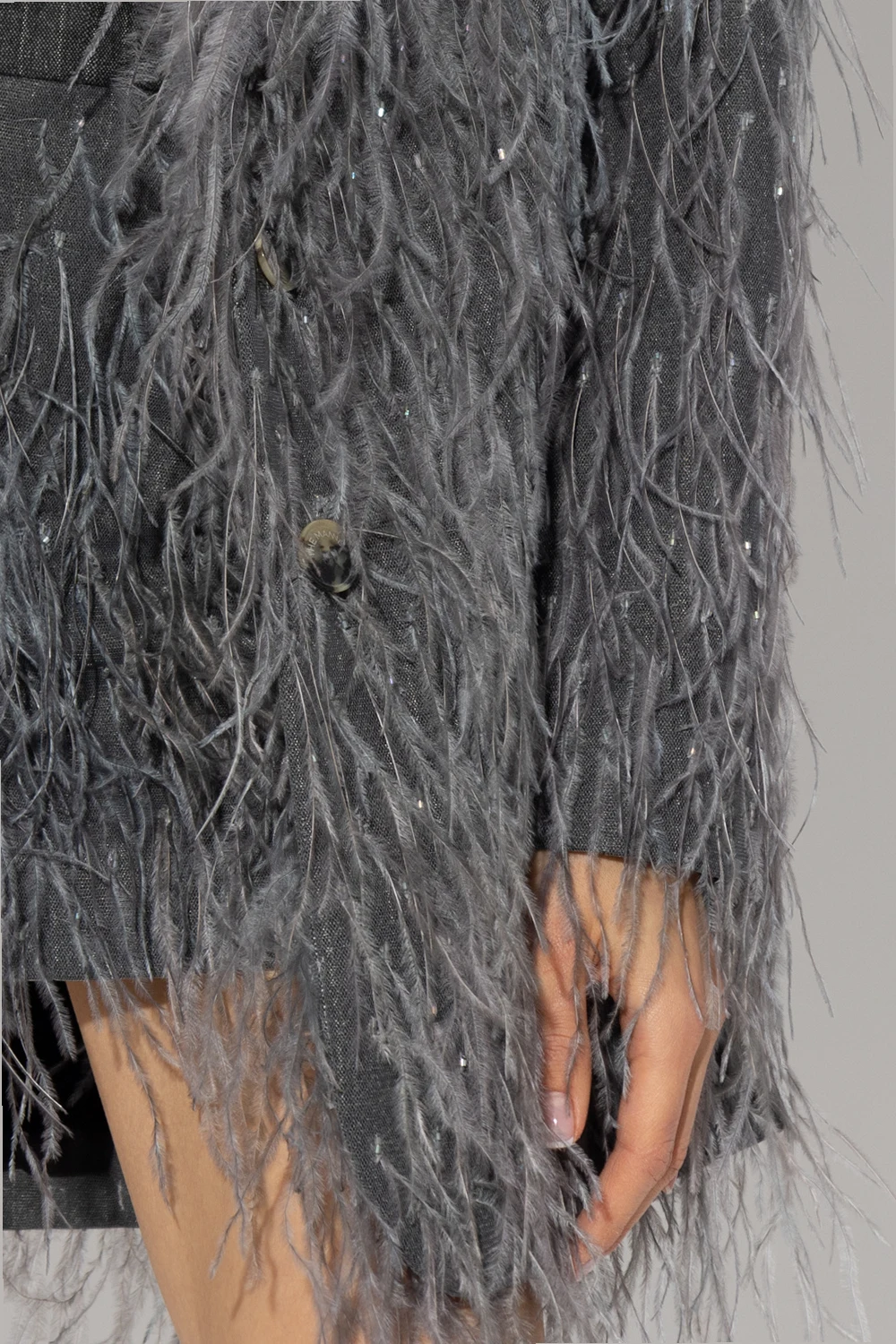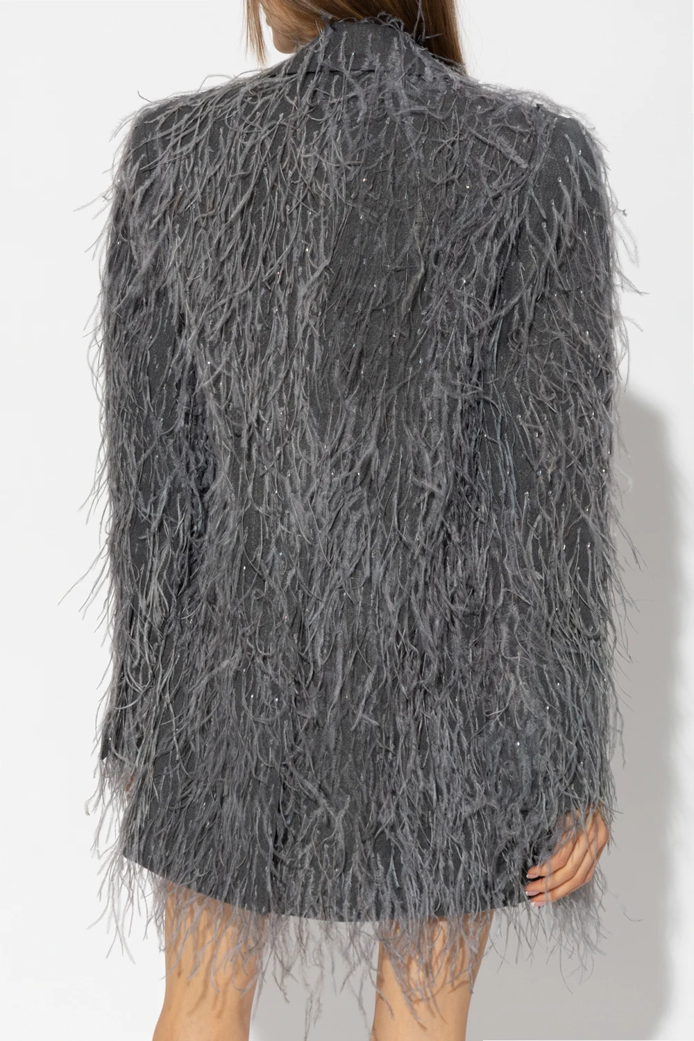 Dark grey ‘Greenock’ blazer from The Mannei. Covered with glossy applications and ostrich feathers, this style features a single-breasted button fastening, a collar with notch lapels, two flapped pockets, padded shoulders and slits on the long sleeves and back.