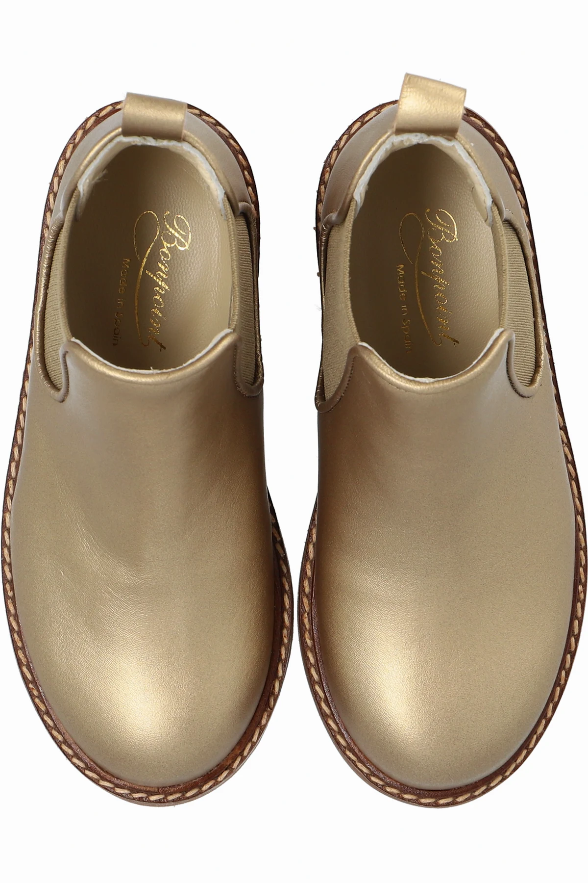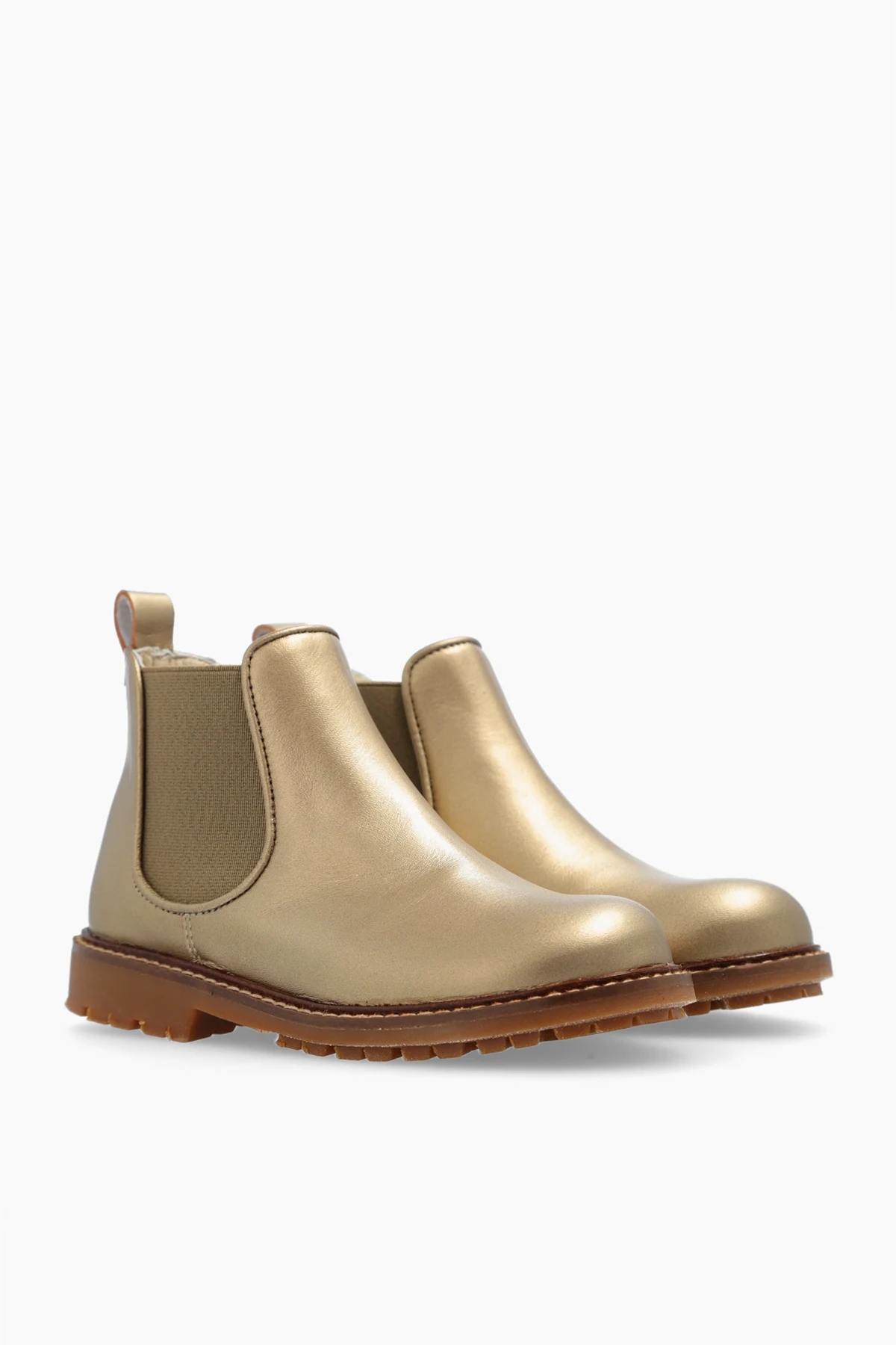 Gold-tone ‘Mathis’ ankle boots from Bonpoint. Made from leather with a slip-on silhouette, this model sits on a brown rubber sole and features a round toe and elastic panels on the sides.
