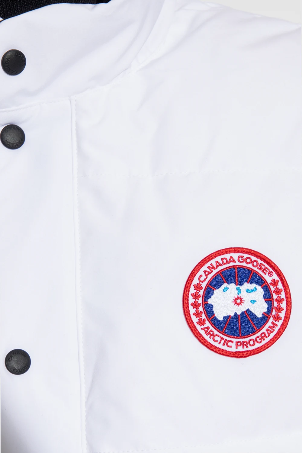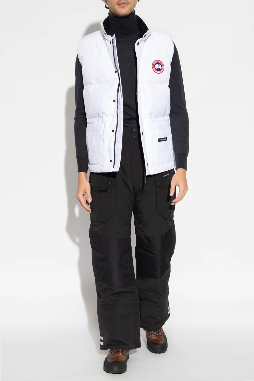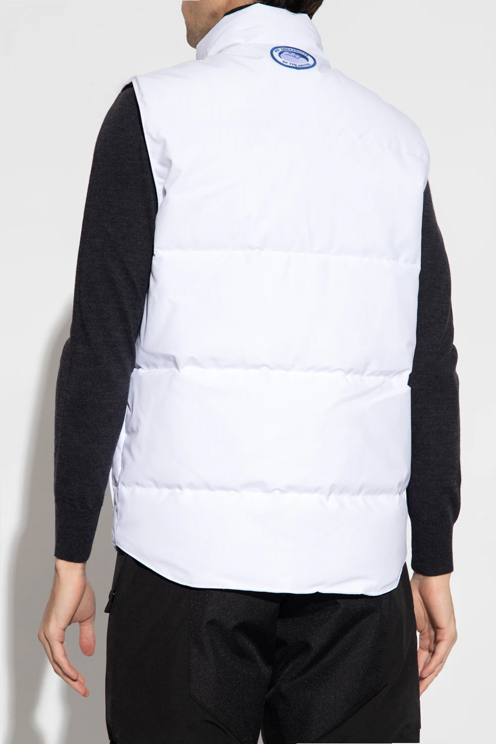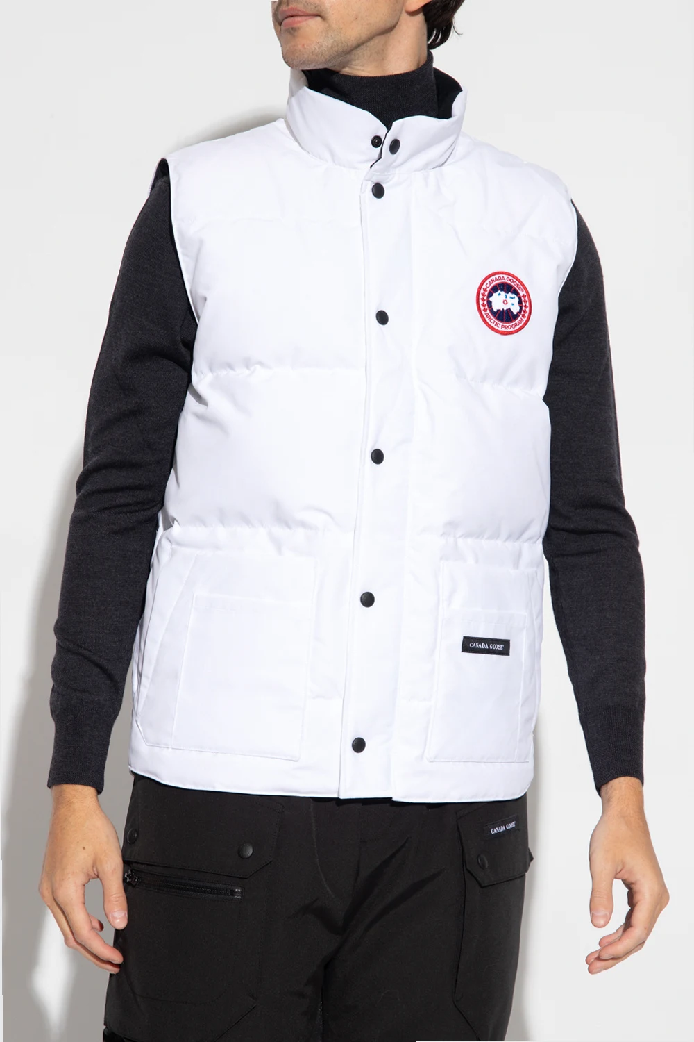 White ‘Freestyle’ quilted down vest from Canada Goose. Fastened with a two-way zip, this design features a two-way zip and snap button placket fastenings, fleece collar, logo patches and six slip pockets. Temperature range: from 5°C to -5°C.