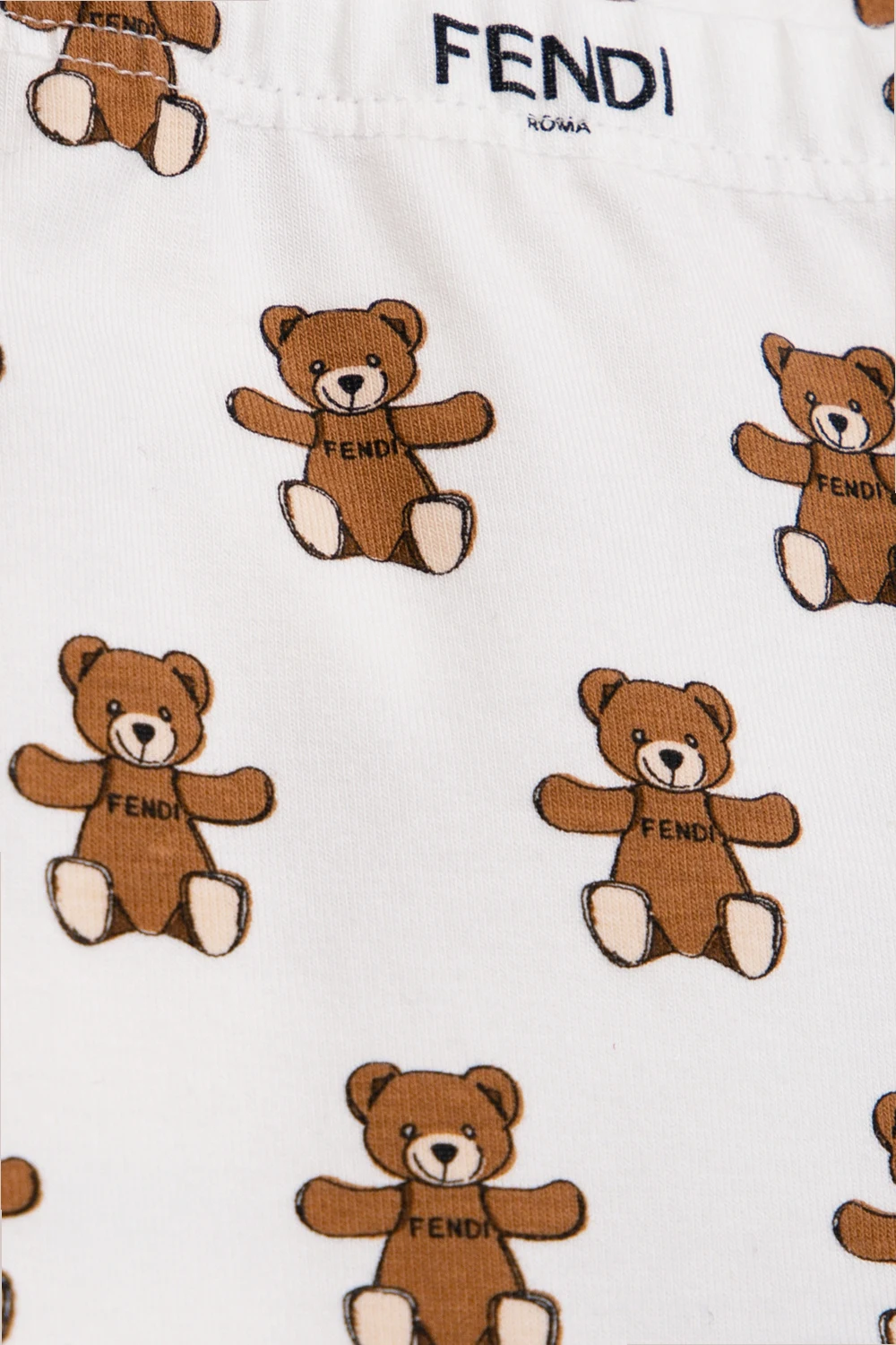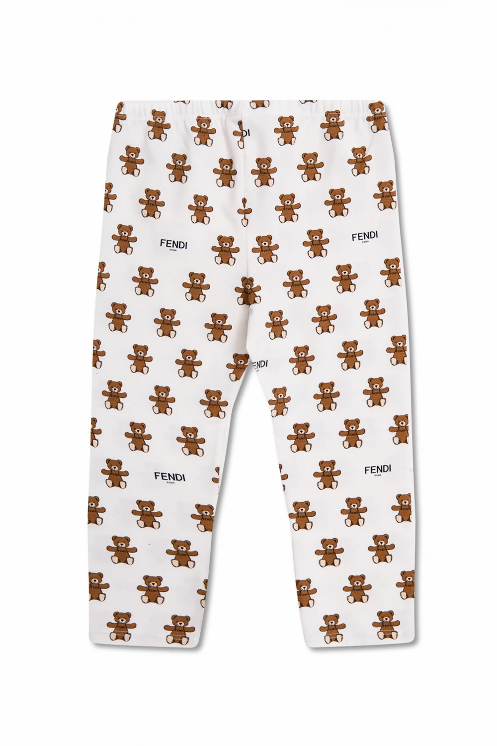 White leggings from Fendi Kids. Made of cotton, they feature an elasticated waistband and a logo & teddy bear pattern in brown, beige and black.