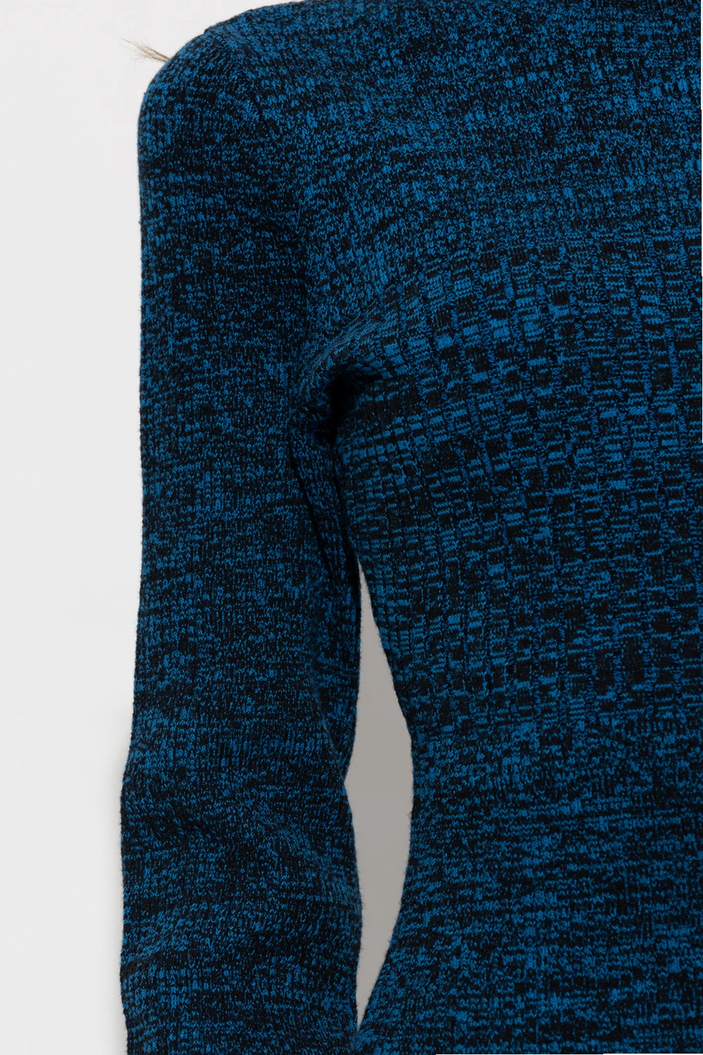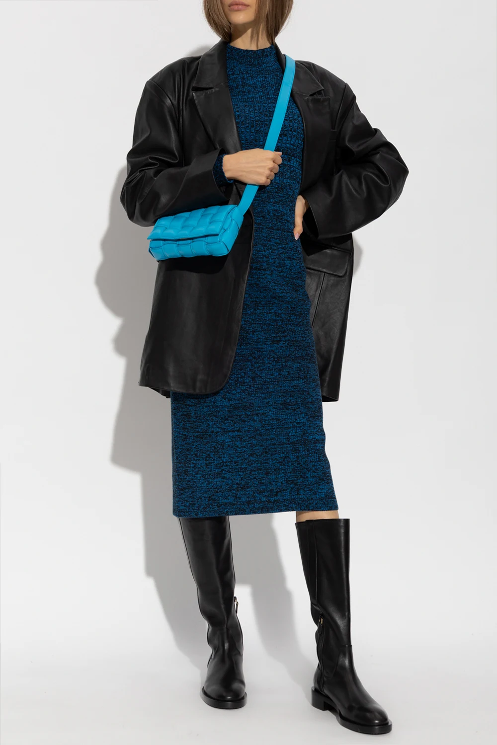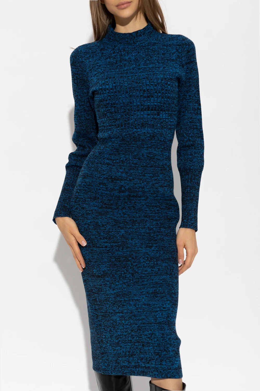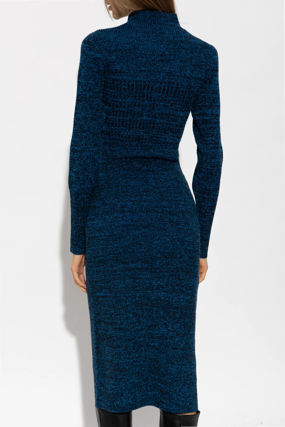 Dark blue and black ‘FrejaGZ’ dress from Gestuz. Crafted in part from organic cotton with the BCI certificate, this style features a ribbed texture, a form-fitting silhouette, a mock neck and long sleeves.