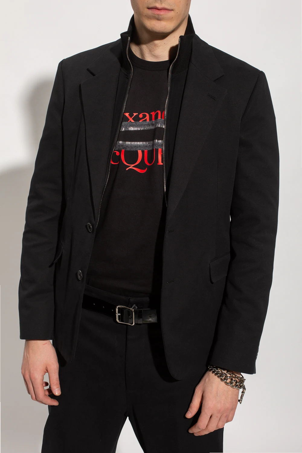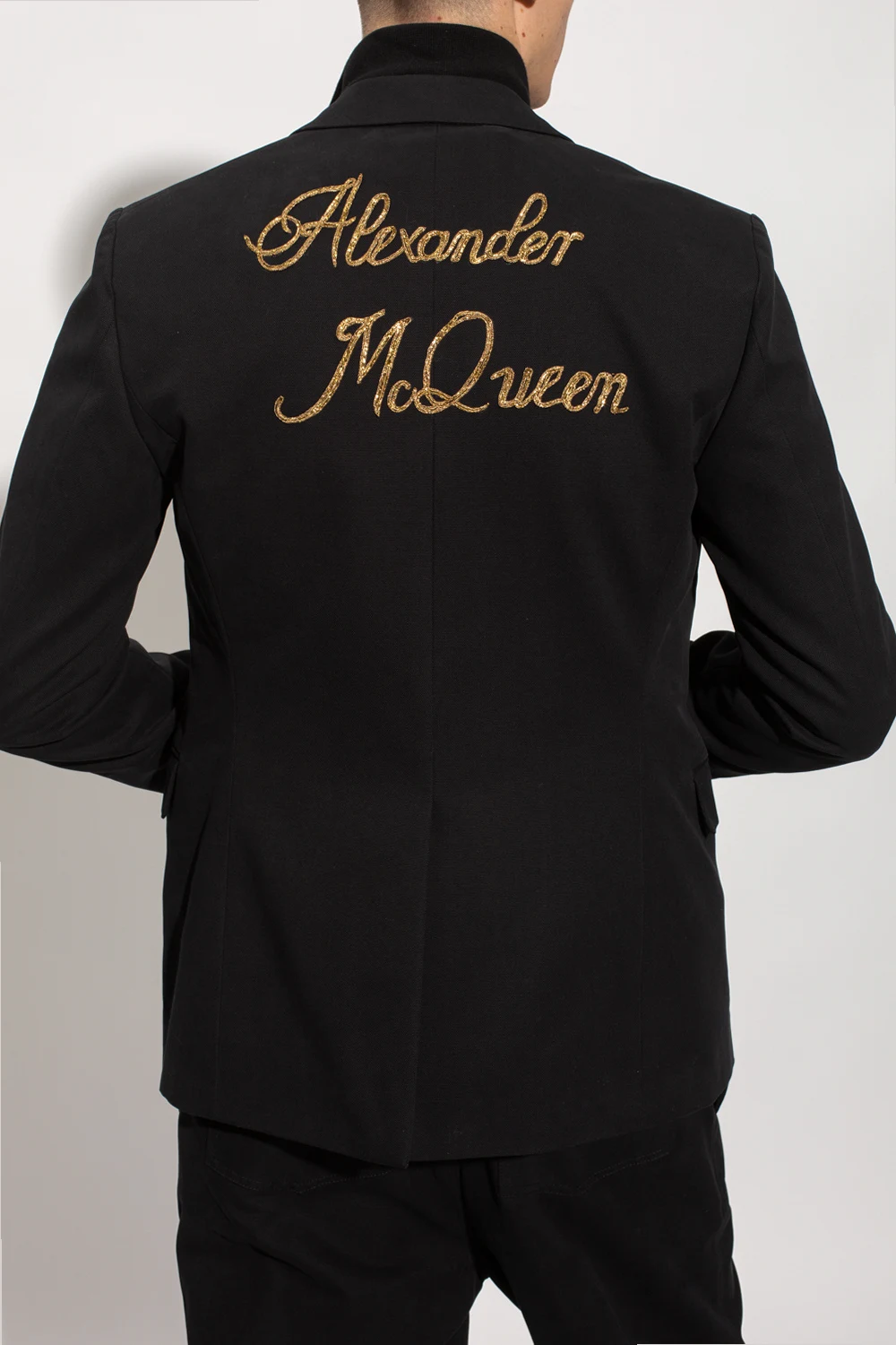 Black single-breasted blazer from Alexander McQueen. Made of cotton, this style features a double button closure, a distinctive gold-tone logo appliqué accompanied by a single vent at the back, notch lapels, two flapped pockets and long sleeves with four buttons to the cuffs.