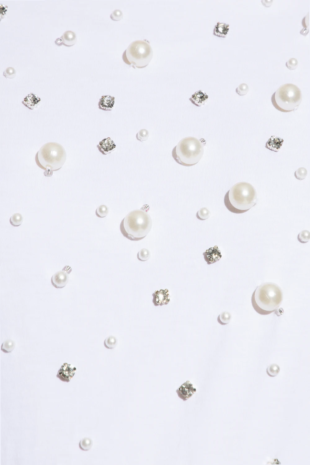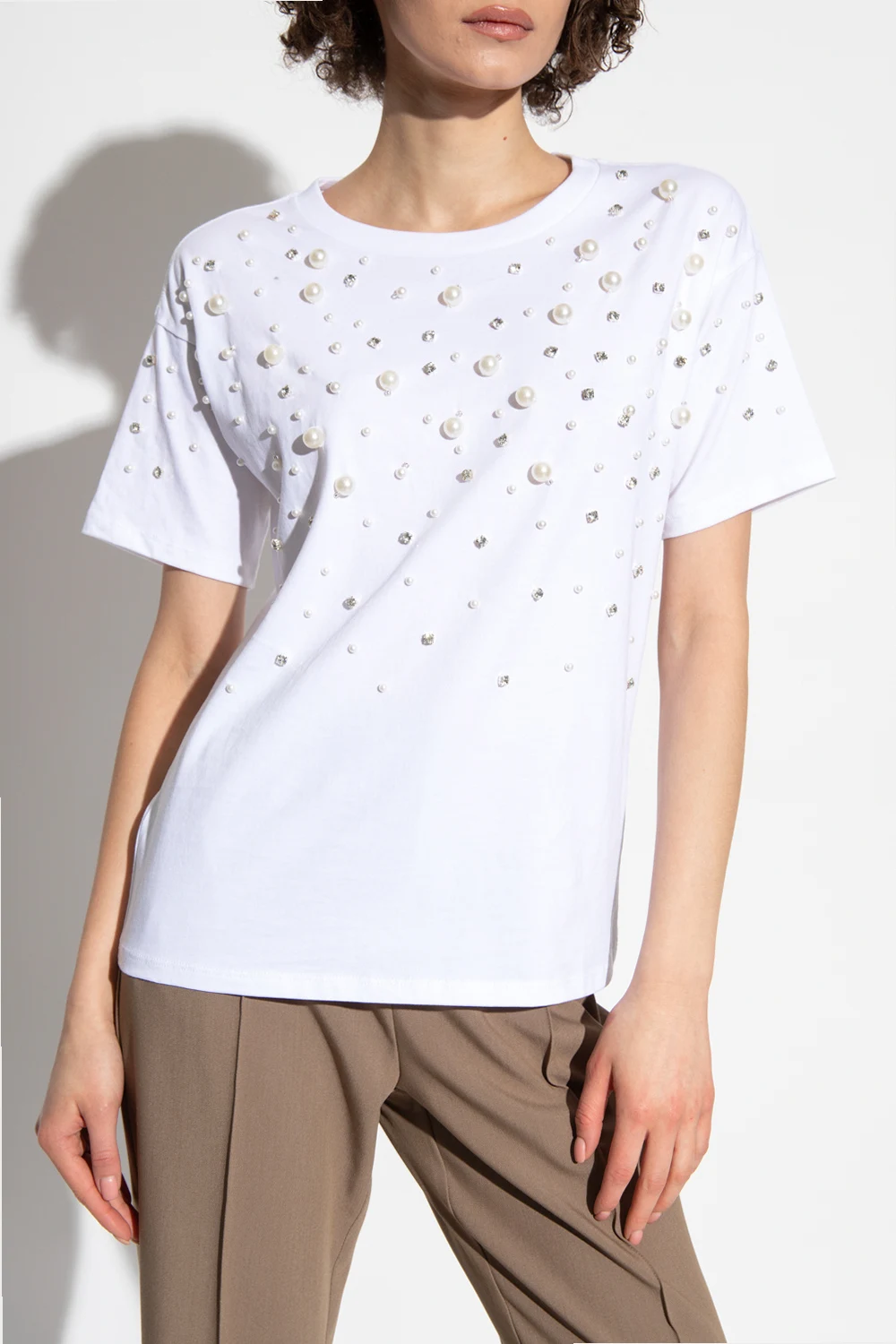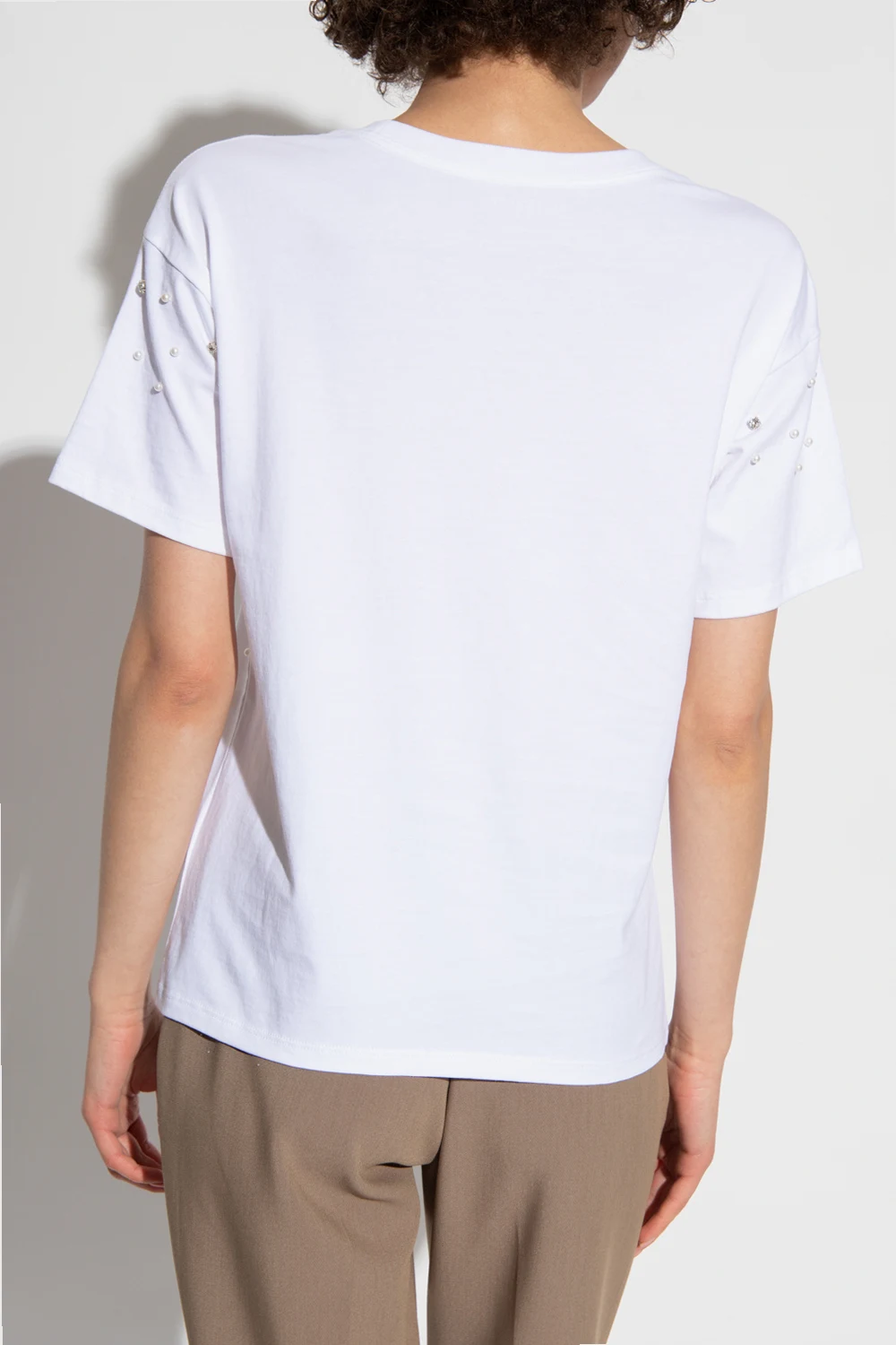 White crewneck T-shirt from Kate Spade. Crafted from cotton, this style features short sleeves and an elasticated collar and is embellished with glossy appliqués and faux pearls on the front.