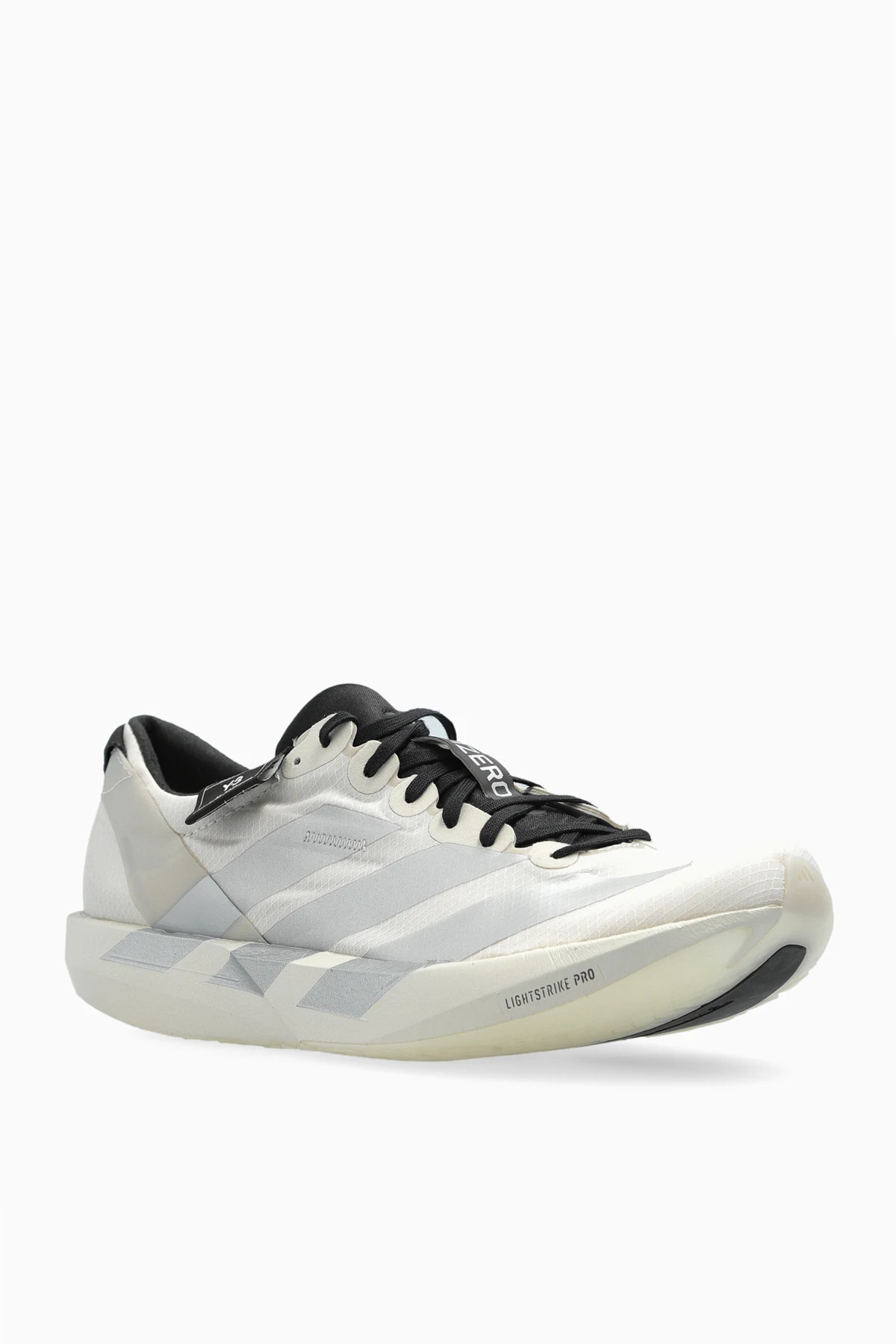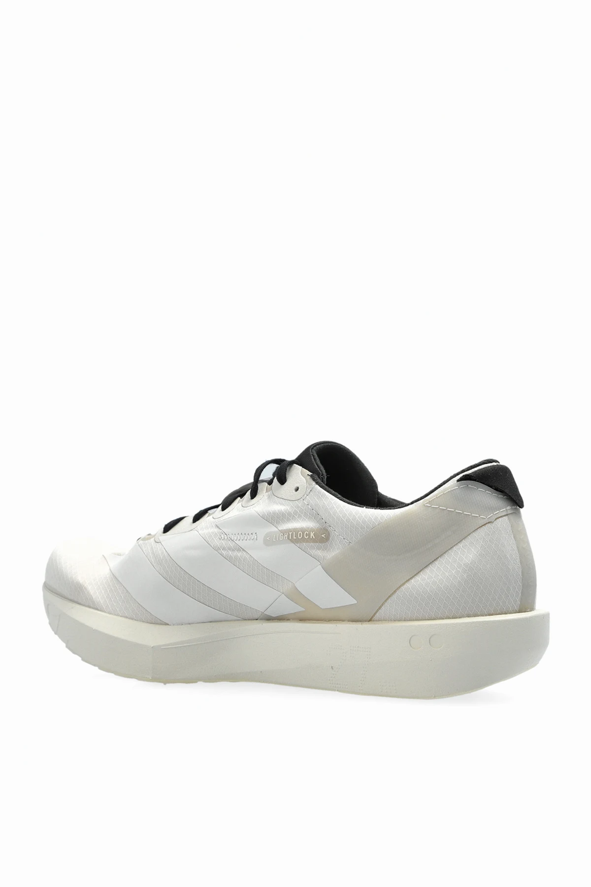 Die Sneakers zeichnen sich durch eine schlanke, aerodynamische Form und ein dezentes, minimalistisches Muster aus, das durch die vorherrschende cremefarbene Farbe mit schwarzen und silbernen Akzenten betont wird. Der LIGHTLOCK Schaft besteht aus einem leichten, atmungsaktiven Material, das sich perfekt an die Fußform anpasst und auch bei intensiven Trainingseinheiten Komfort bietet.