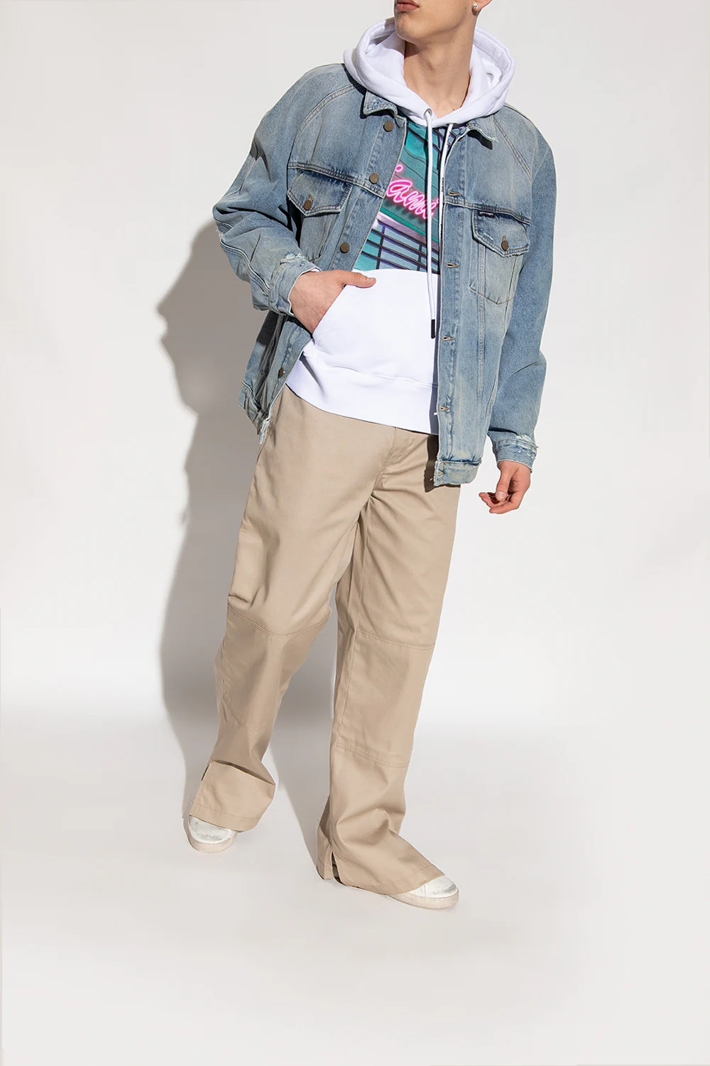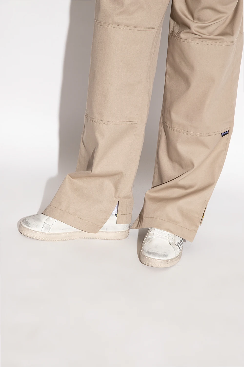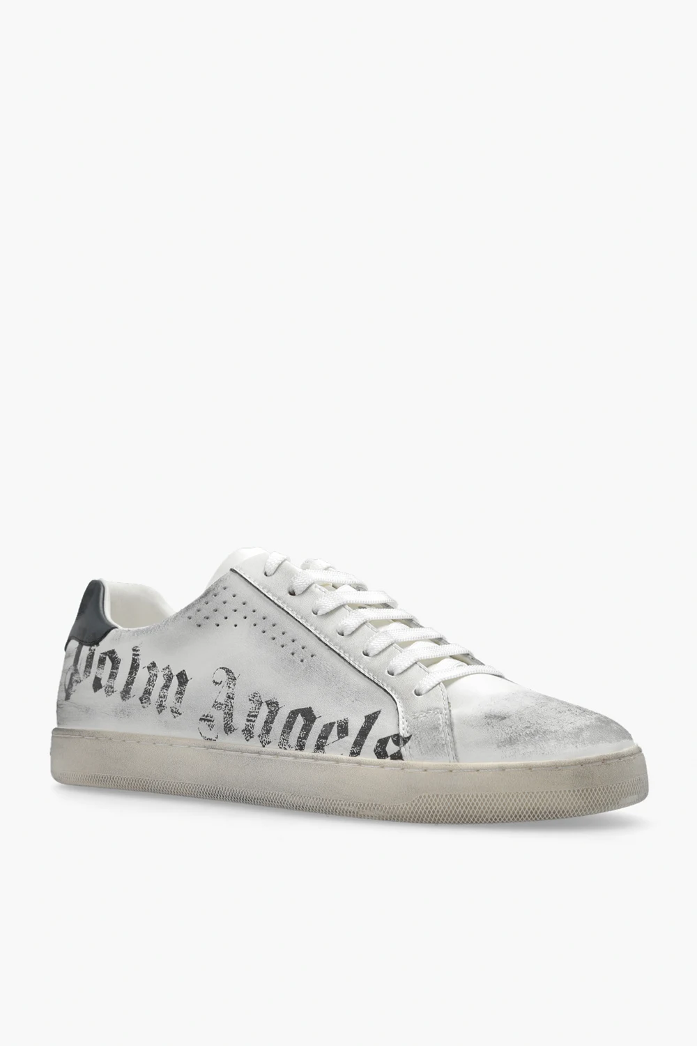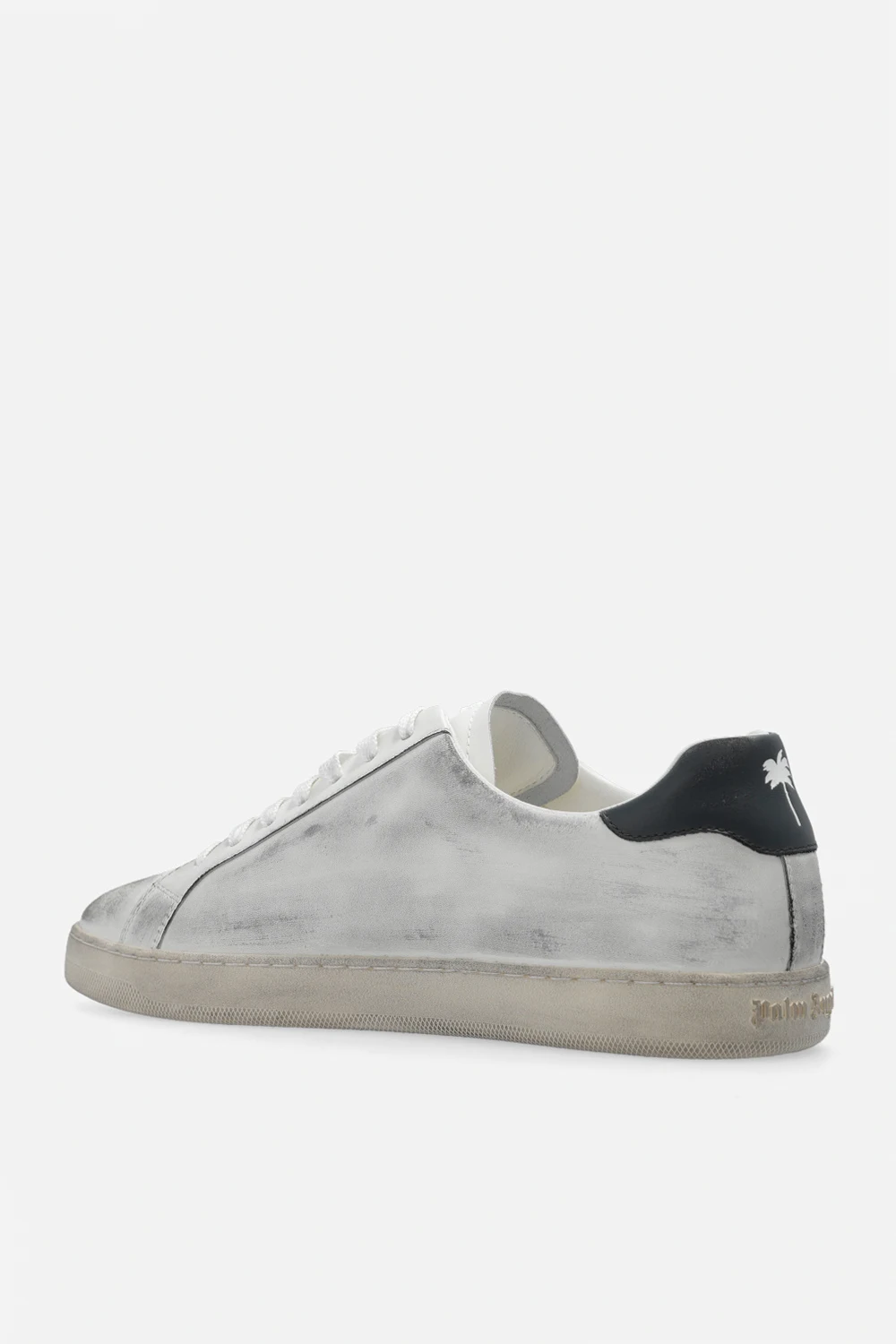 White and dark grey sneakers from Palm Angels. Made of leather, this lace-up pair features a vintage effect, logo print and light grey rubber sole. Comes with a pair of swappable shoelaces.