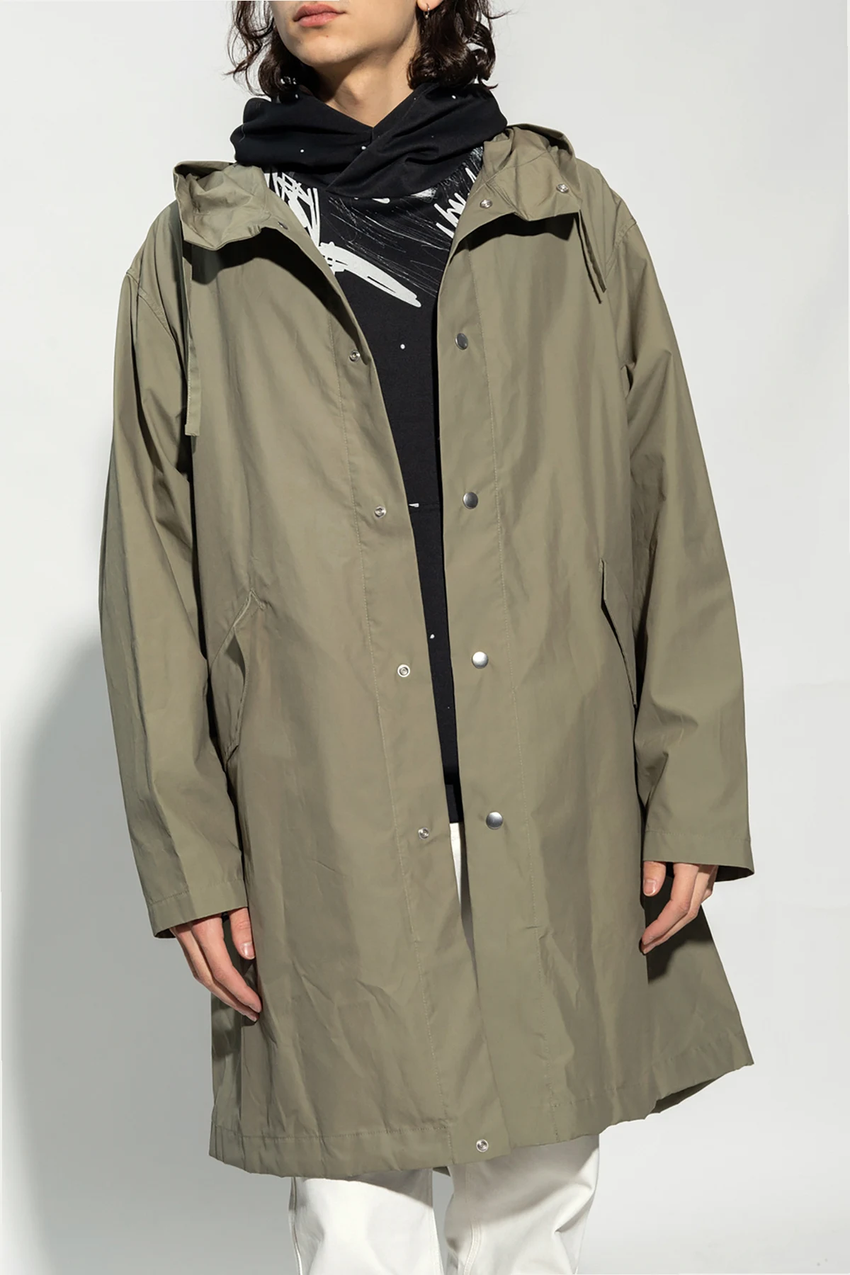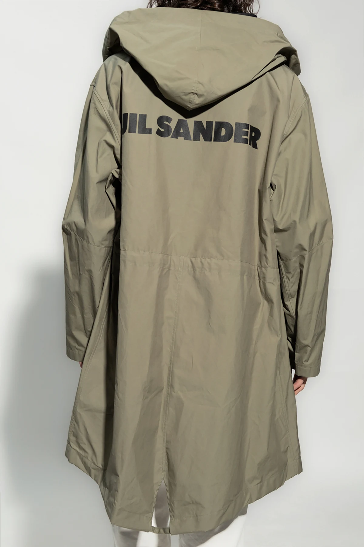 Green coat from JIL SANDER. Crafted from cotton, this style fastens with snaps and features a drawcord-adjustable hood, two flapped pockets and long sleeves.
