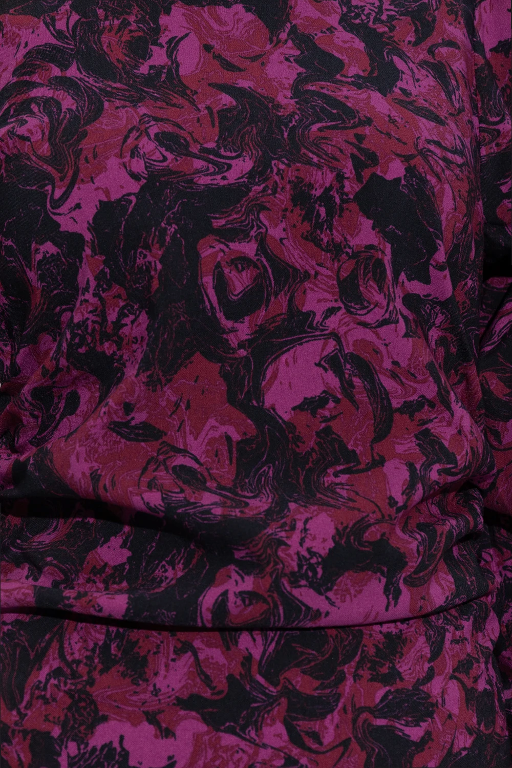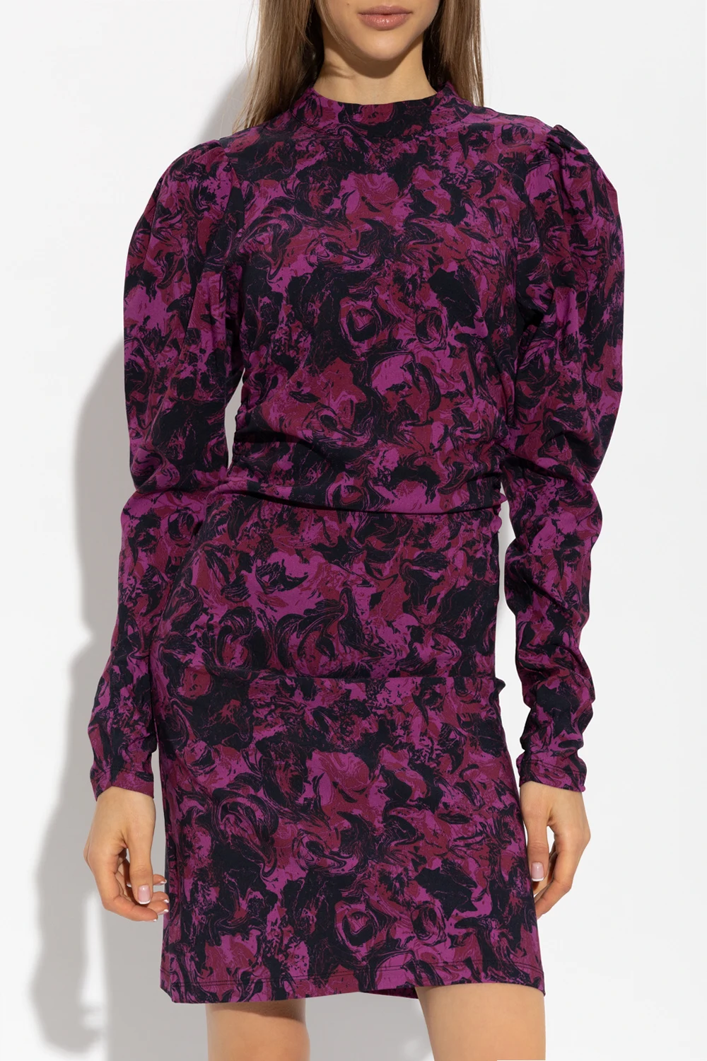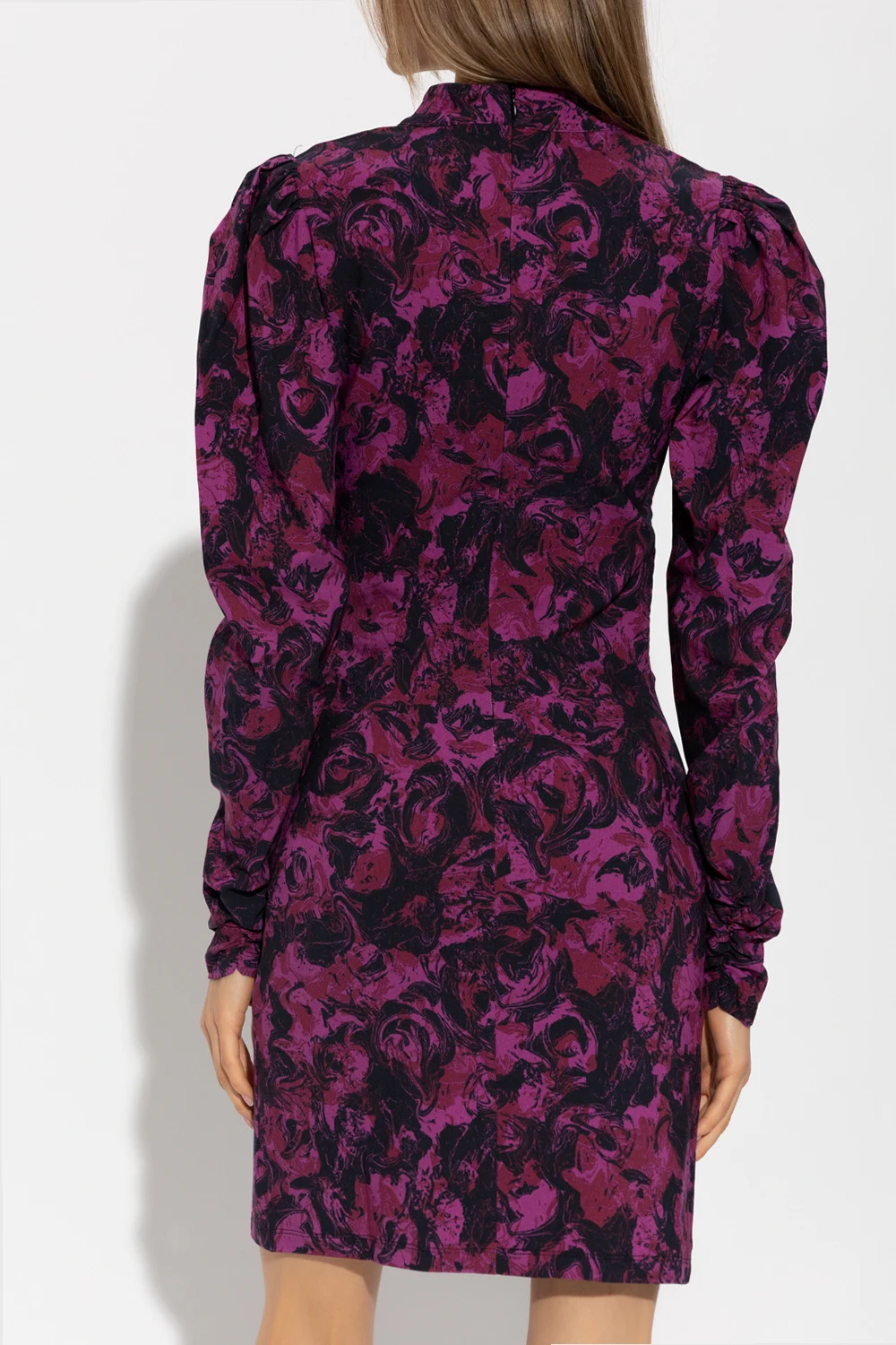 Black, pink and purple ‘RavaGZ’ mini dress from Gestuz. Crafted in part from ECOVERO™, this style features a form-fitting silhouette, a decorative graphic pattern, a hidden zip at the back, a mock neck, puff long sleeves and decorative gathers on the sides.