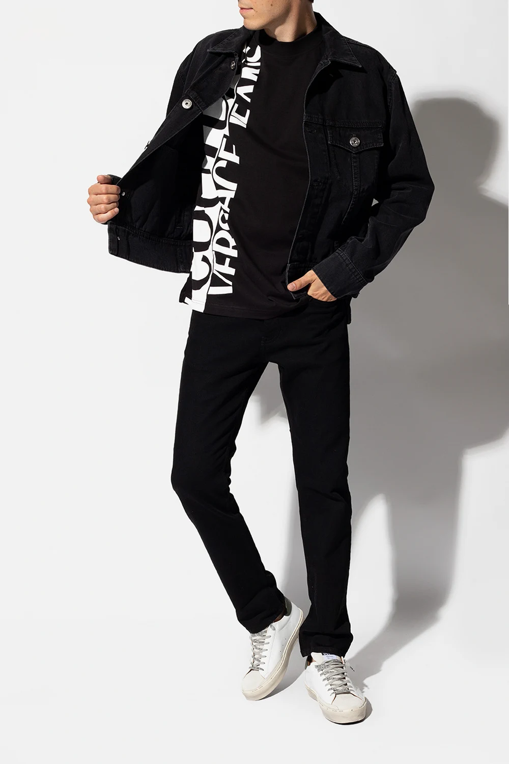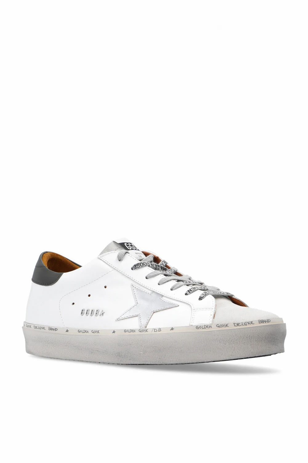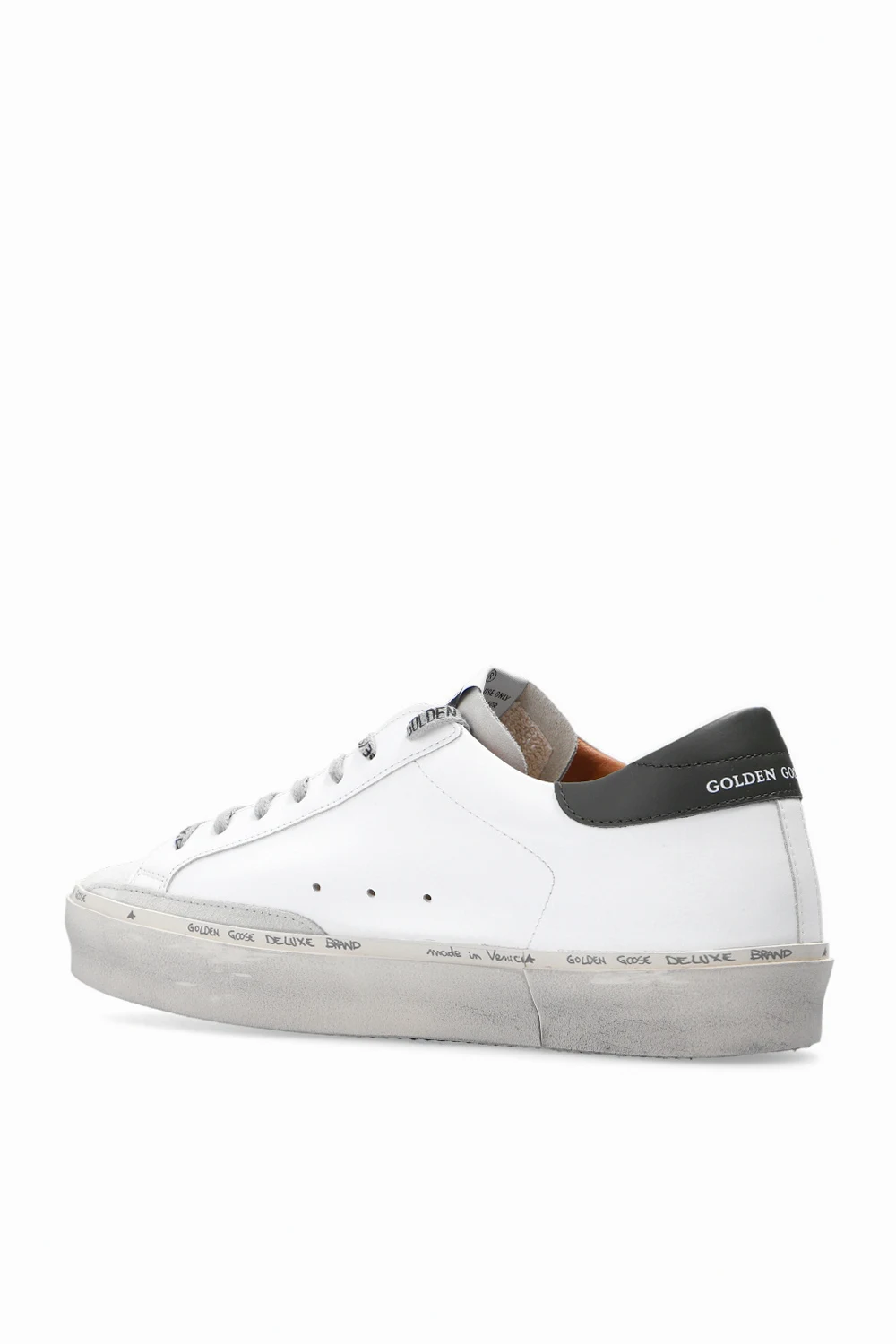 White ‘Hi Star Classic’ sneakers from Golden Goose. Crafted from leather, this lace-up model sits on a cream and black rubber sole and showcases a dark green heel counter with a printed white logo and deliberate distressed effects throughout.