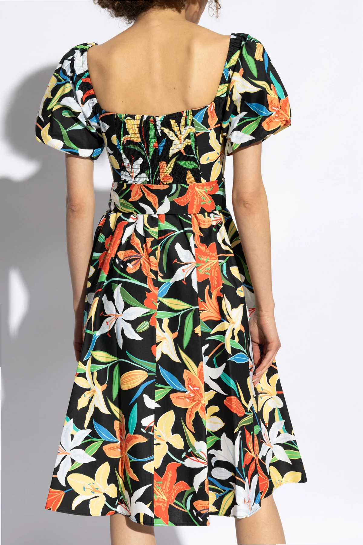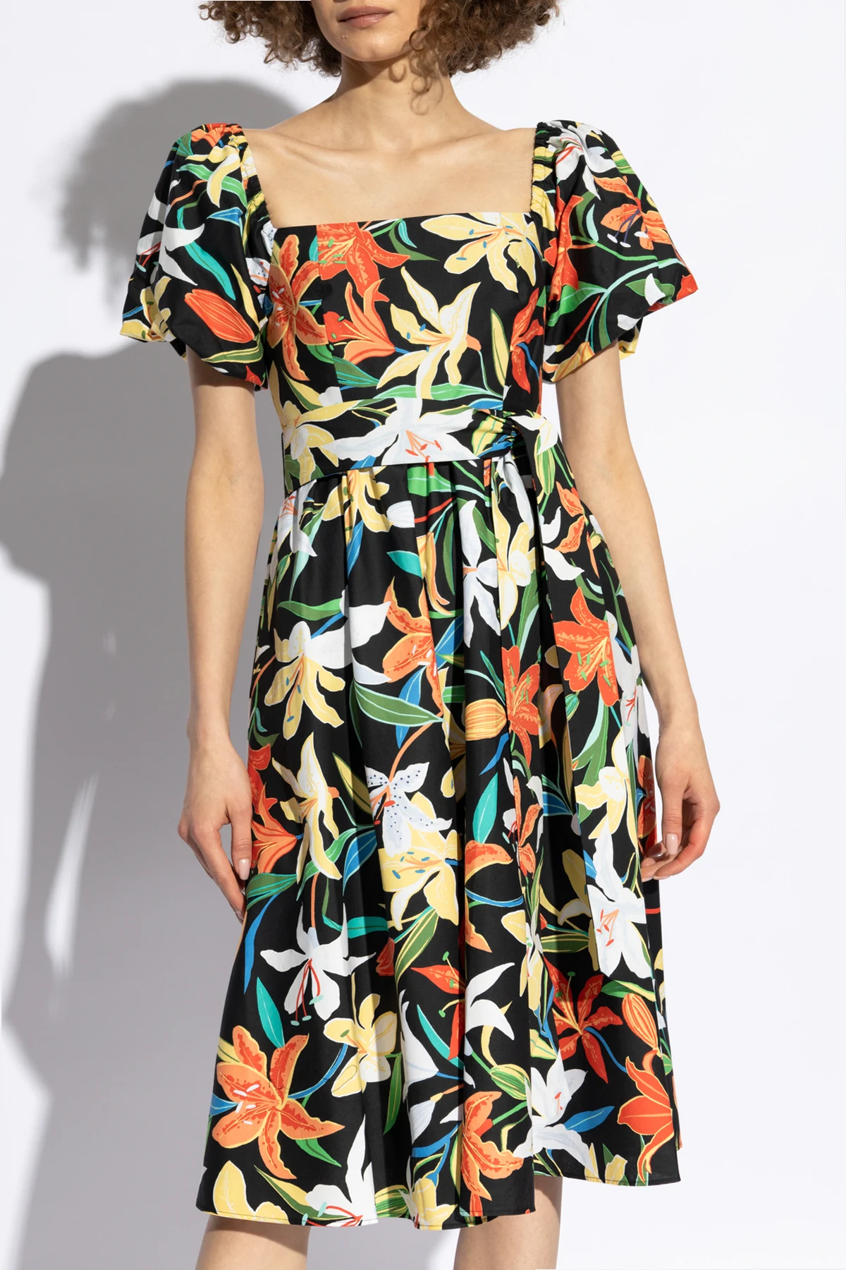 Wir präsentieren Ihnen die Quintessenz floraler Eleganz - Sukienka z motywem kwiatowym von der renommierten Designerin Kate Spade . Diese außergewöhnliche Kreation besticht durch eine Vielfalt an Farbnuancen auf schwarzem Grund und erschafft eine hypnotisierende Multicolor-Komposition, gefüllt mit großen, bunten Blumen. Das dynamische Muster verleiht ihr einen ausdrucksstarken Charakter, der sich perfekt für jede Gelegenheit eignet.