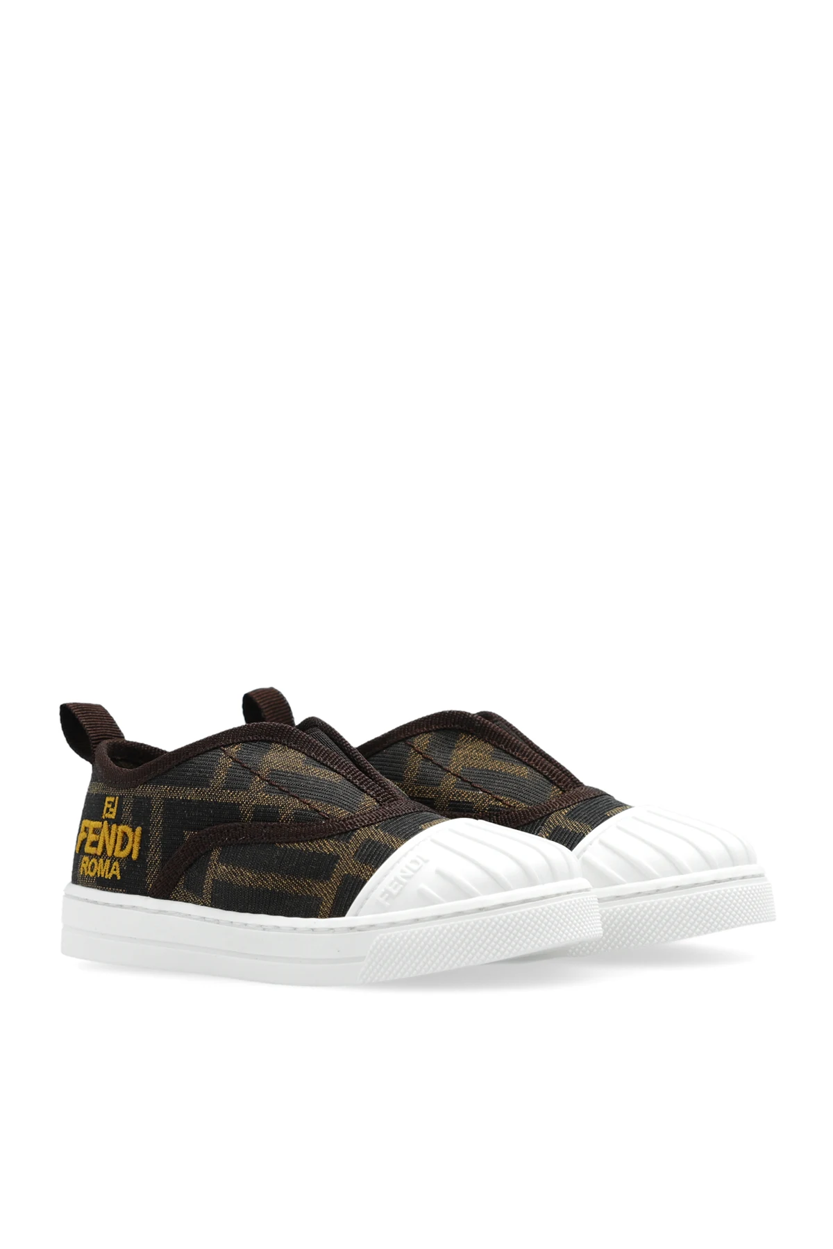 Brown and beige sneakers from Fendi Kids. Made from monogrammed fabric with a slip-on silhouette, this model sits on a white rubber sole and showcases an embroidered yellow logo on the side, an elasticized strap on the front and a rubberised round toe.