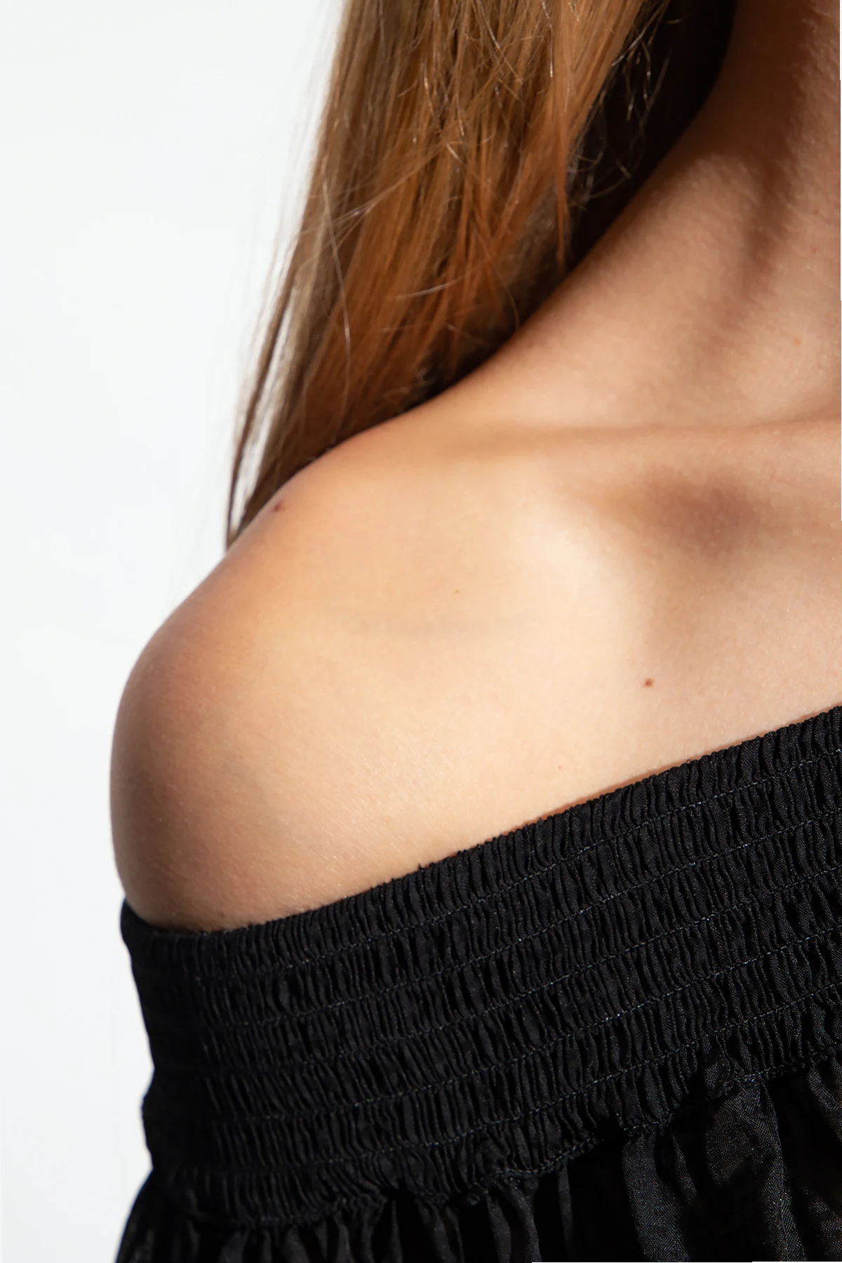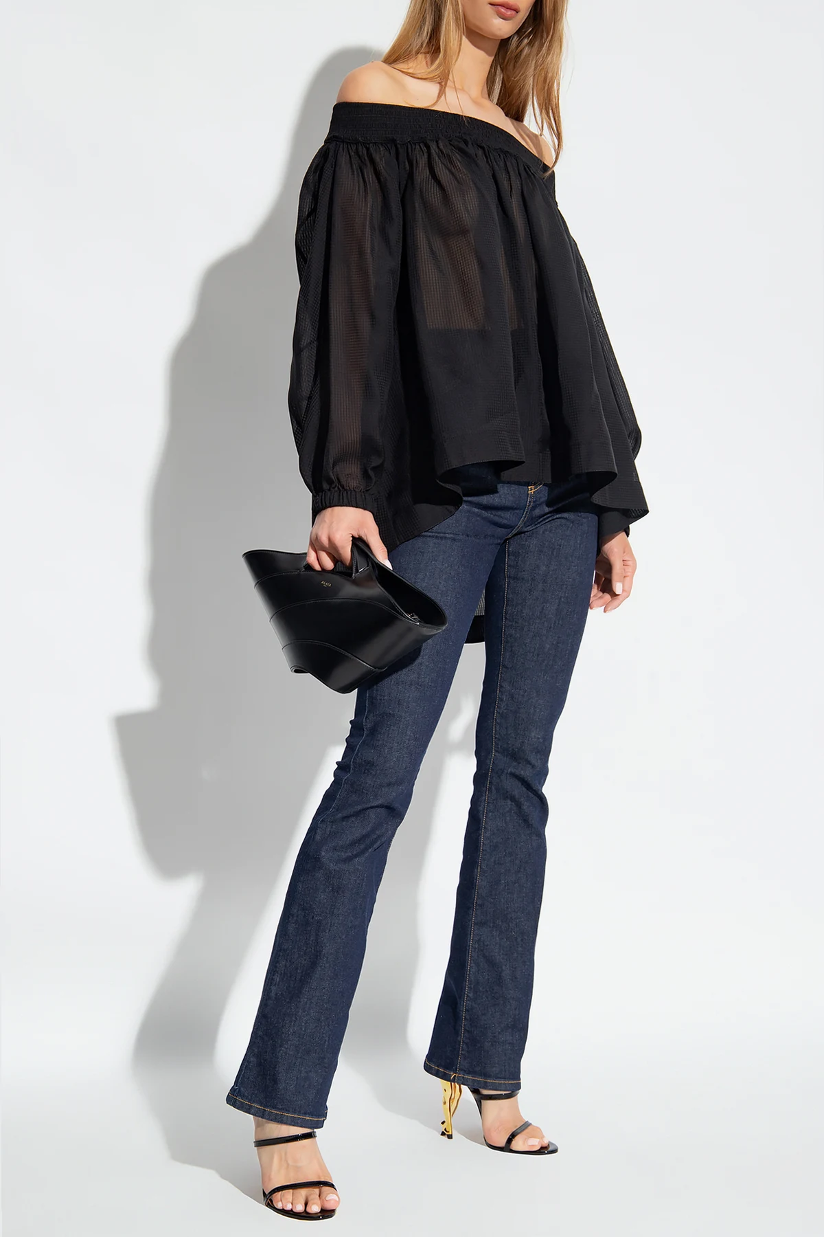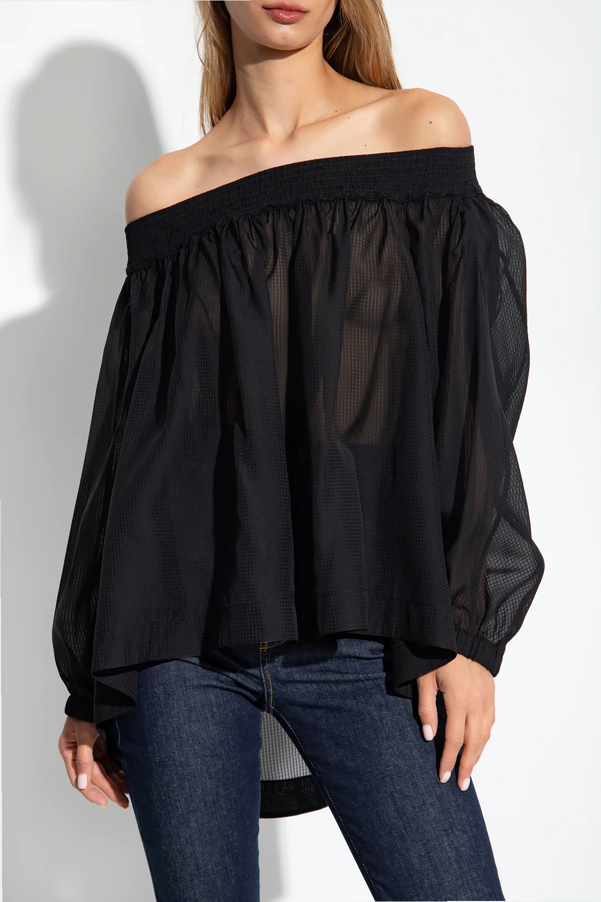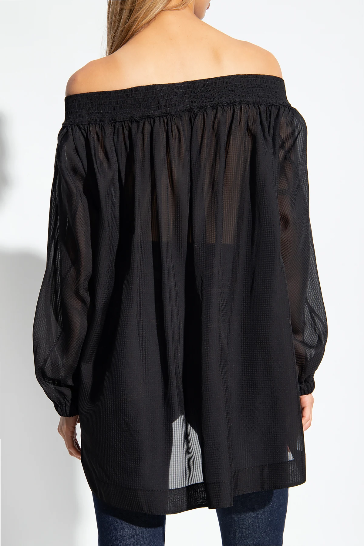 Black sheer top from Alaia. Made of silk blend fabric with a tone-on-tone check pattern, this design features a loose boat neck and puff sleeves with elasticated cuffs.