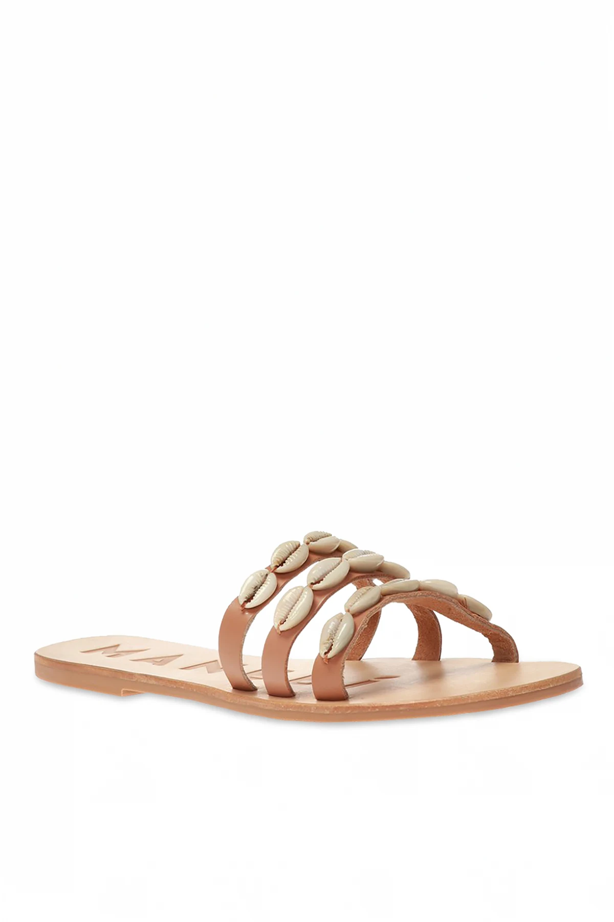 Brown 'Ibiza' slides from Manebi. Made of leather. Decorated with a shell applique. Brown rubber sole.