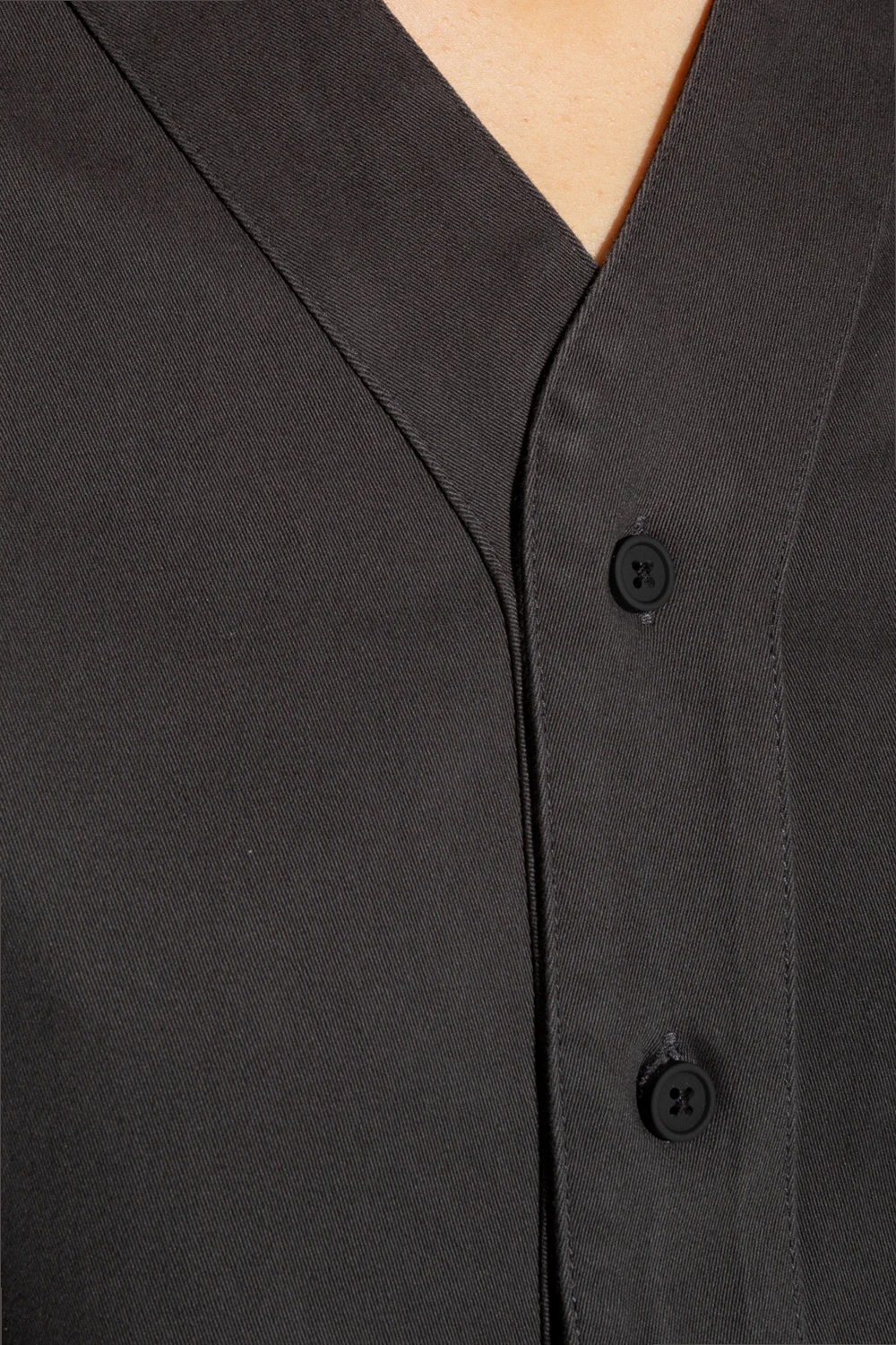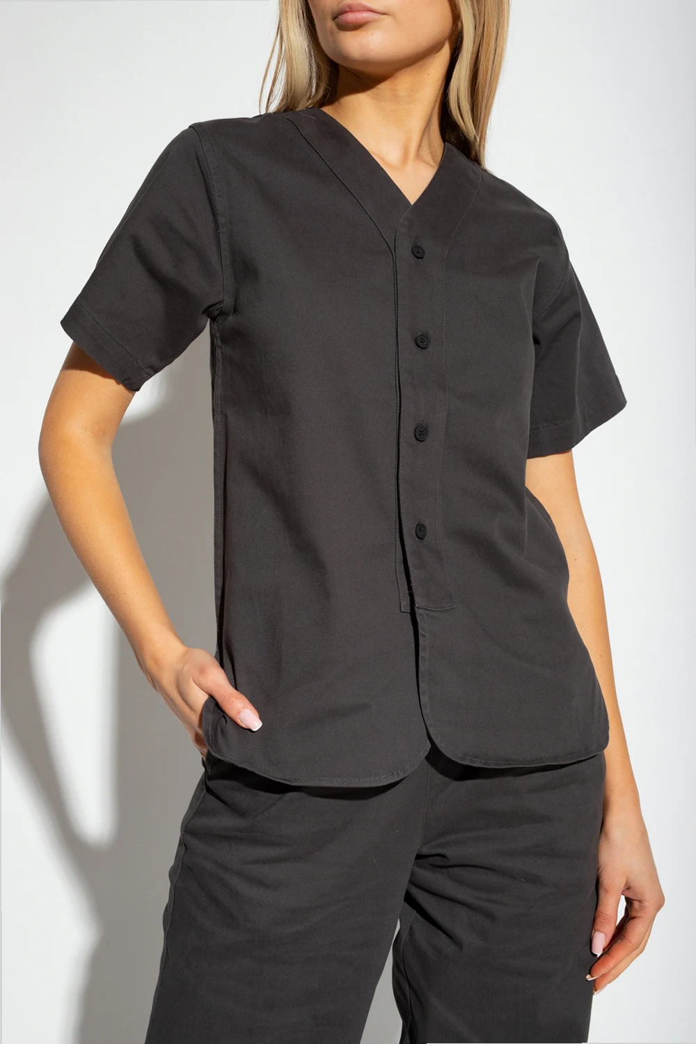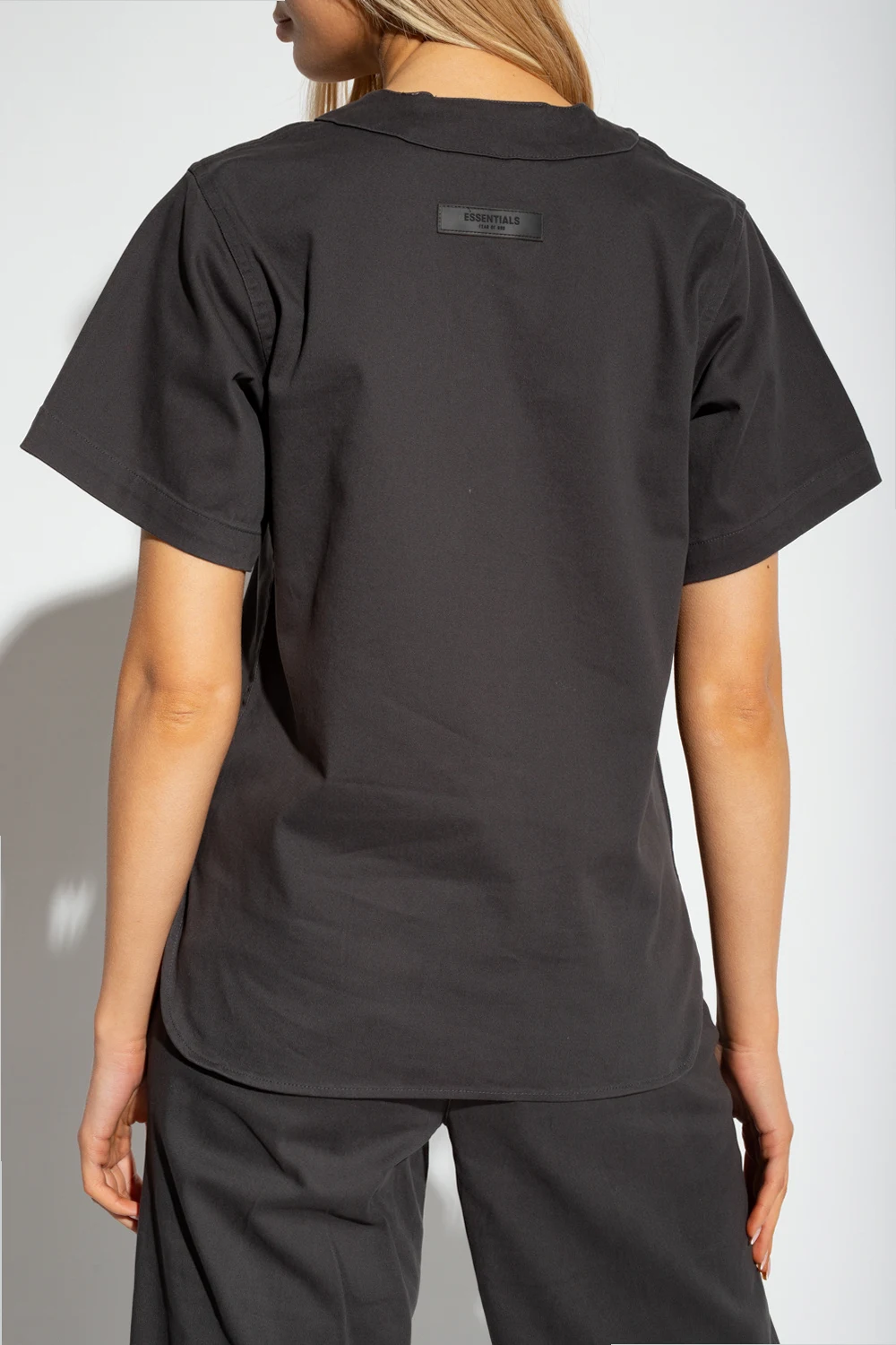 Dark grey top from FEAR OF GOD ESSENTIALS. Made of cotton, this style features a V-neckline, button fastenings, short sleeves and side slits.