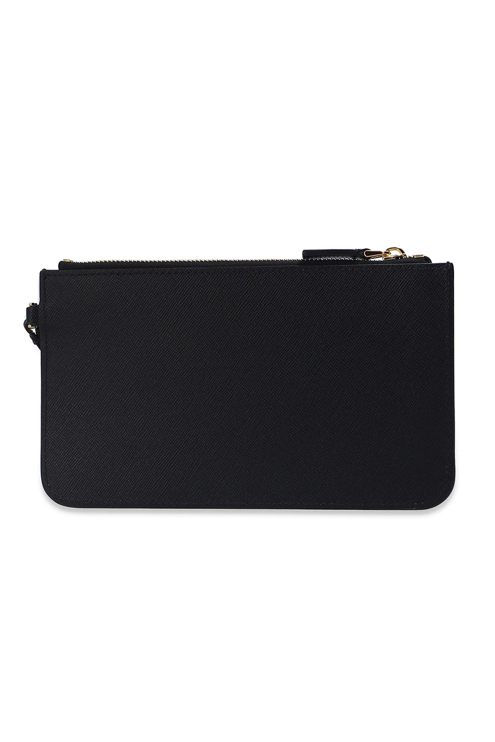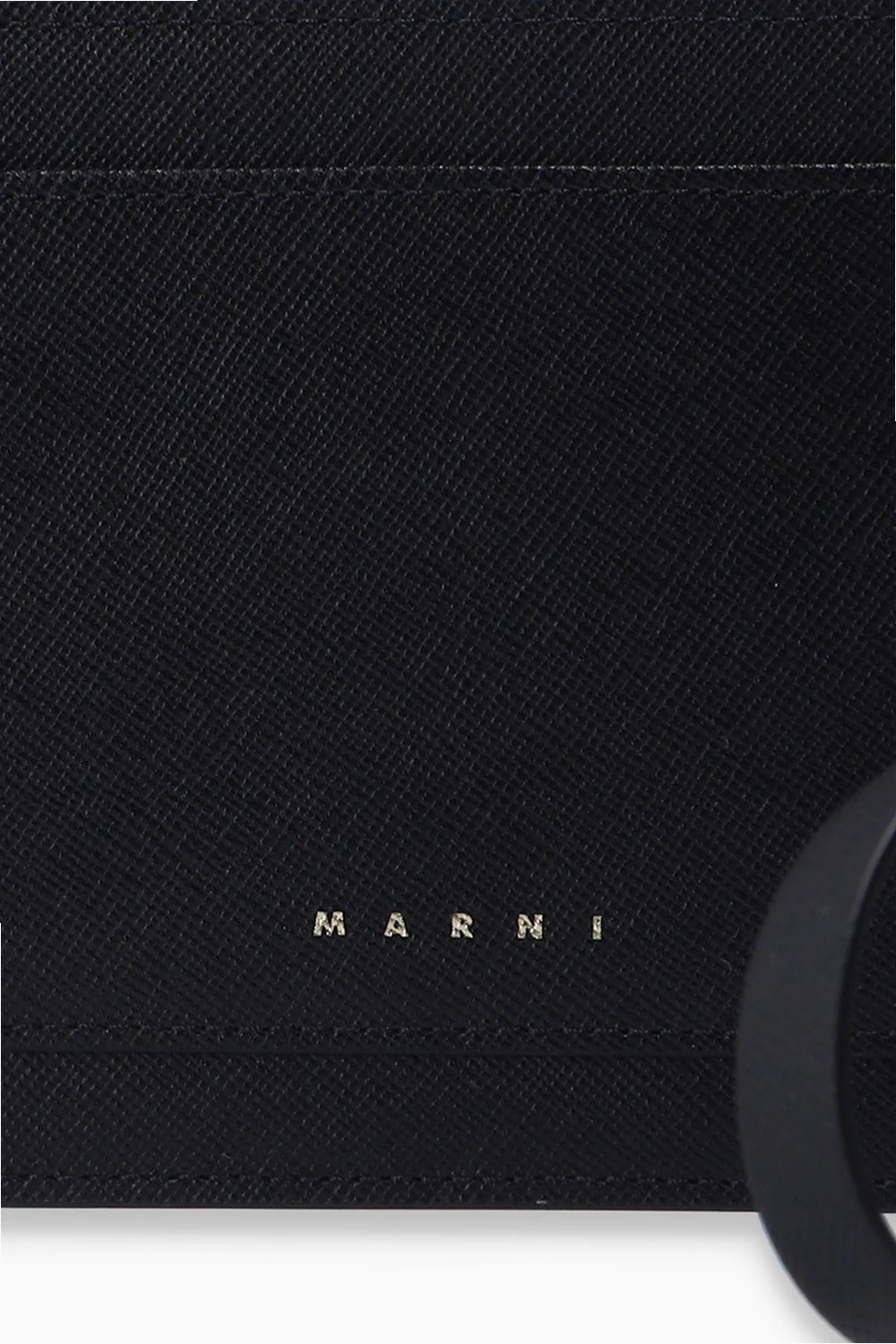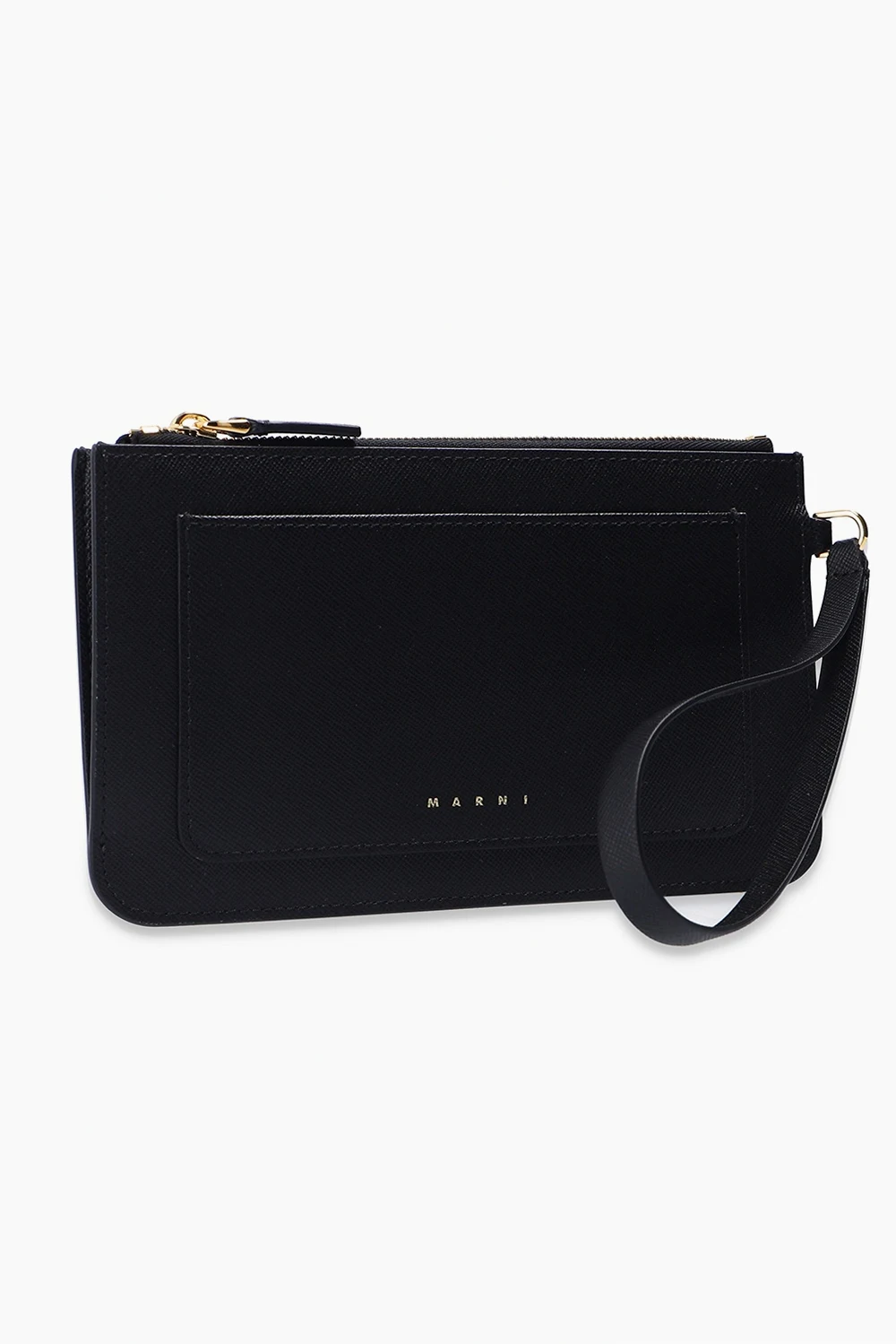 Black wallet from Marni. Crafted from saffiano calf leather, this design features a zip fastening, front slip pocket, leather wrist strap, embossed logo and metal hardware in gold-tone. The interior in lined with beige cotton and includes three card slots.