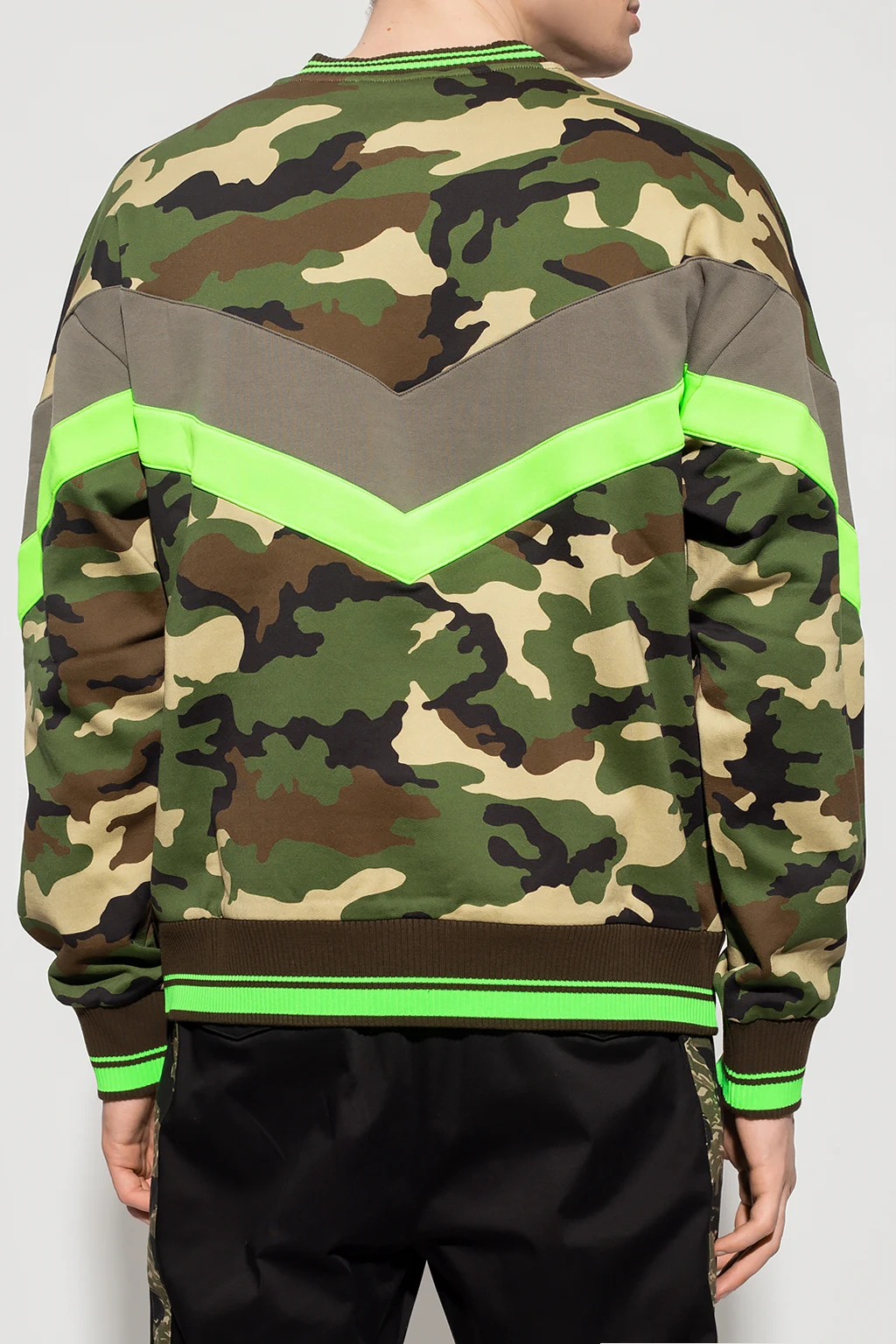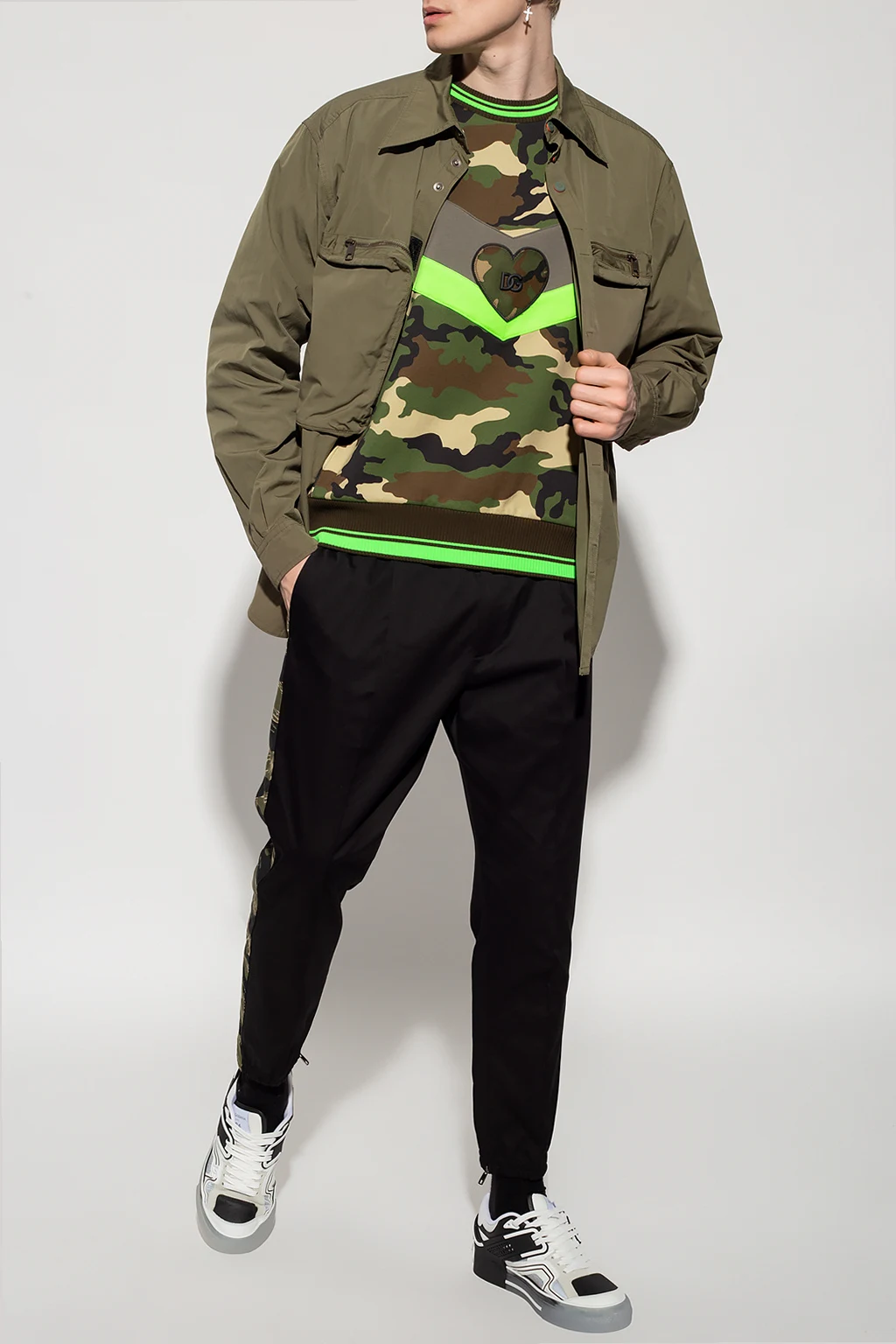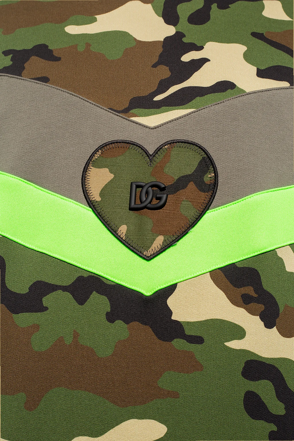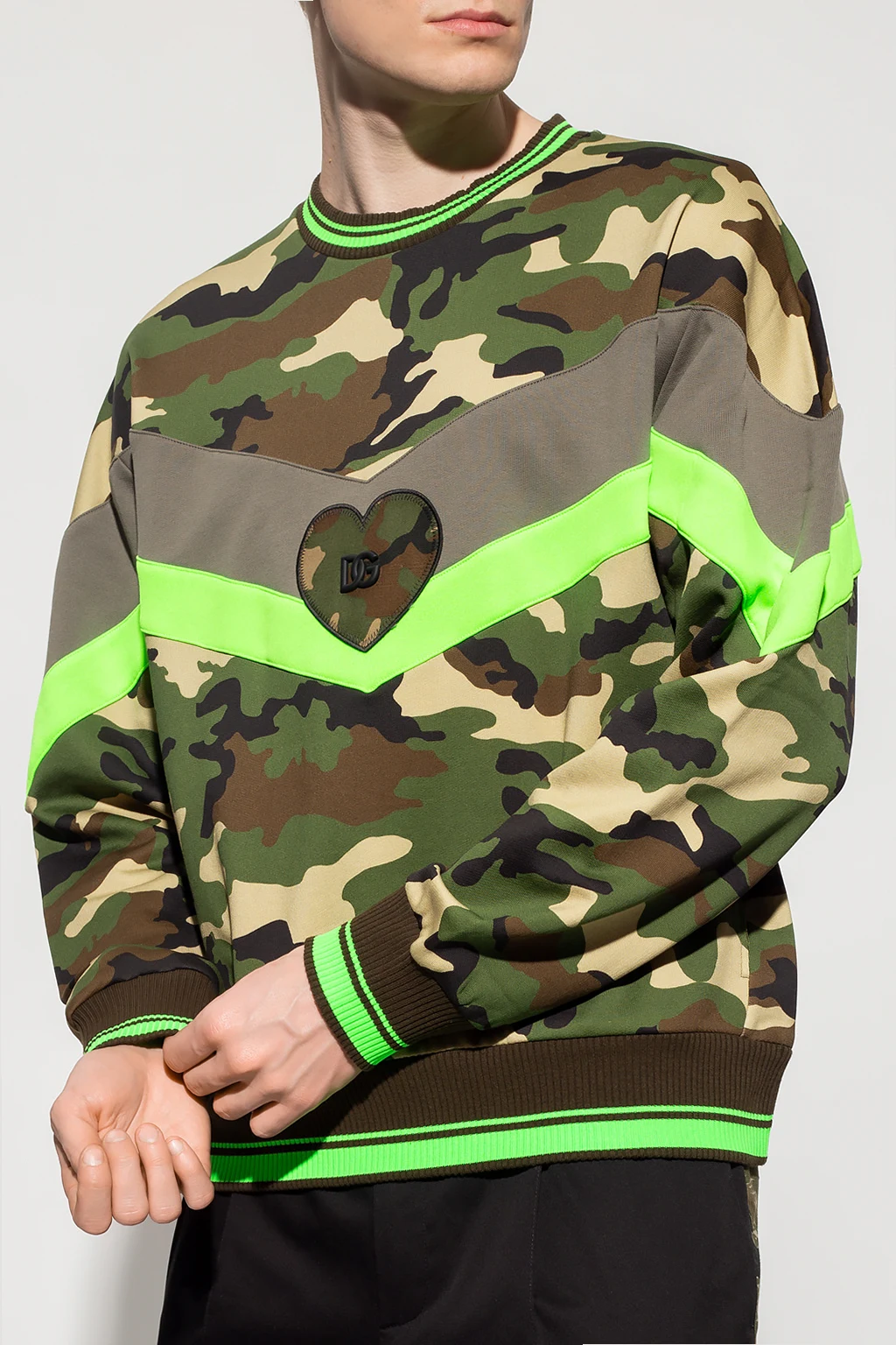 Khaki, black and brown crewneck sweatshirt from Dolce & Gabbana, the ‘Reborn to Live’ collection. Crafted from cotton jersey, and decorated with a camo pattern, this style showcases sewn grey and neon green stripes, a heart patch with a raised logo appliqué, a kangaroo pocket and sporty-inspired elasticated trims on the bottom hem and cuffs.