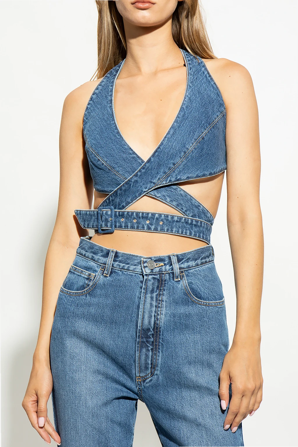 Blue denim tank top from Alaia. This V-neck design features an adjustable decorative buckle strap.