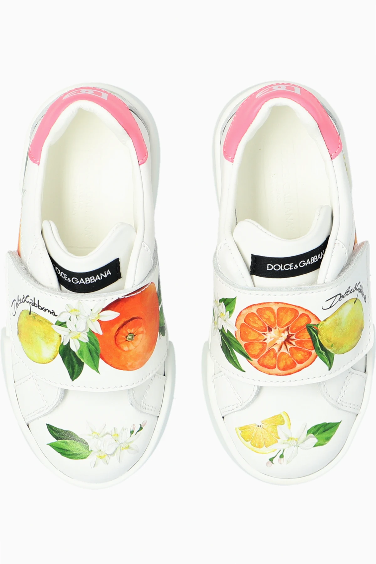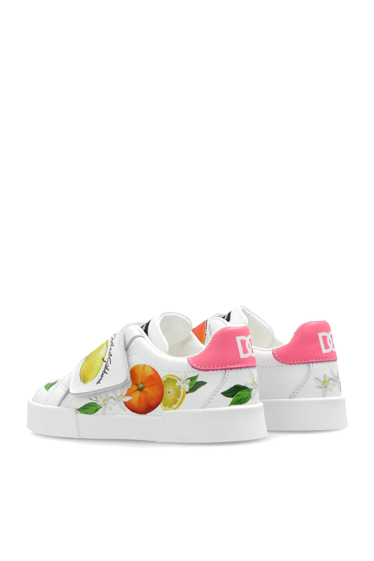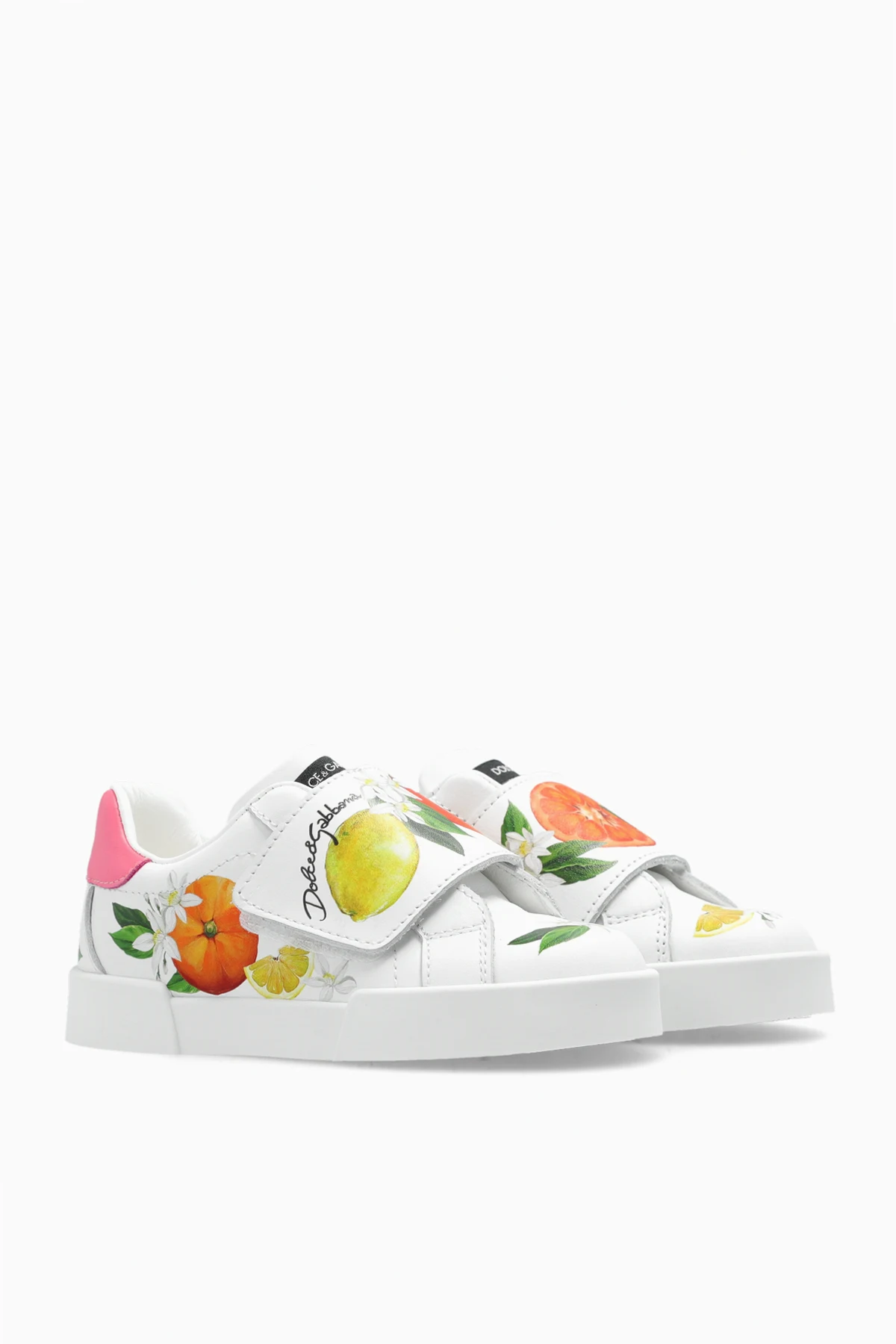 White sneakers from Dolce & Gabbana Kids. Made from leather, this model sits on a white rubber sole and showcases a colourful motif of fruits, logo detailing, velcro closure and a pink heel counter with a logo.